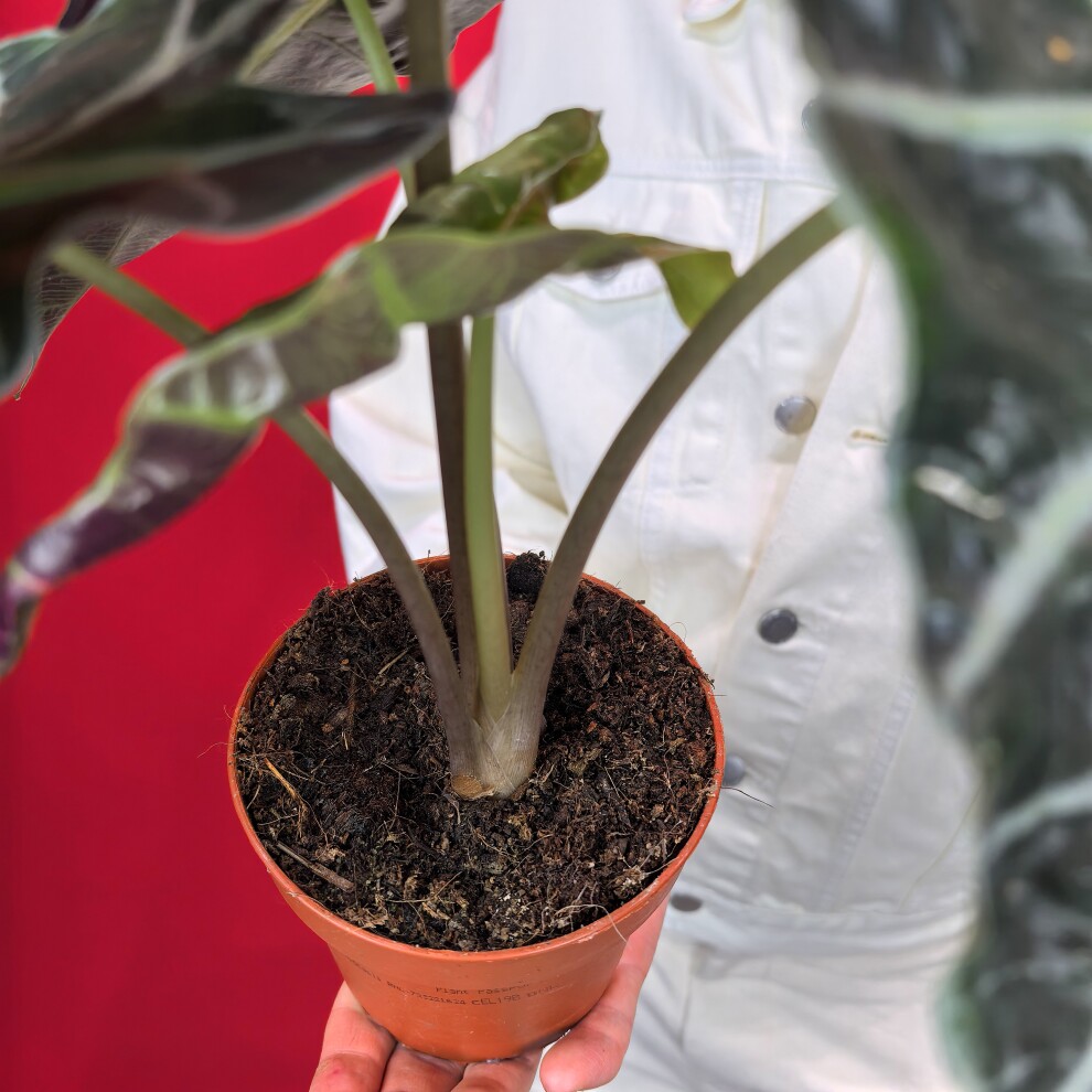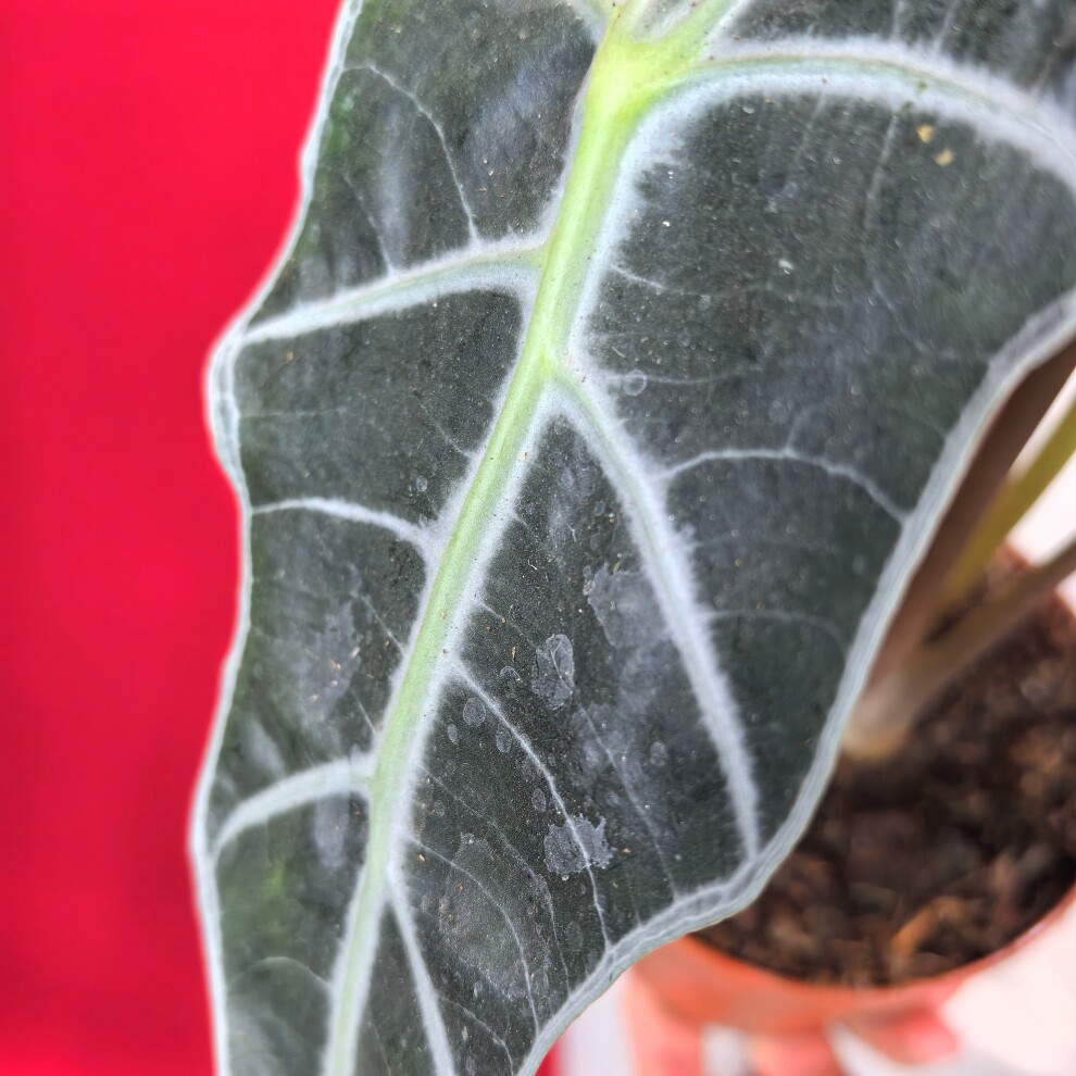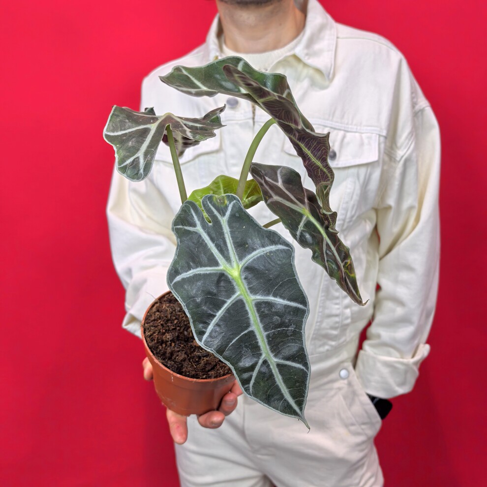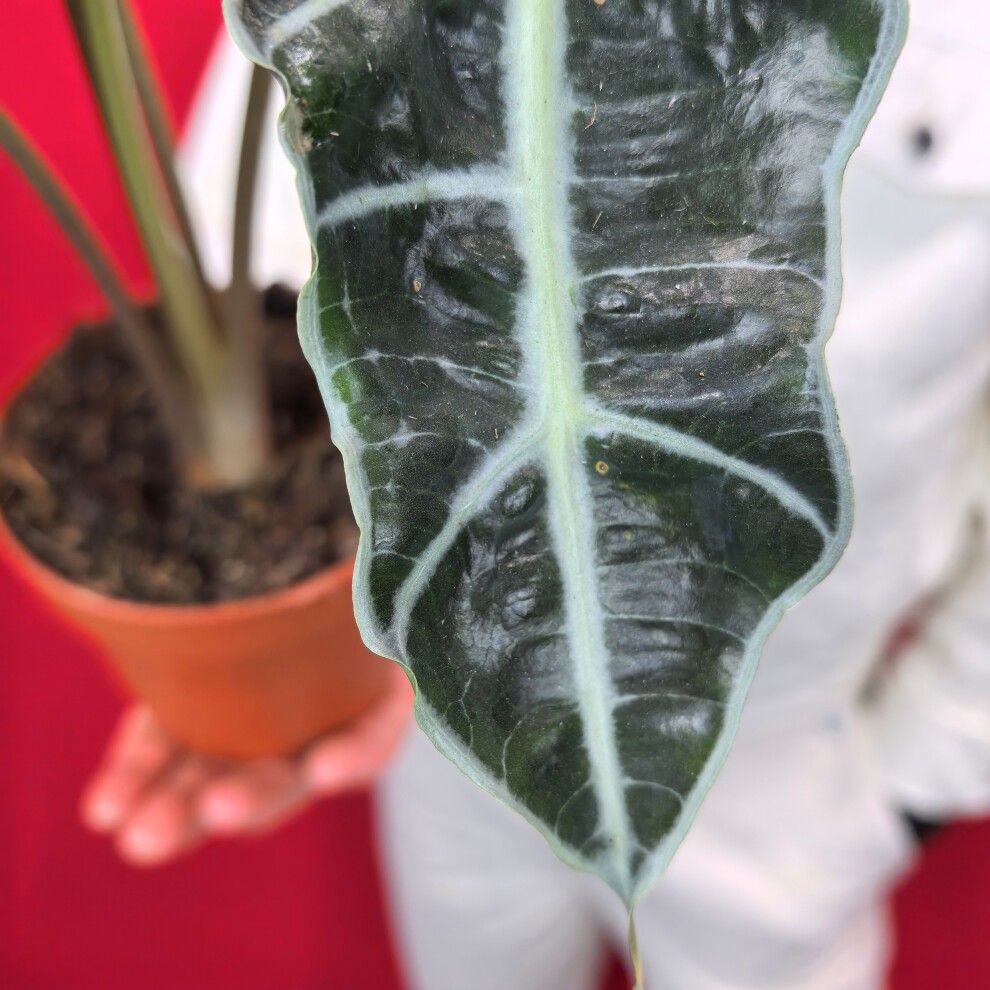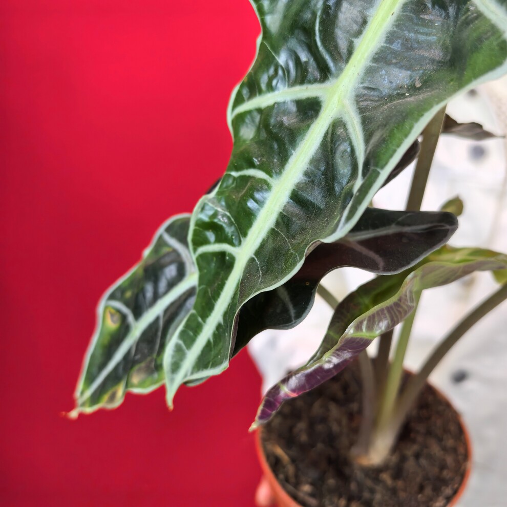 Алоказия — это эффектное декоративно-лиственное растение, которое привлекает внимание своими крупными листьями с яркими прожилками.