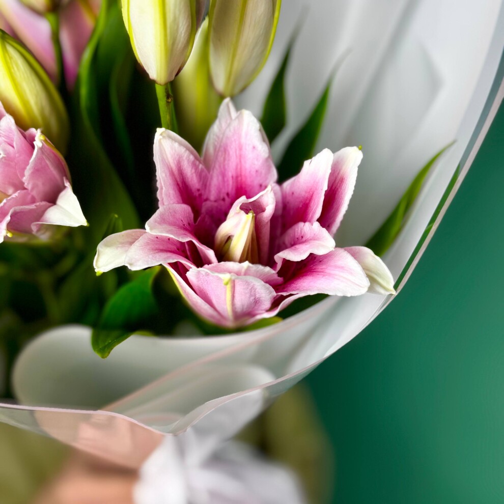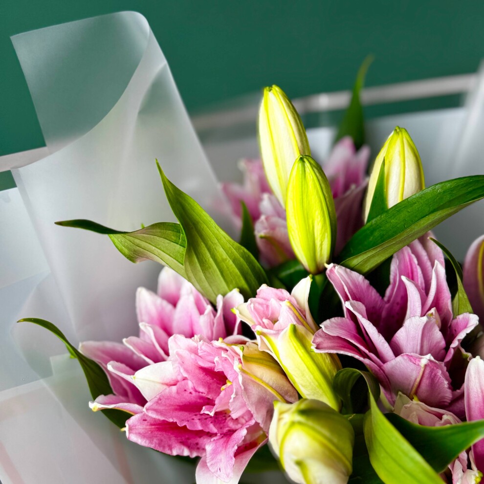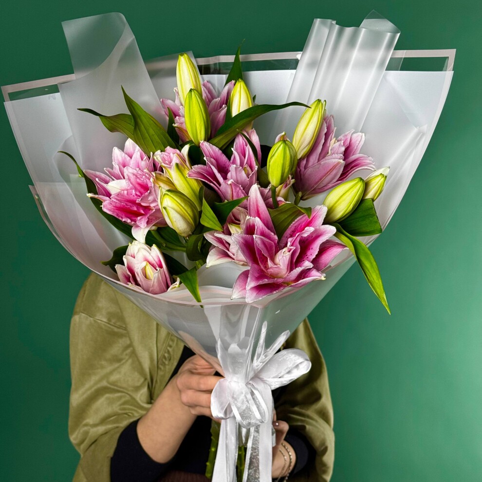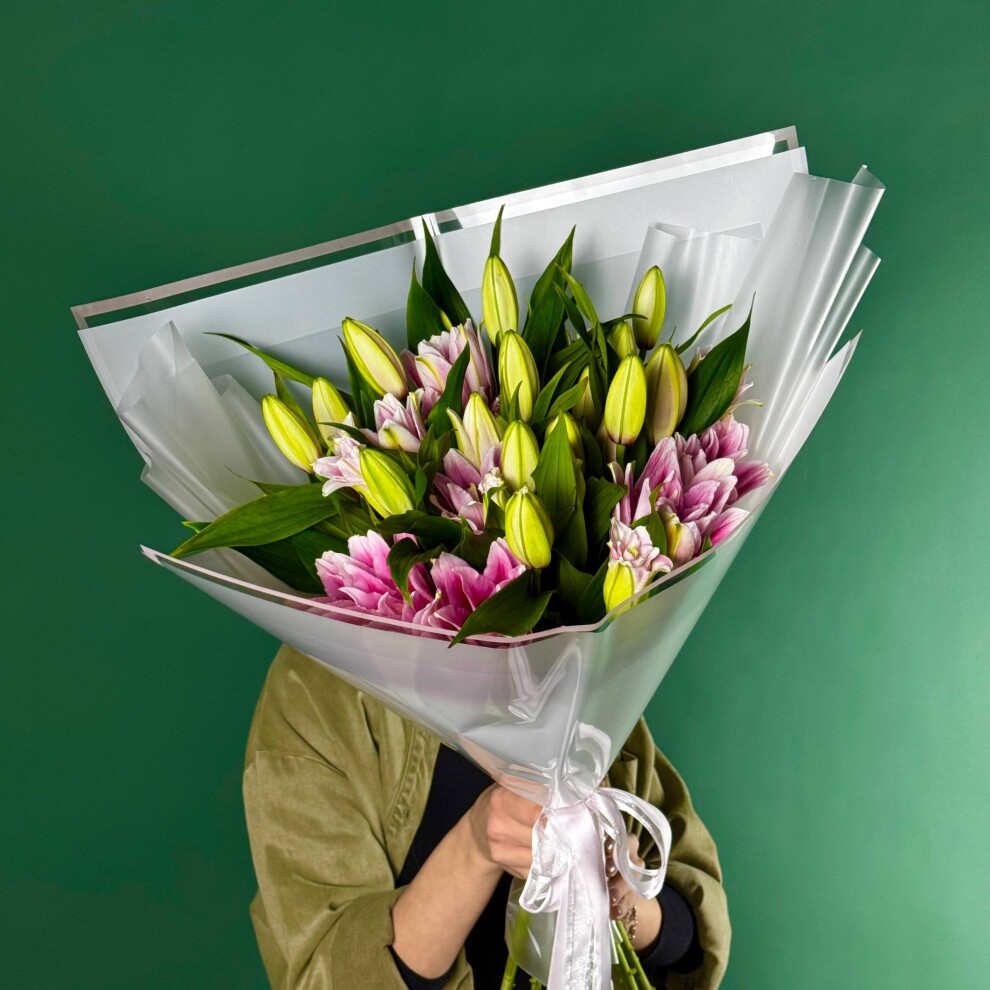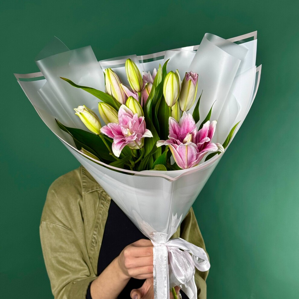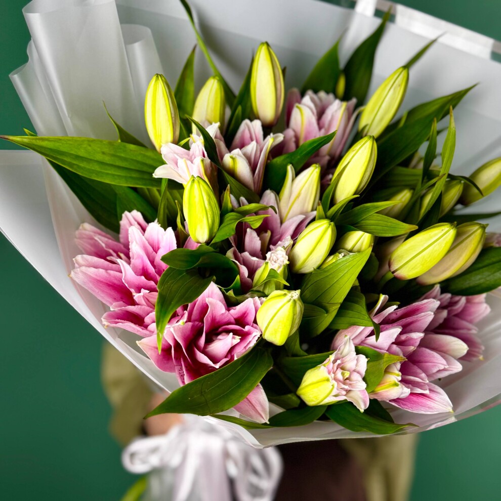 Этот букет — истинное воплощение нежности и элегантности. В центре композиции грациозно расположились розовые лилии, чьи лепестки, словно акварельные мазки, переливаются мягкими оттенками розового, создавая ощущение лёгкости и утончённости. Их изысканный цвет гармонично сочетается с сочными зелёными бутонами, которые добавляют букету свежести и динамики, будто запечатлевая момент пробуждения природы.