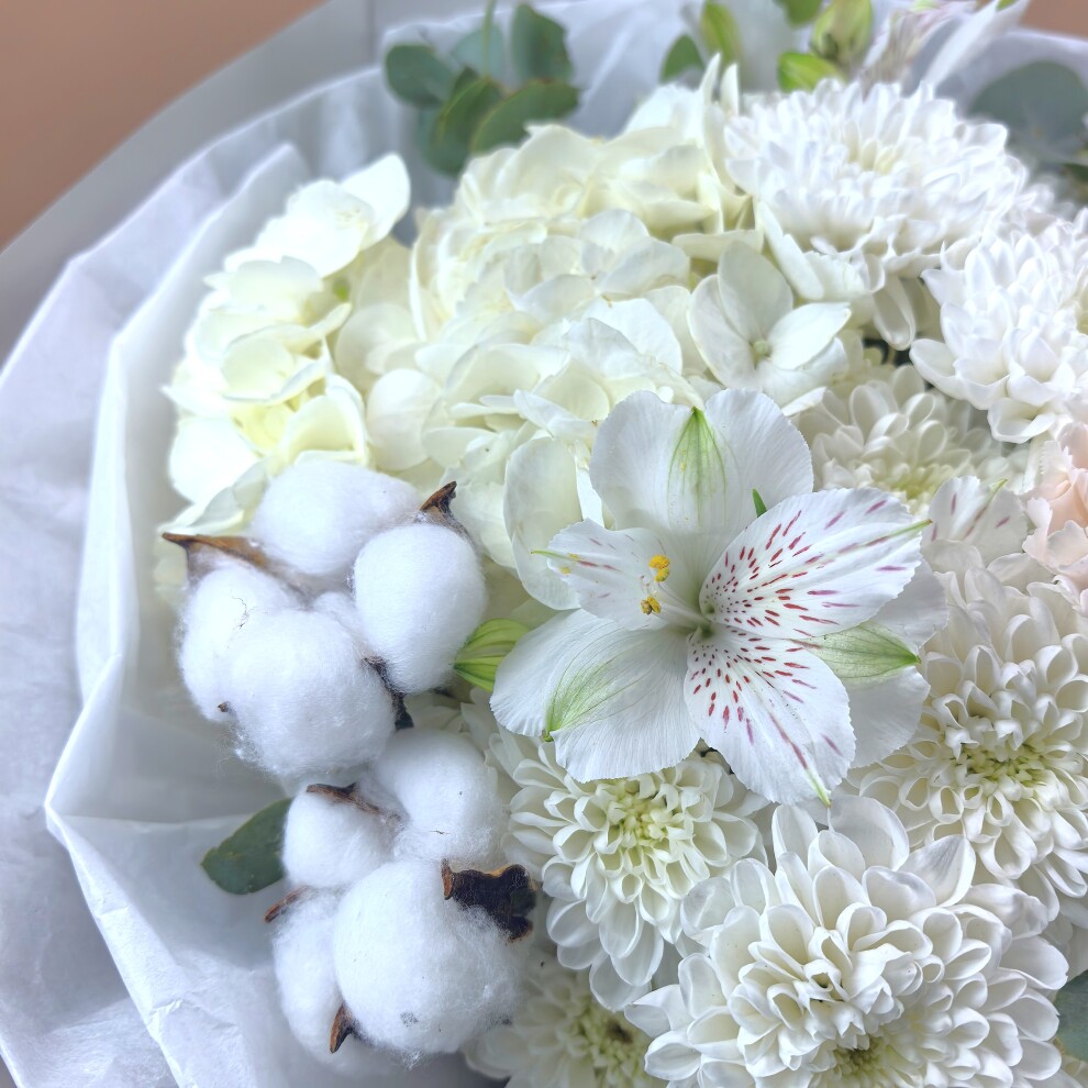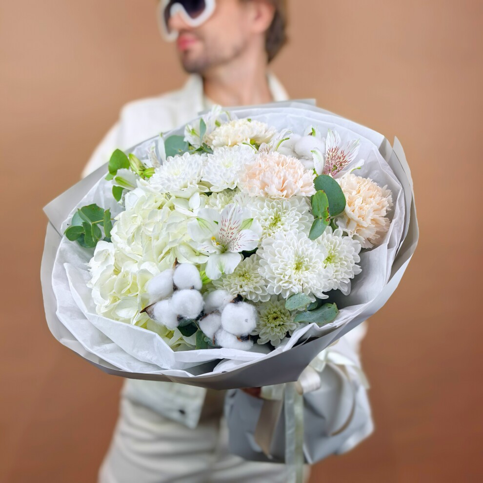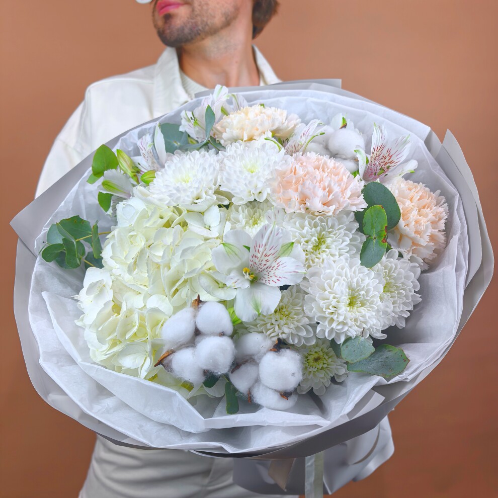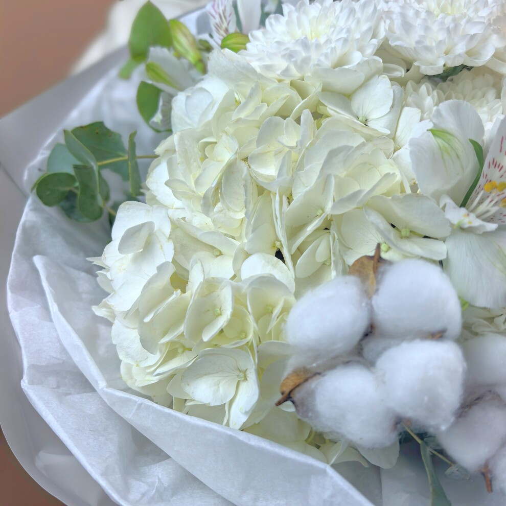 - Хризантема кустовая, Альстромерия, Эвкалипт, Гвоздика, Гортензия, Хлопок