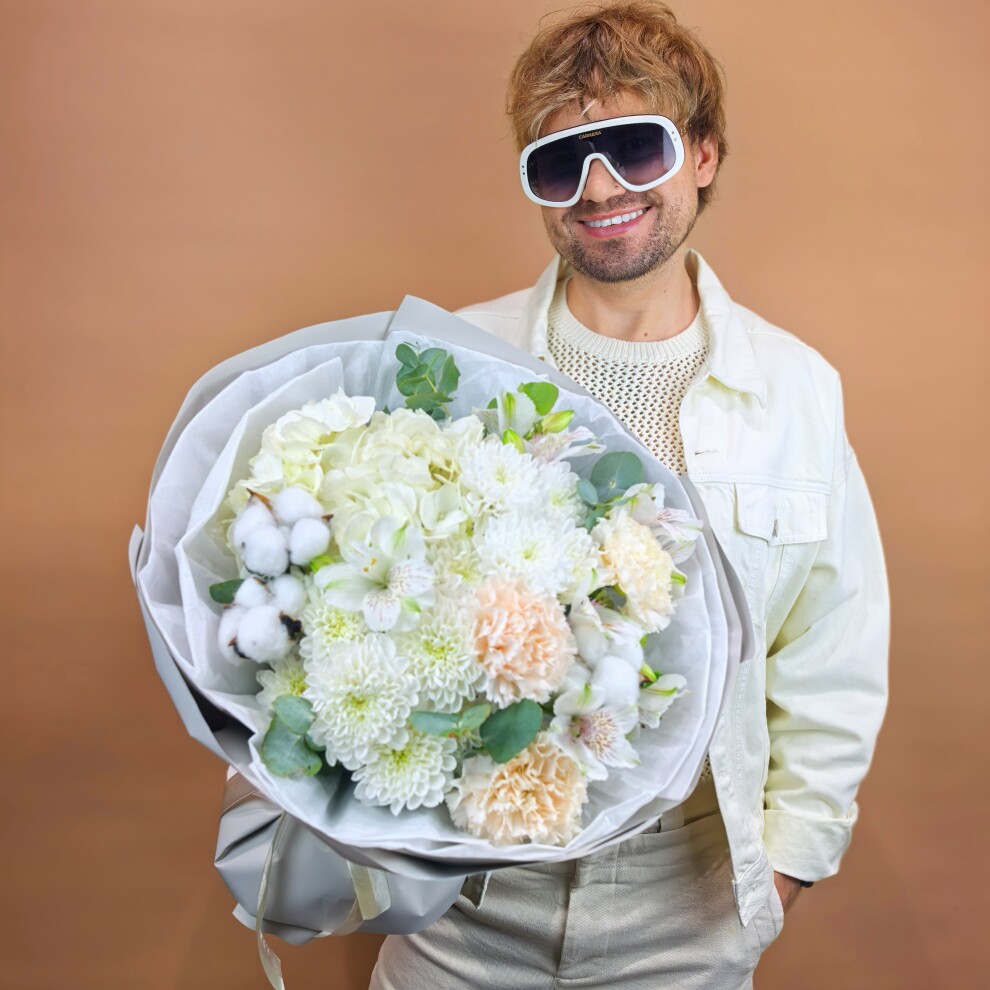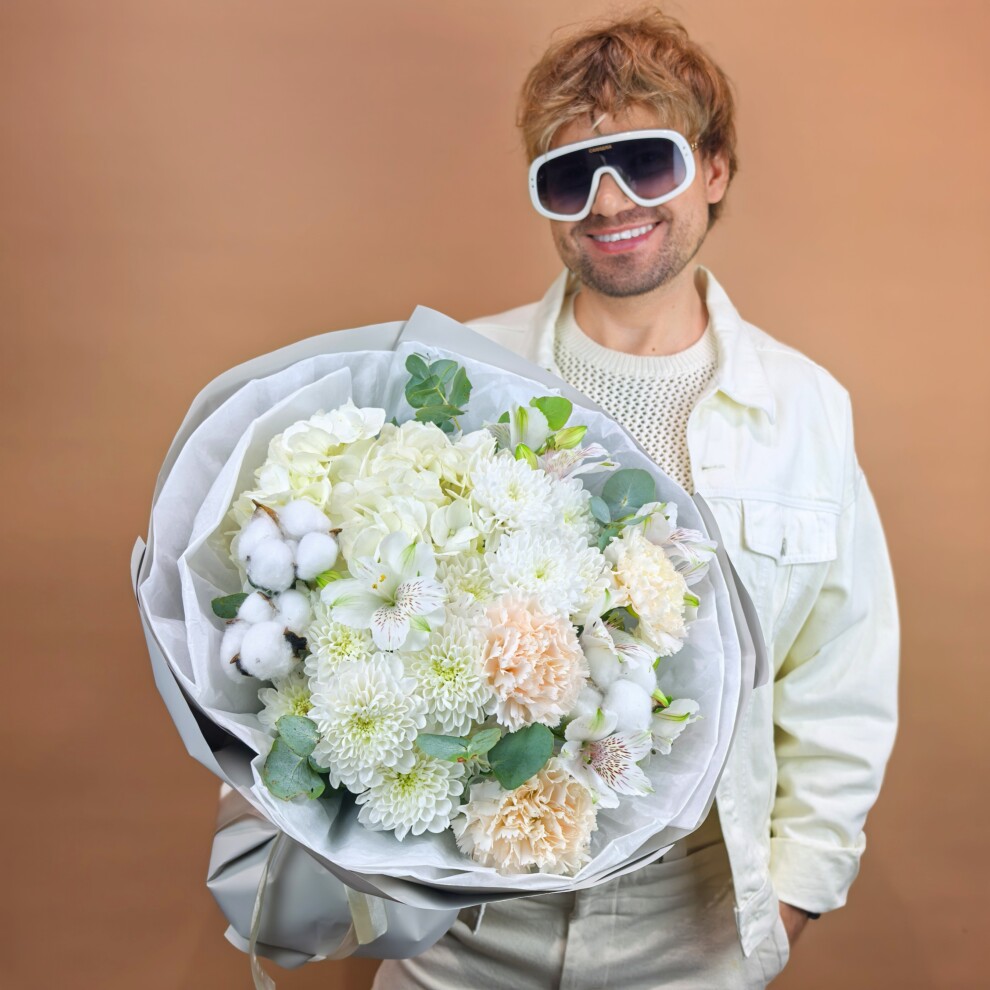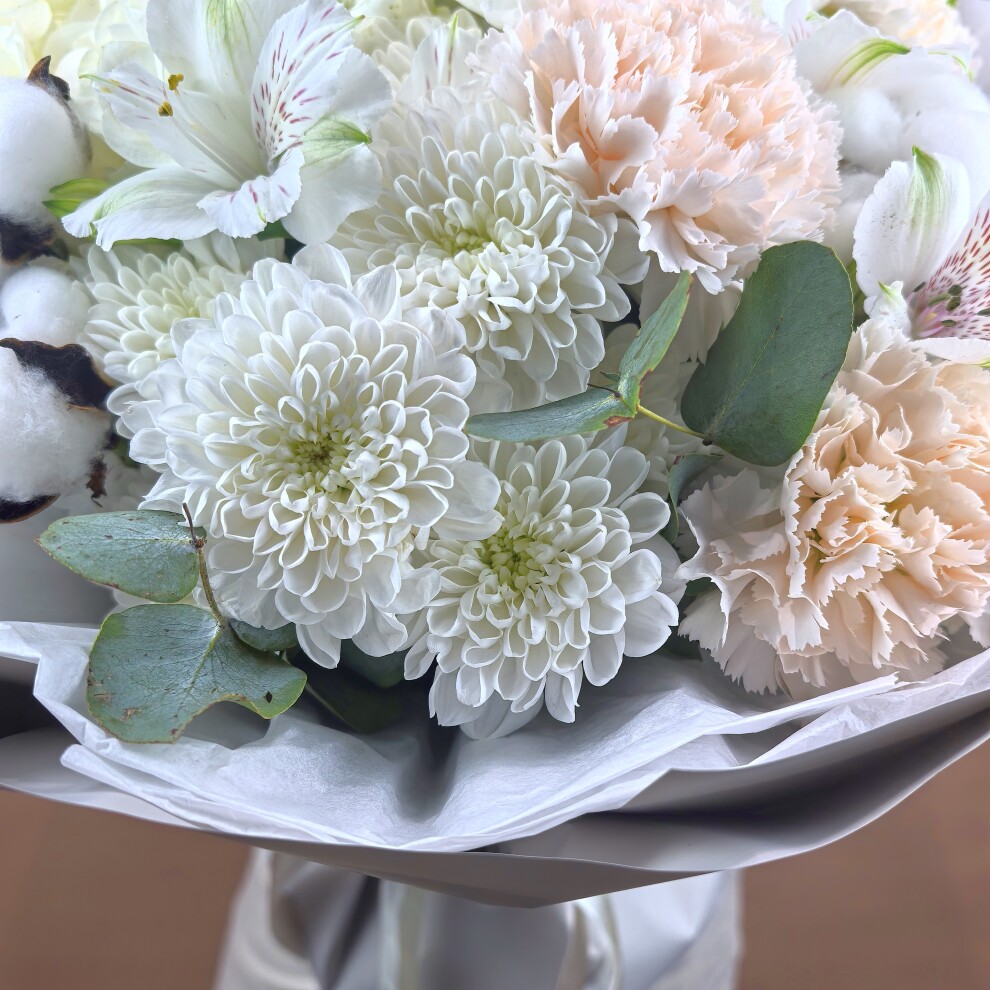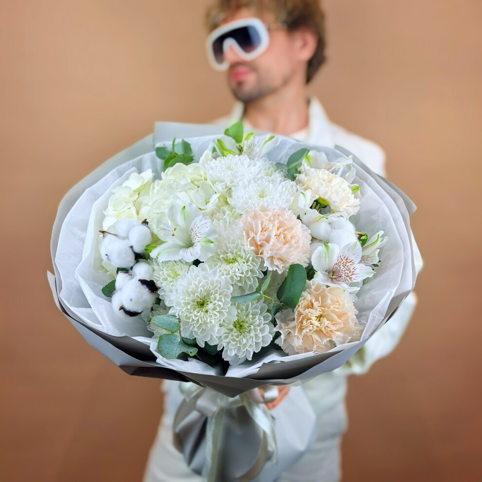 - Хризантема кустовая, Альстромерия, Эвкалипт, Гвоздика, Гортензия, Хлопок