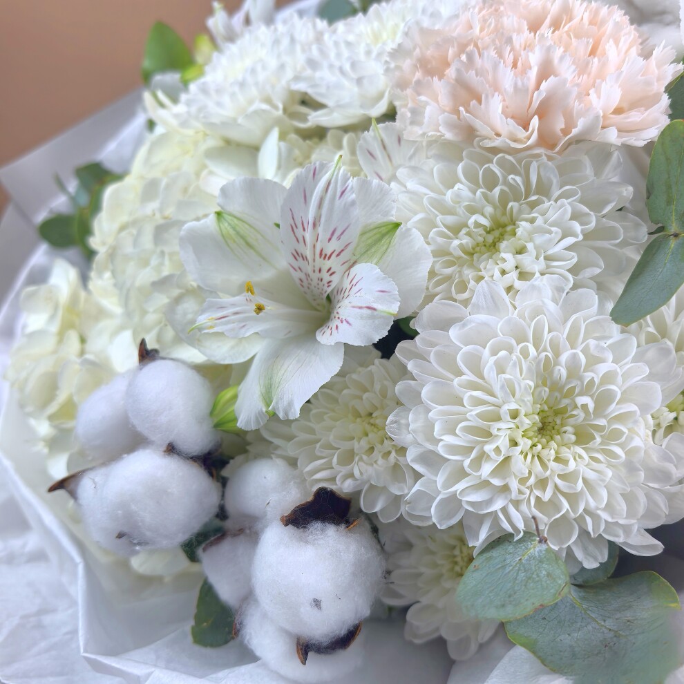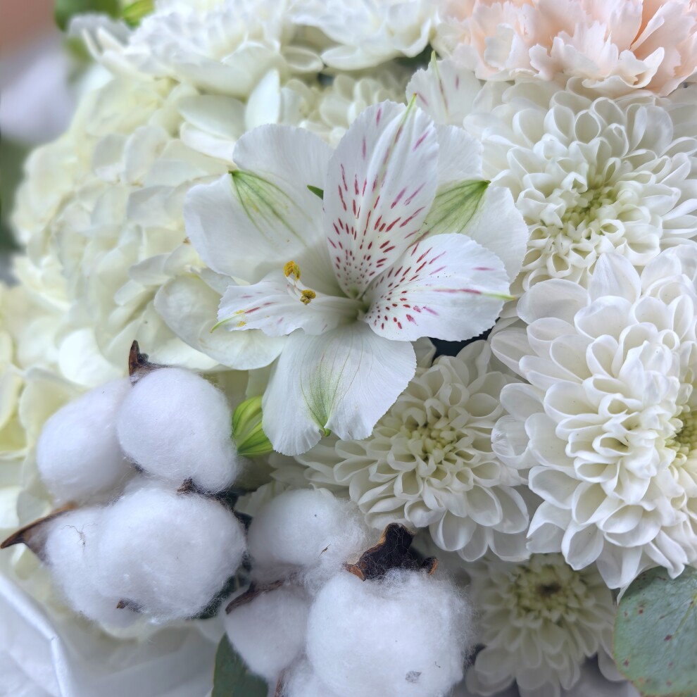 Белые альстромерии добавляют свежести и лёгкости, а пушистые коробочки хлопка придают букету необычную текстуру и объём.