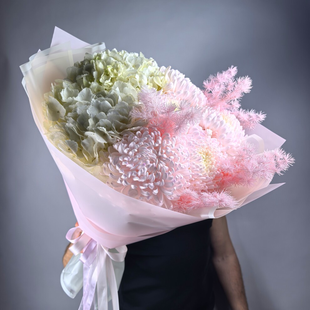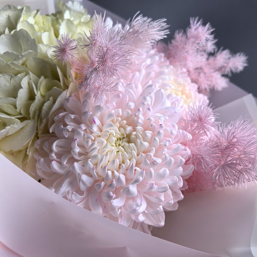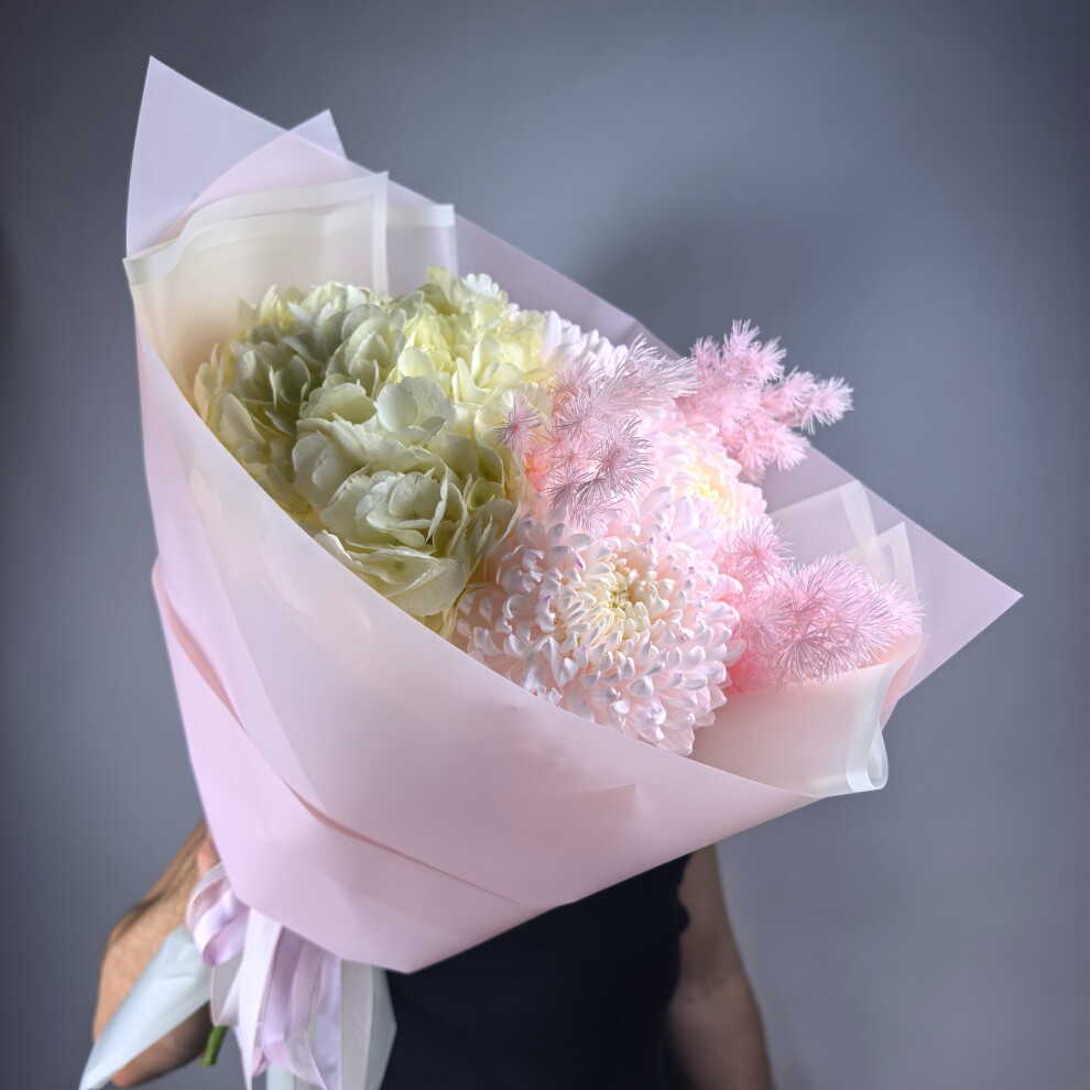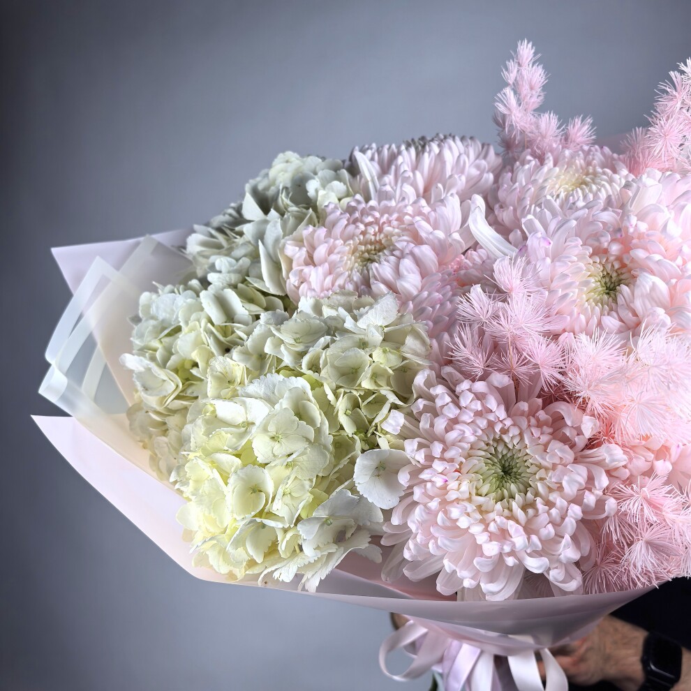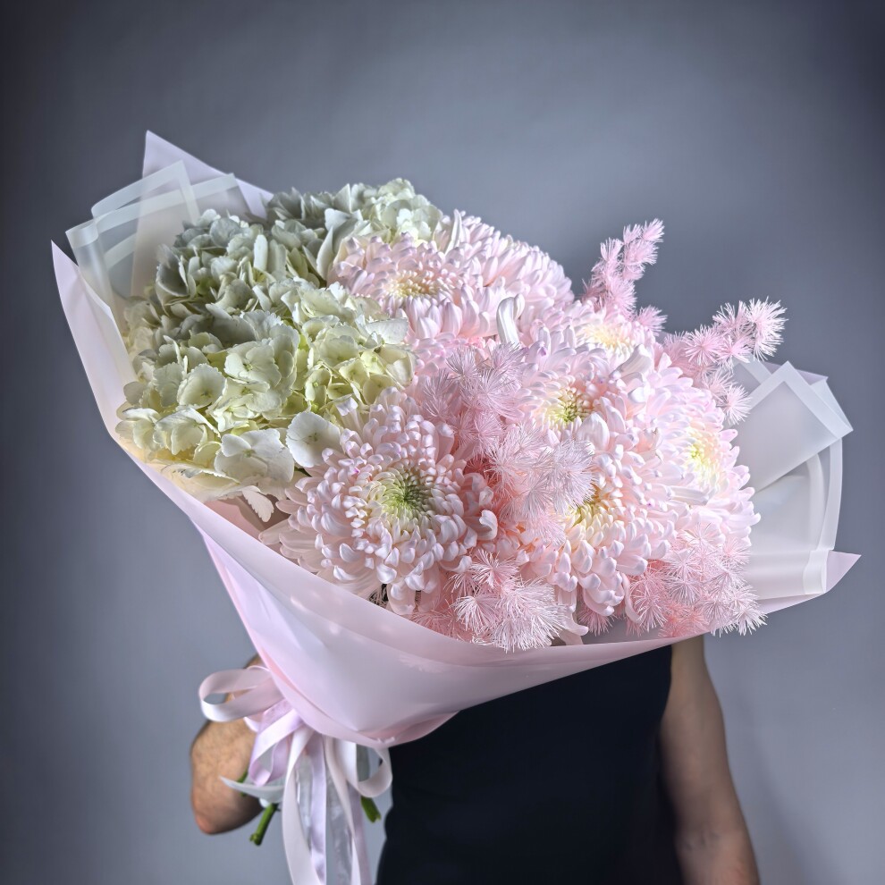Авторский нежный букет: Хризантема Бигуди с Гортензией
