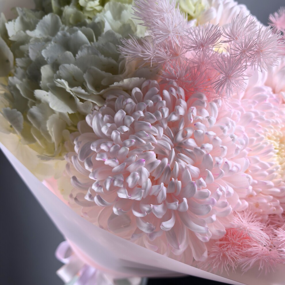Этот букет — воплощение нежности и утончённости. Нежные хризантемы сорта Бигуди, напоминающие ромашки, создают ощущение лёгкости и свежести. Их изысканные лепестки словно переливаются на свету, наполняя композицию воздушностью.