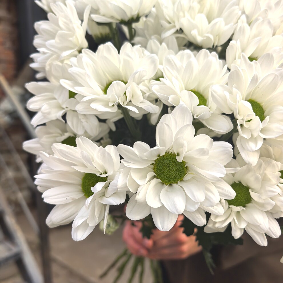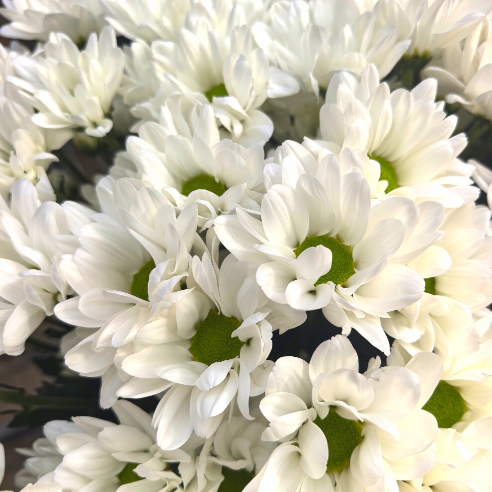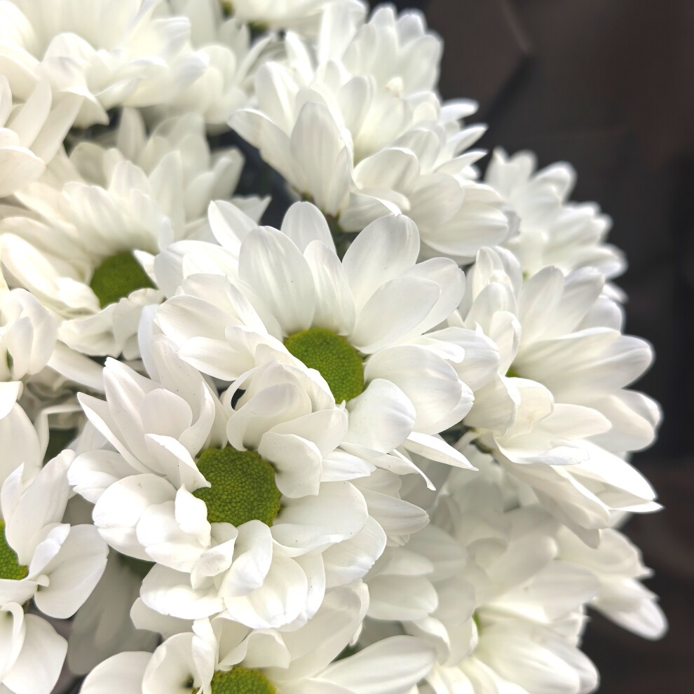 Белые кустовые хризантемы — это воплощение нежности и утончённости. Их белоснежные лепестки, словно покрытые инеем, создают ощущение чистоты и свежести. Каждый цветок в этом букете — как маленькое произведение искусства, которое радует глаз и наполняет душу теплом.