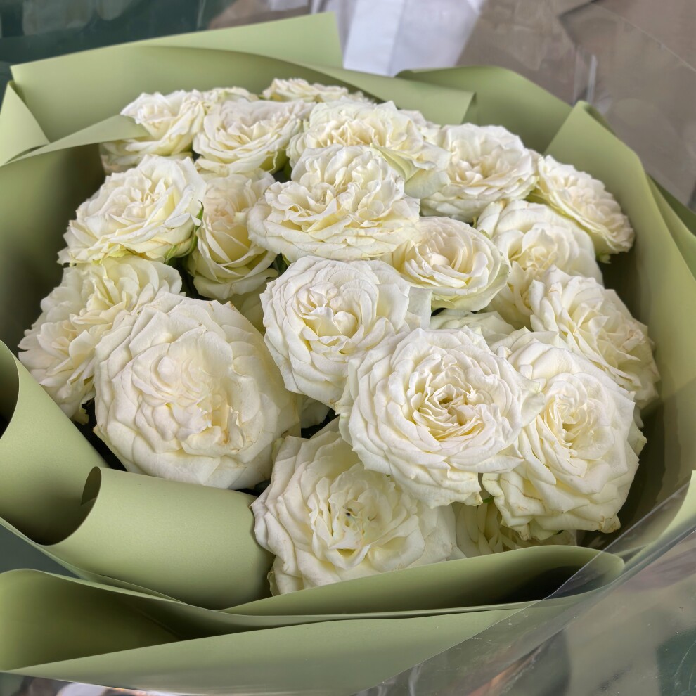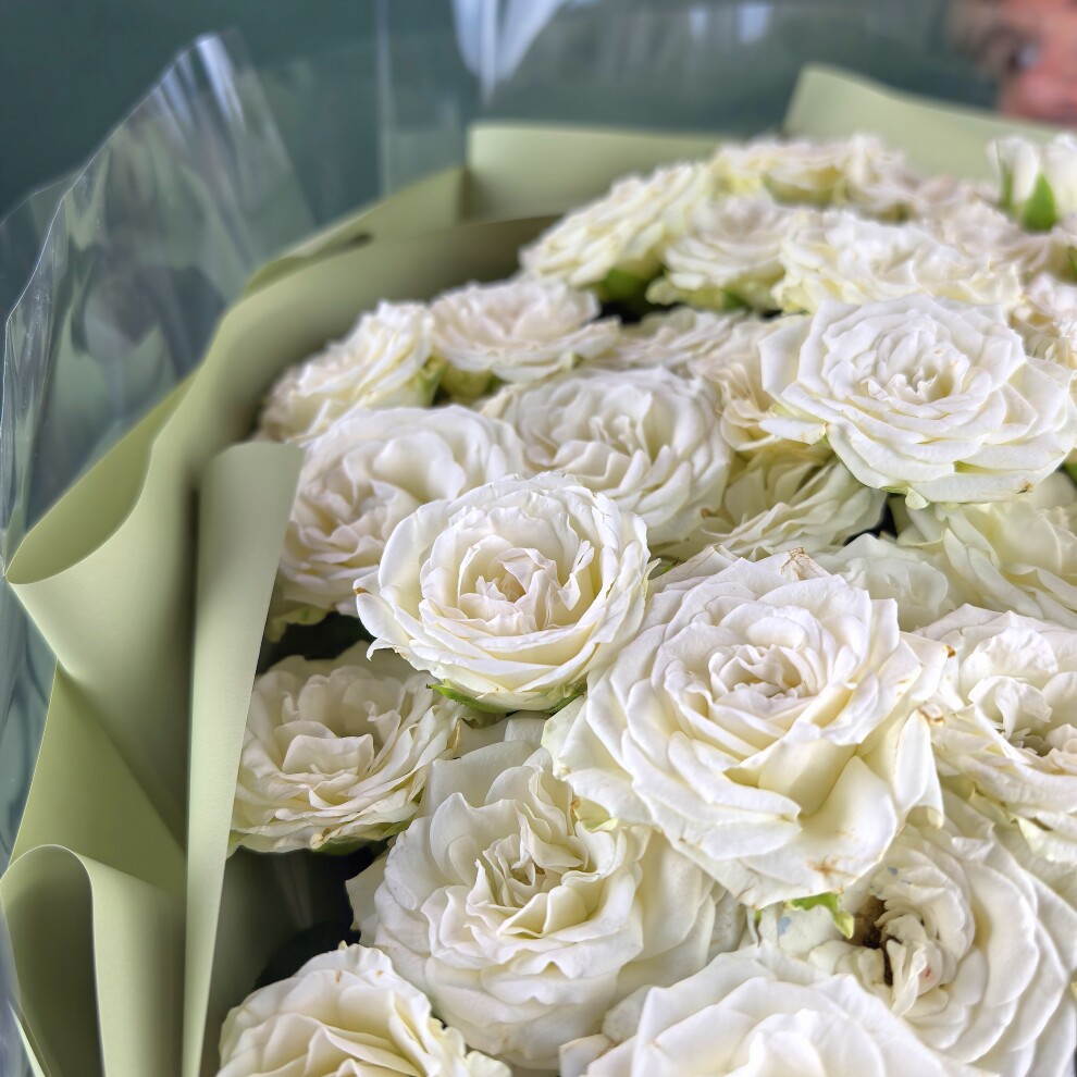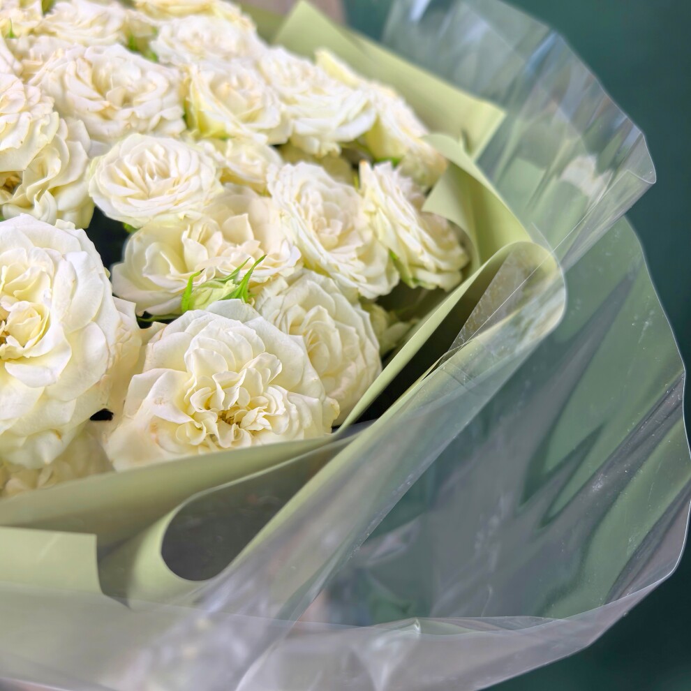 Этот букет из белых кустовых роз выглядит невероятно элегантно и утончённо. Он состоит из множества мелких бутонов, которые создают эффект пышности и изобилия. Белые розы символизируют чистоту, невинность и новые начинания, что делает этот букет универсальным подарком для самых разных случаев.