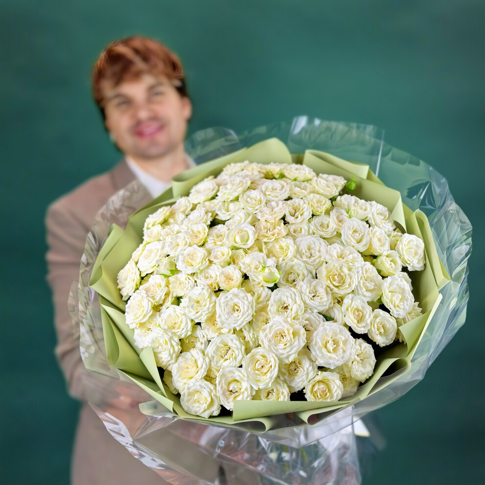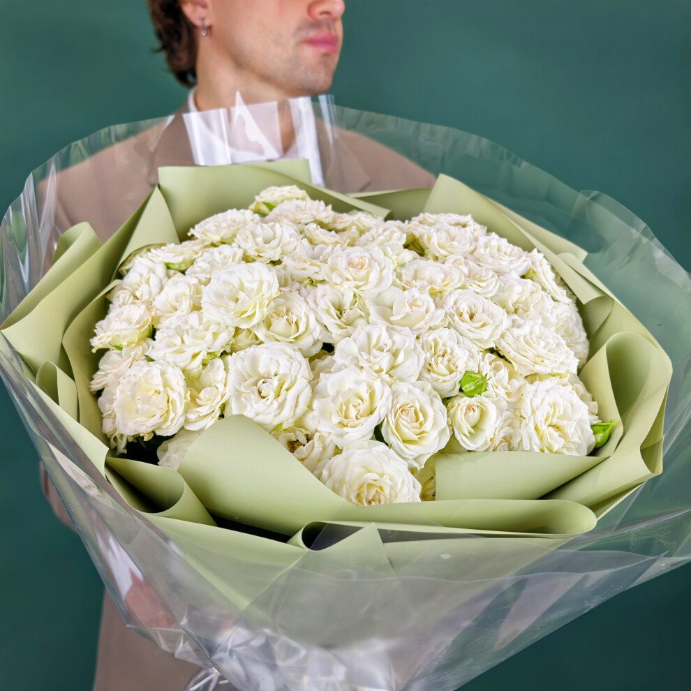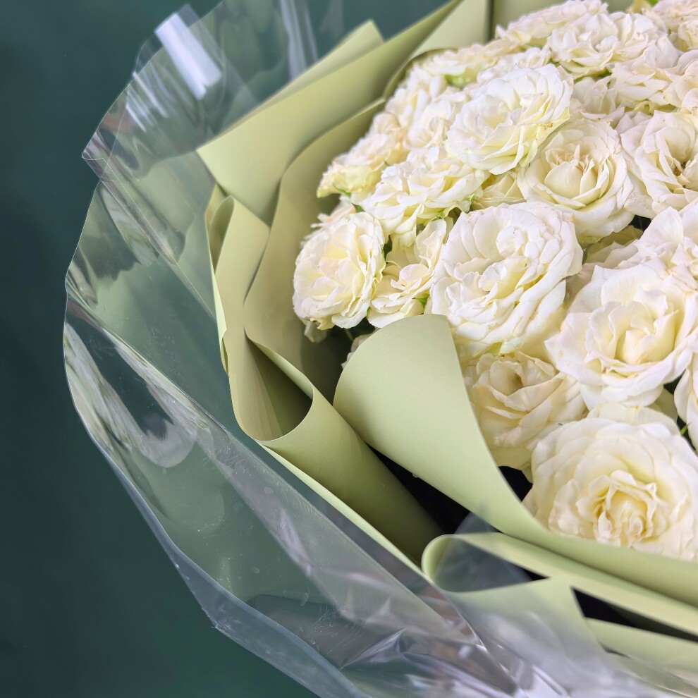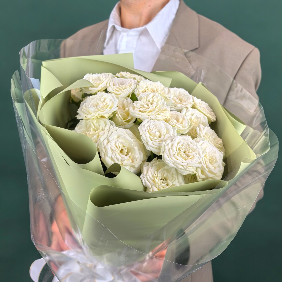 Такой букет станет прекрасным украшением любого интерьера или торжественного мероприятия. Он подойдёт для свадьбы, юбилея, выпускного или просто как знак внимания и заботы. Белые кустовые розы в этом букете выглядят свежо и изысканно, создавая атмосферу лёгкости и гармонии.