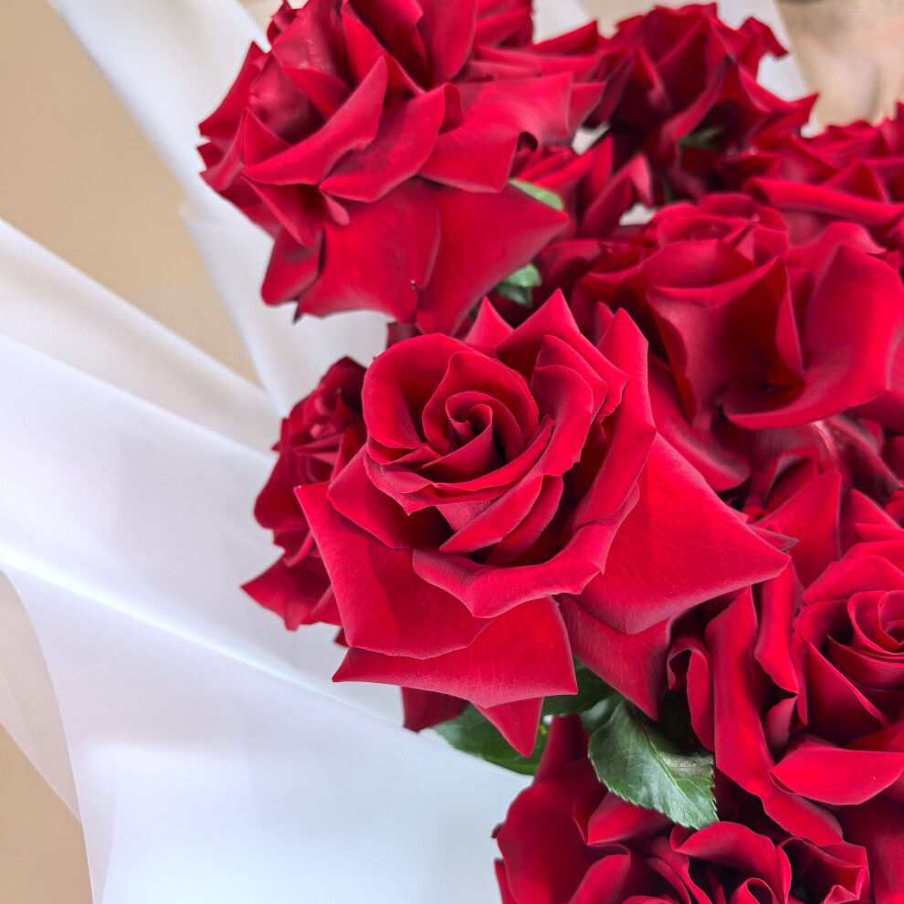 Белые атласные ленты, словно крылья, обрамляют розы, добавляя изысканности и подчёркивая их яркий цвет. Такой стиль оформления делает букет особенно эффектным и запоминающимся.