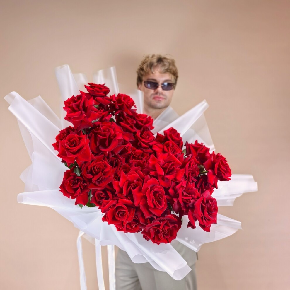 В его основе лежат 51 французская роза насыщенного красного цвета, которые символизируют глубокую любовь и страсть. Каждый цветок тщательно подобран, чтобы создать идеальную композицию.