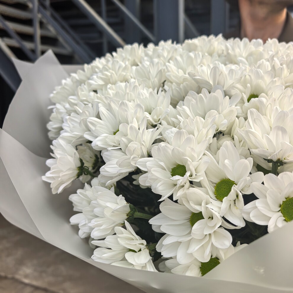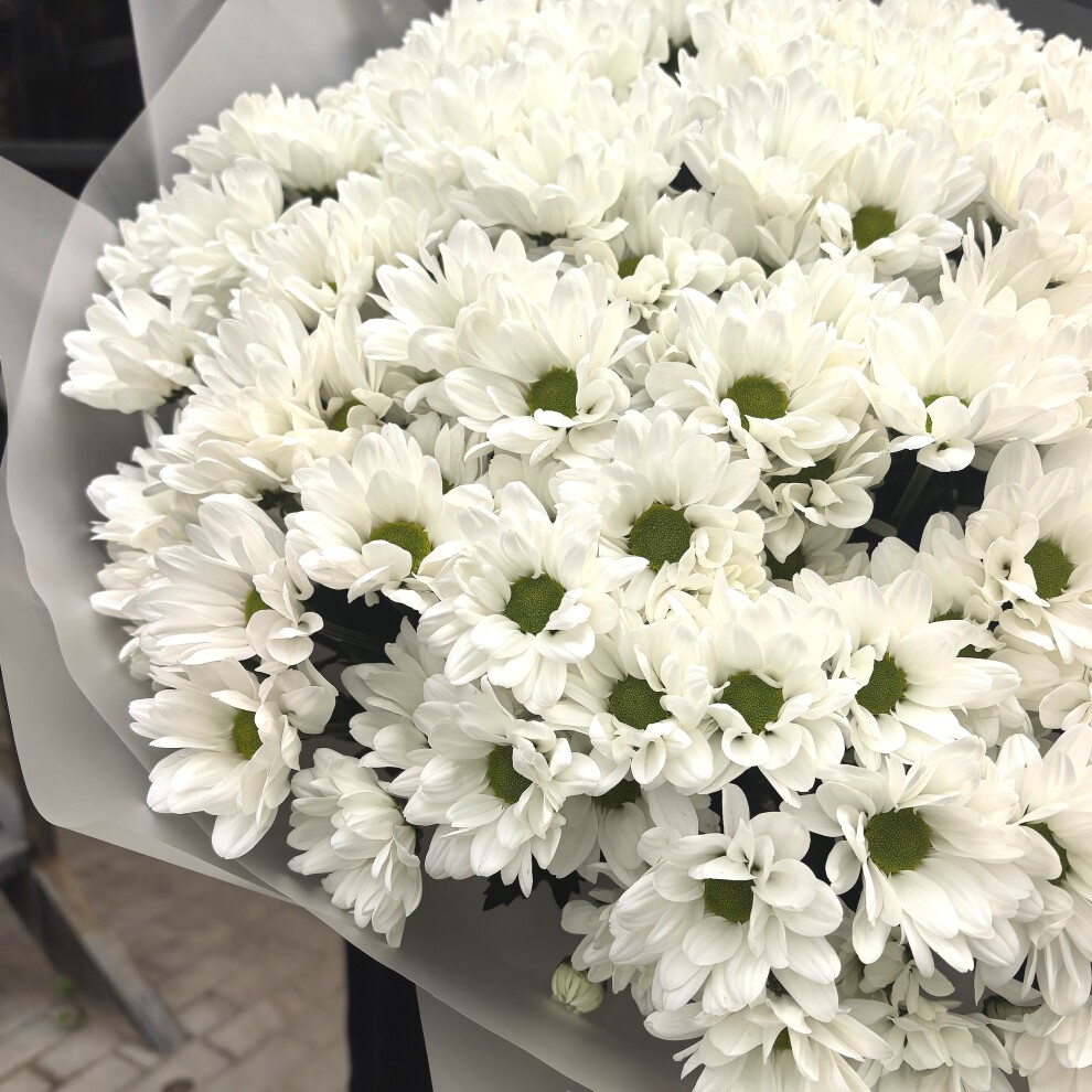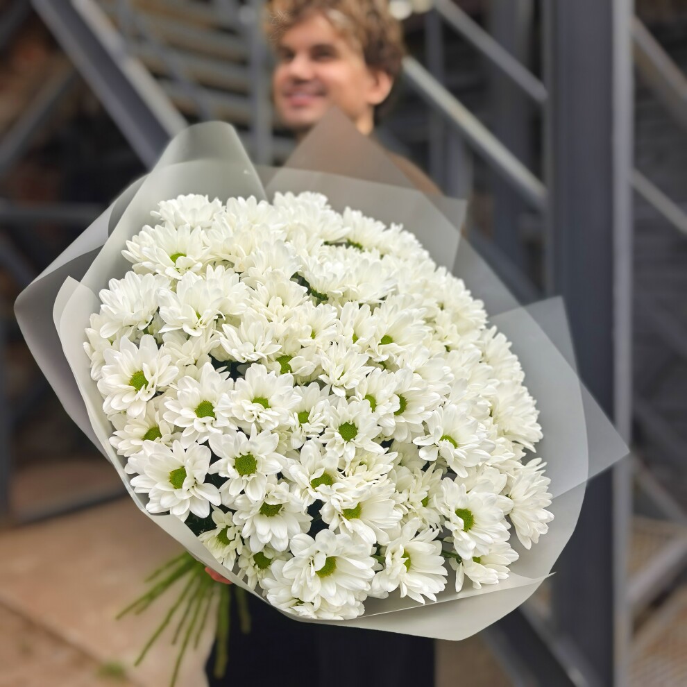 Этот букет из белых кустовых хризантем — воплощение нежности и утончённости. Его белоснежные лепестки, словно покрытое инеем утро, создают ощущение чистоты и свежести. Каждый цветок в этом ансамбле — как маленькая история о красоте и гармонии, которая наполняет душу теплом и умиротворением.