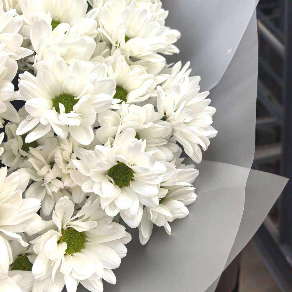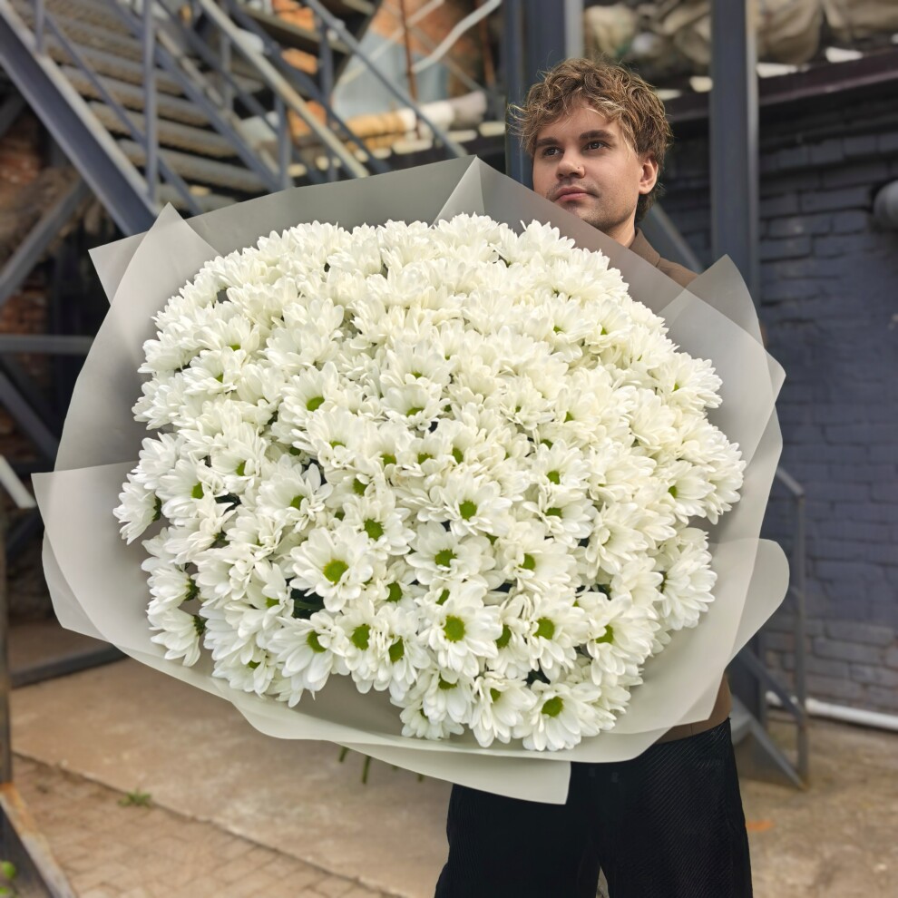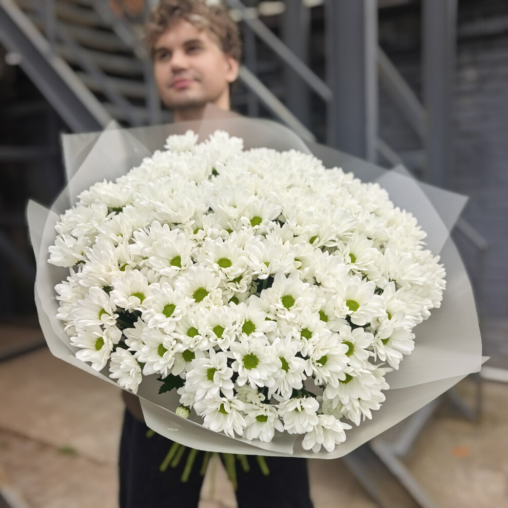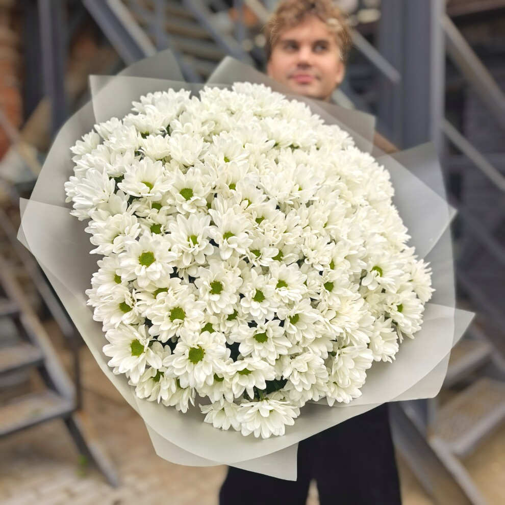 Этот букет из белых кустовых хризантем — воплощение нежности и утончённости. Его белоснежные лепестки, словно покрытое инеем утро, создают ощущение чистоты и свежести. Каждый цветок в этом ансамбле — как маленькая история о красоте и гармонии, которая наполняет душу теплом и умиротворением.