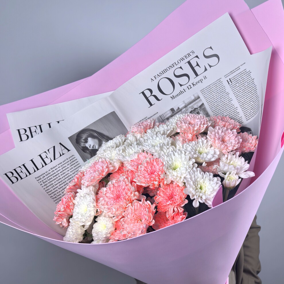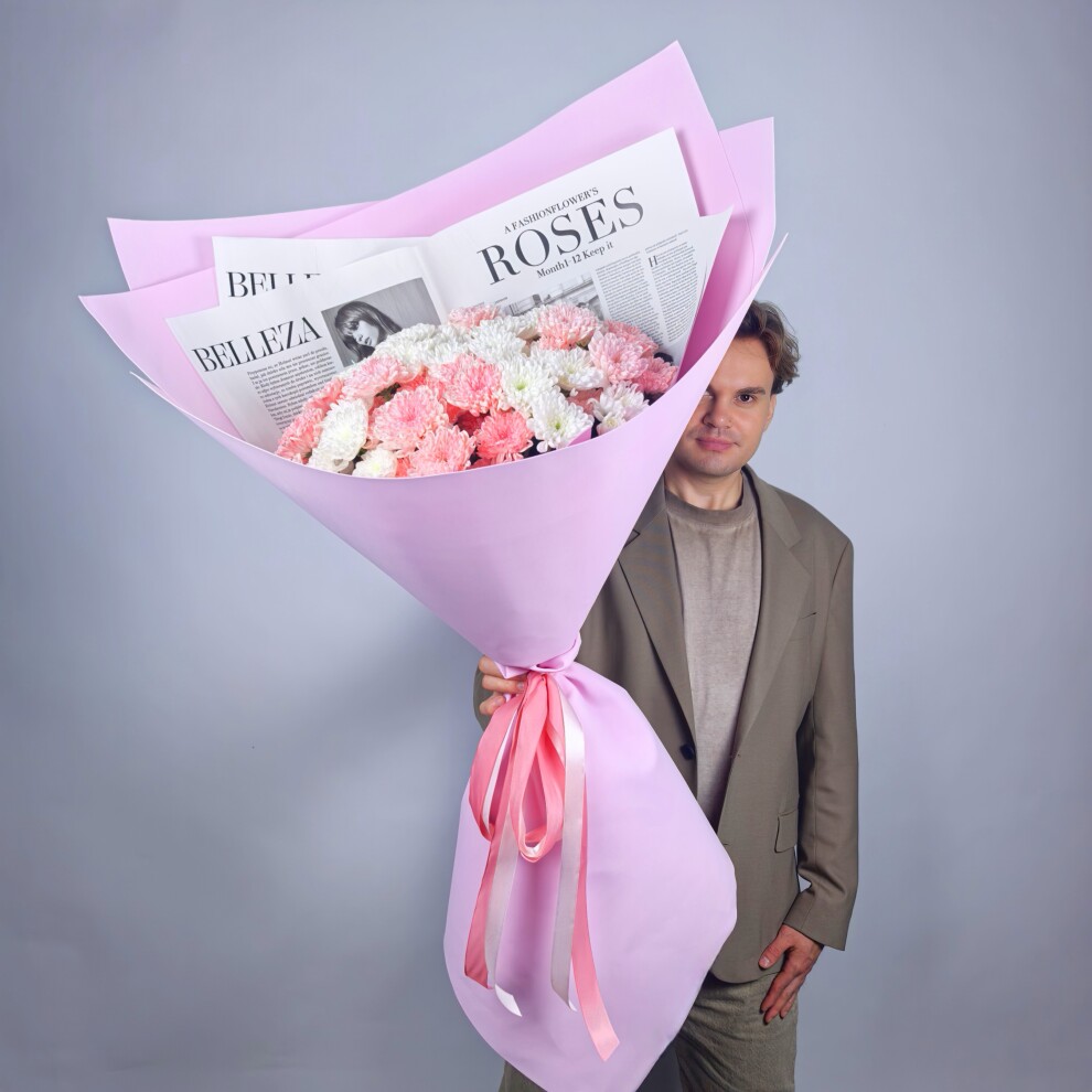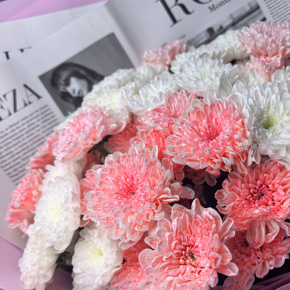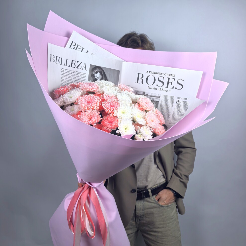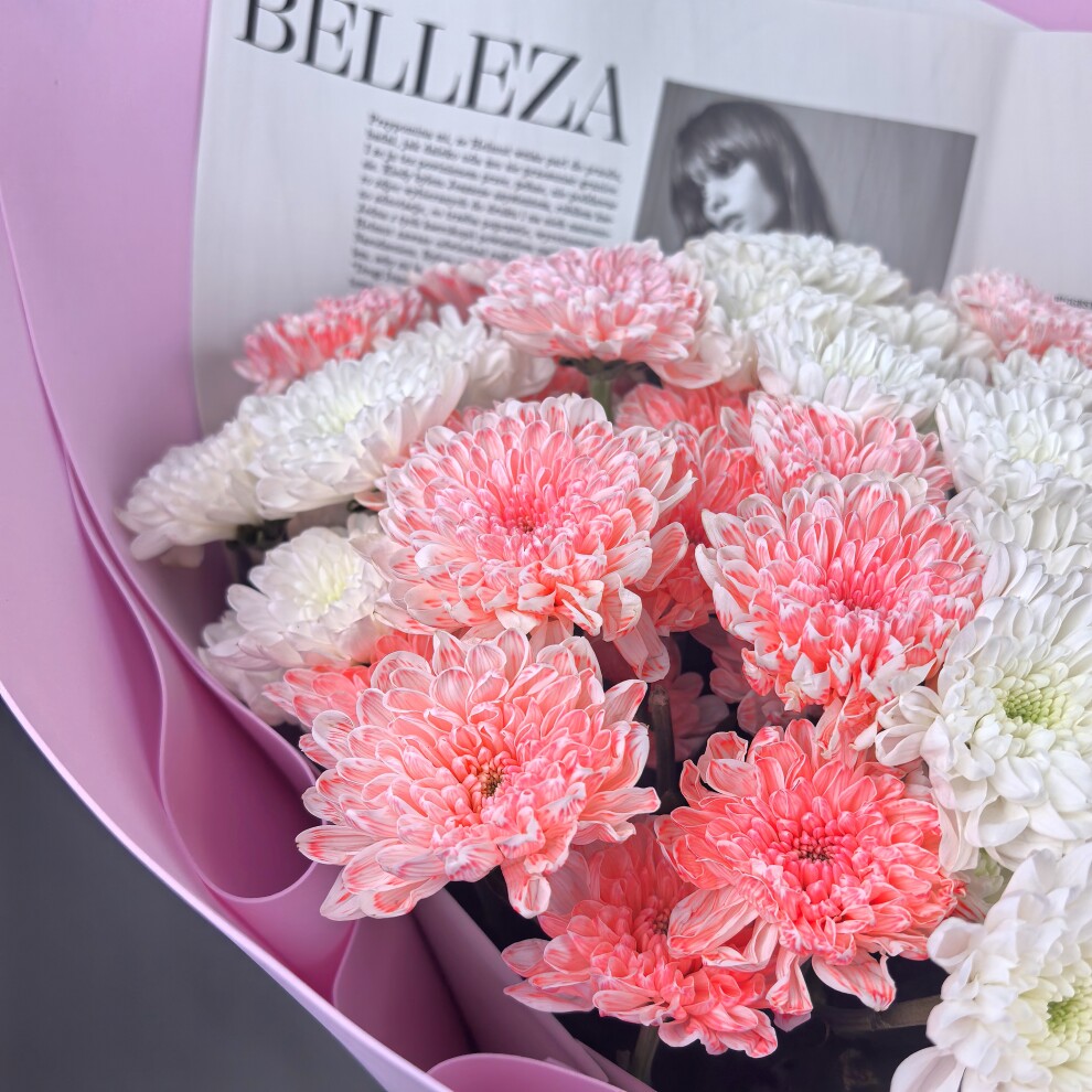 Этот букет — воплощение нежности и утончённости. Он состоит из розовых и белых хризантем, которые создают гармоничный и элегантный образ. Цветы аккуратно собраны в округлую форму, что подчёркивает их естественную красоту.