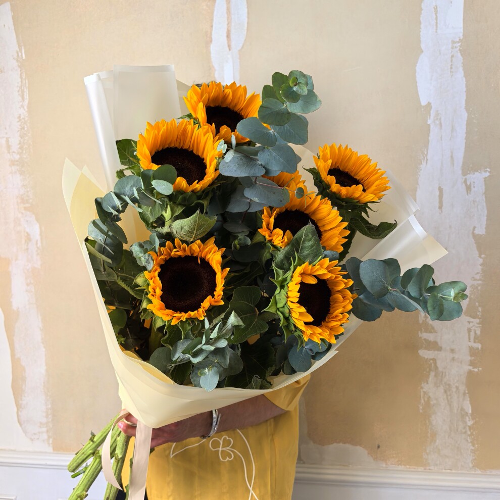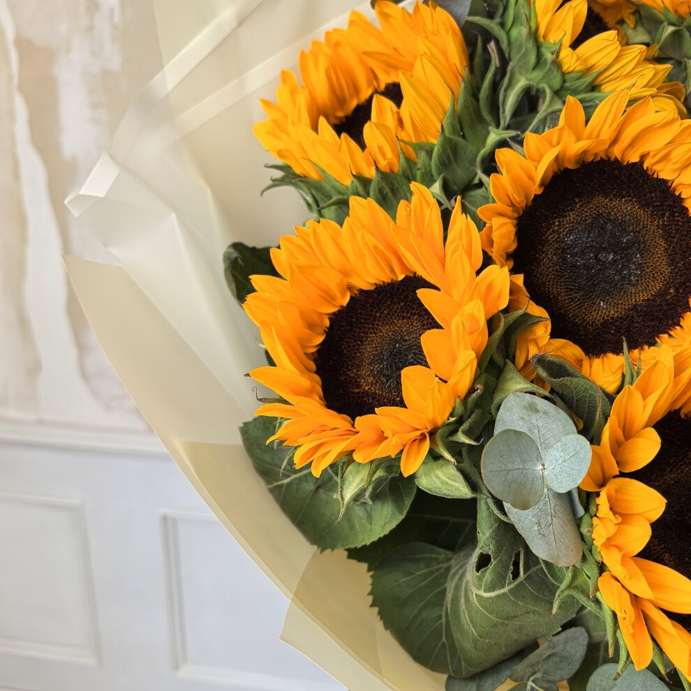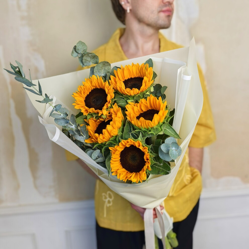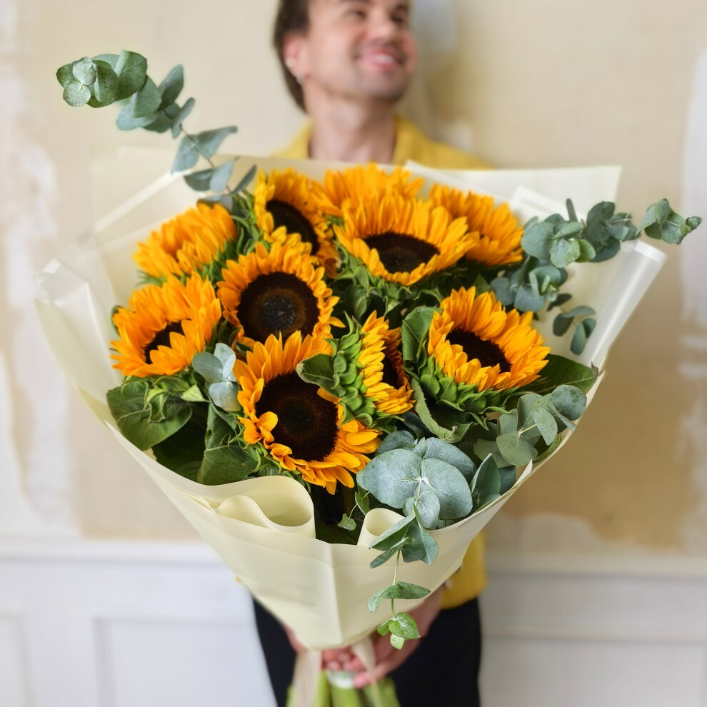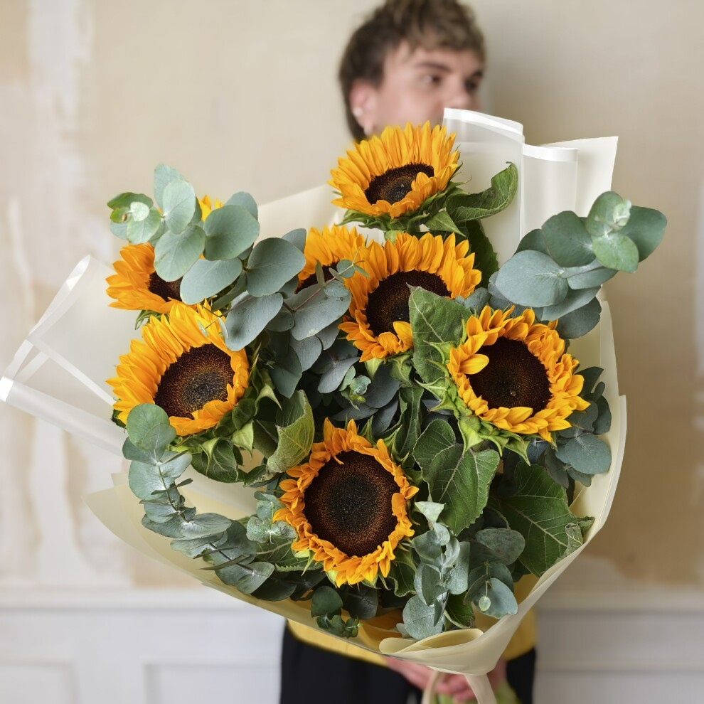 Девять величественных подсолнухов создают потрясающую, масштабную композицию, которая наполняет пространство безграничным теплом и радостью. Их крупные, роскошные соцветия с сочными оранжевыми лепестками создают яркий акцент, а изысканные листья эвкалипта добавляют композиции свежести и элегантности.
