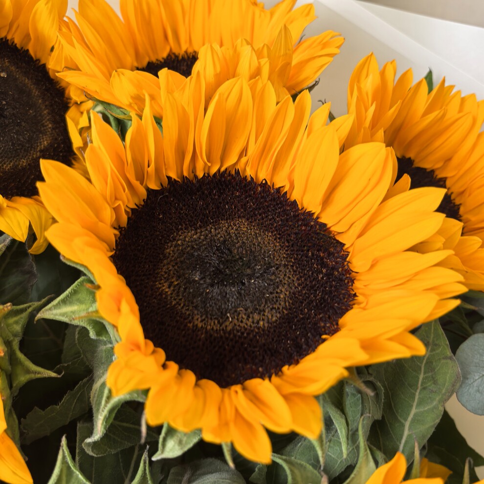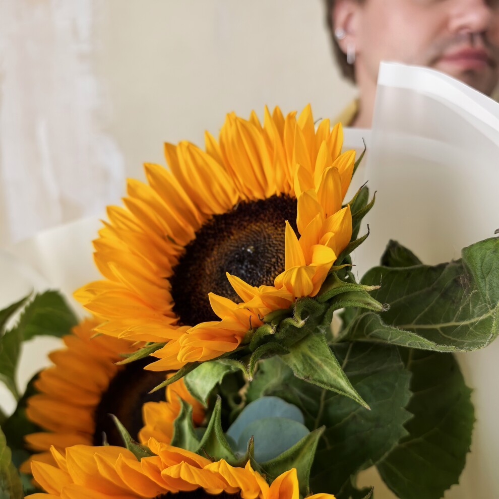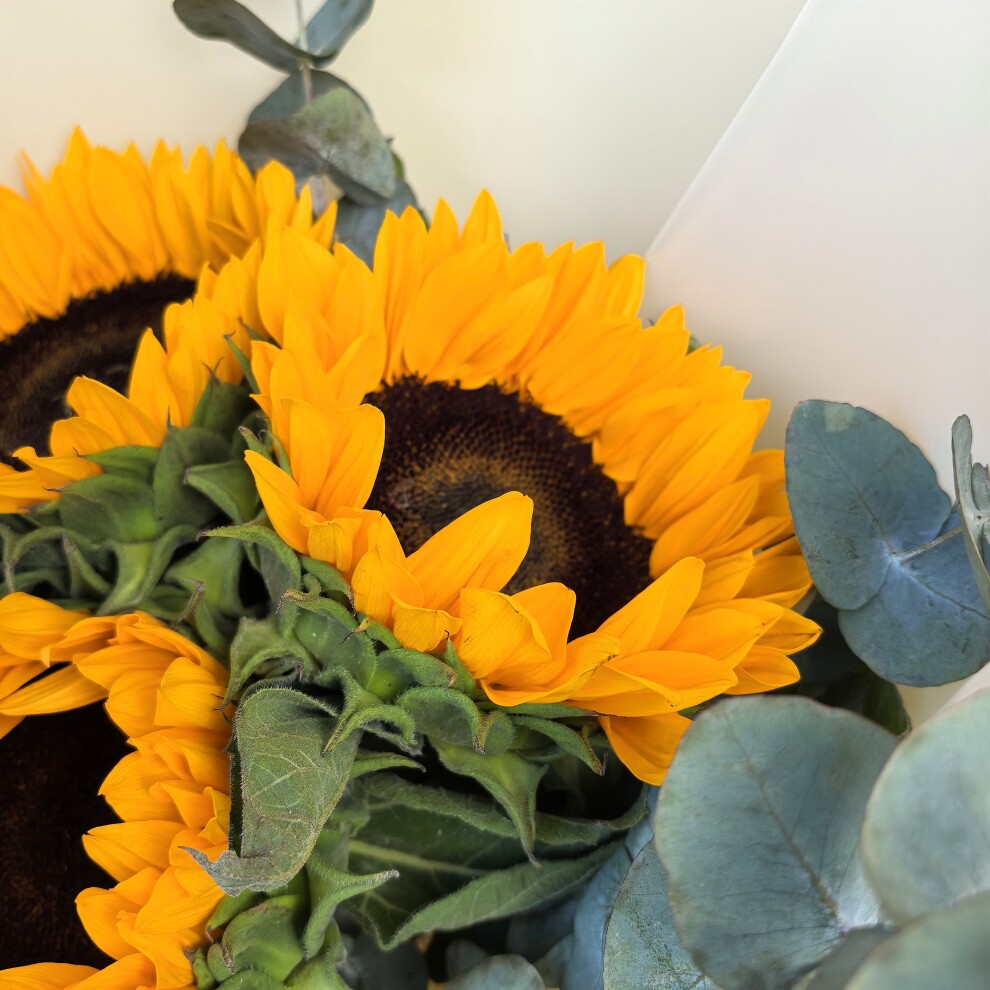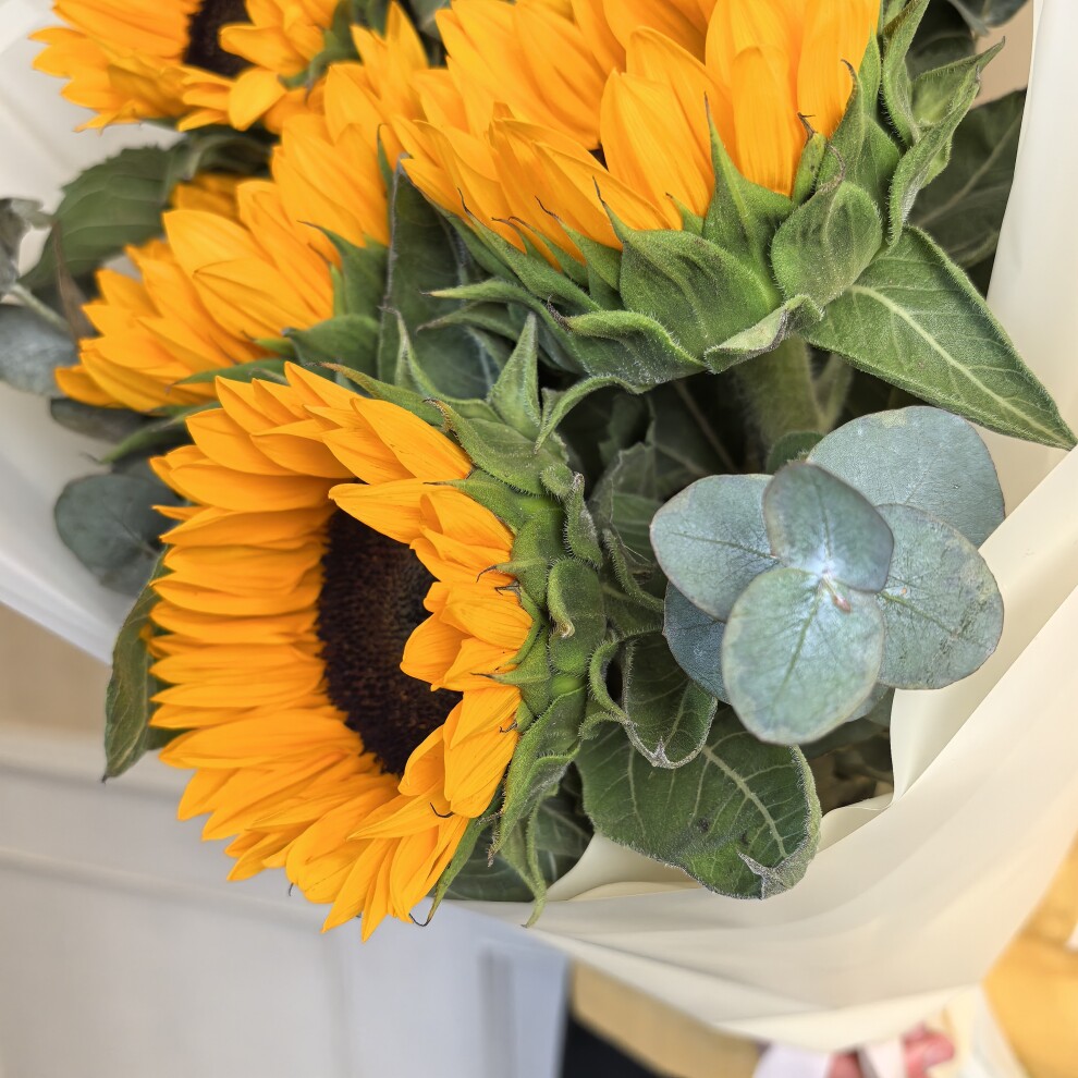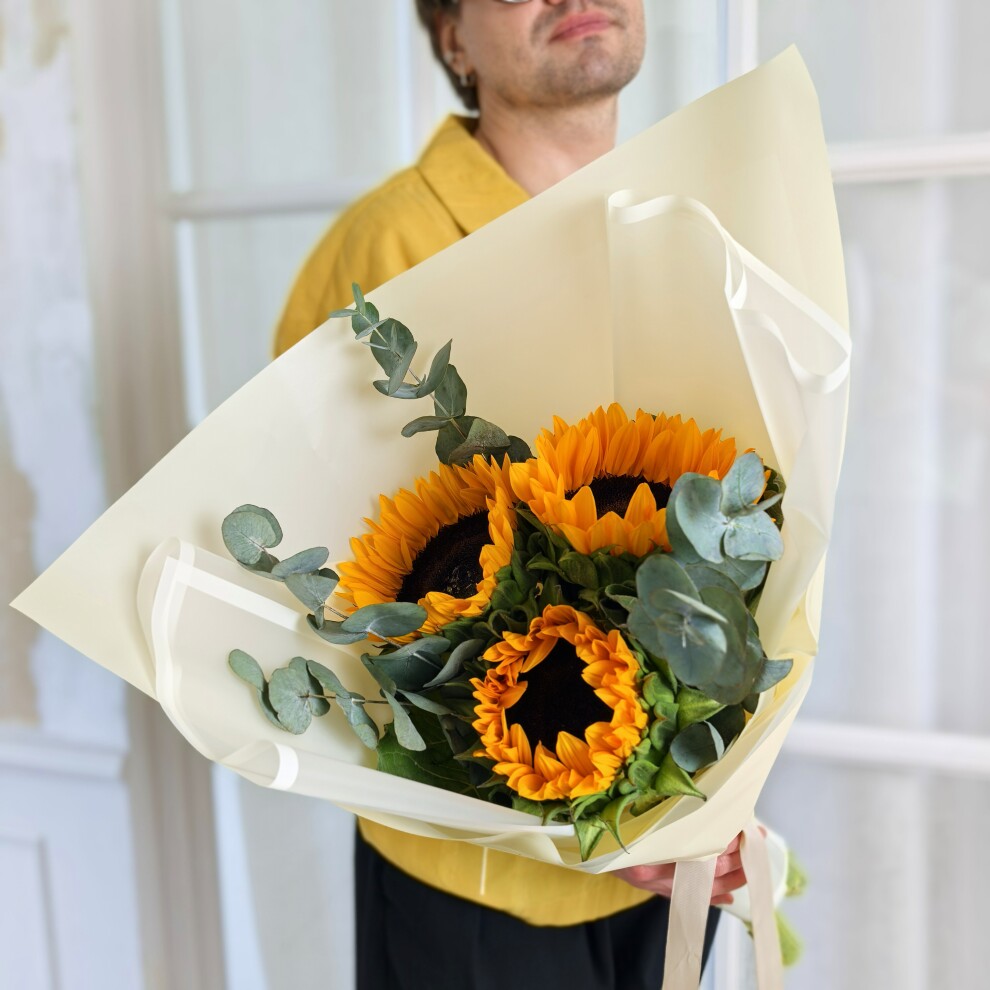 Девять величественных подсолнухов создают потрясающую, масштабную композицию, которая наполняет пространство безграничным теплом и радостью. Их крупные, роскошные соцветия с сочными оранжевыми лепестками создают яркий акцент, а изысканные листья эвкалипта добавляют композиции свежести и элегантности.