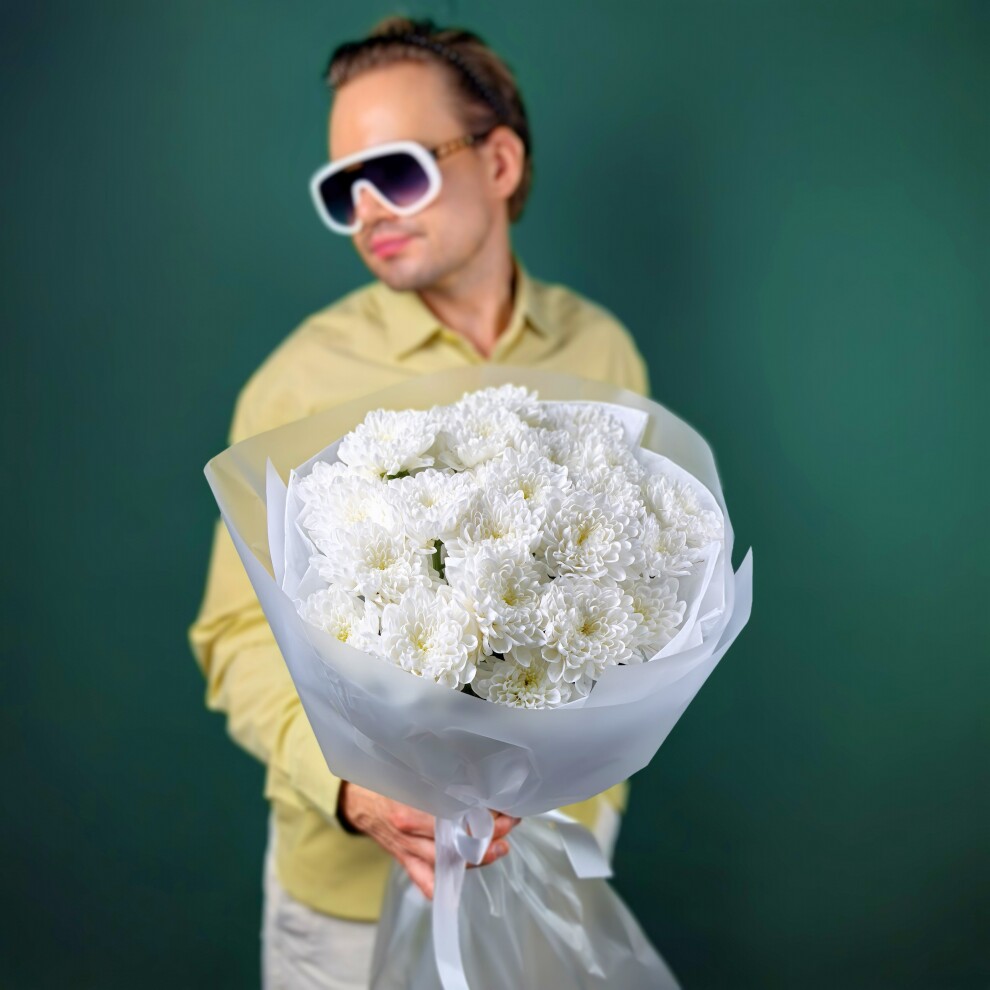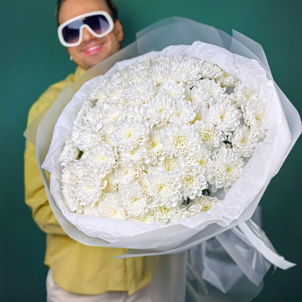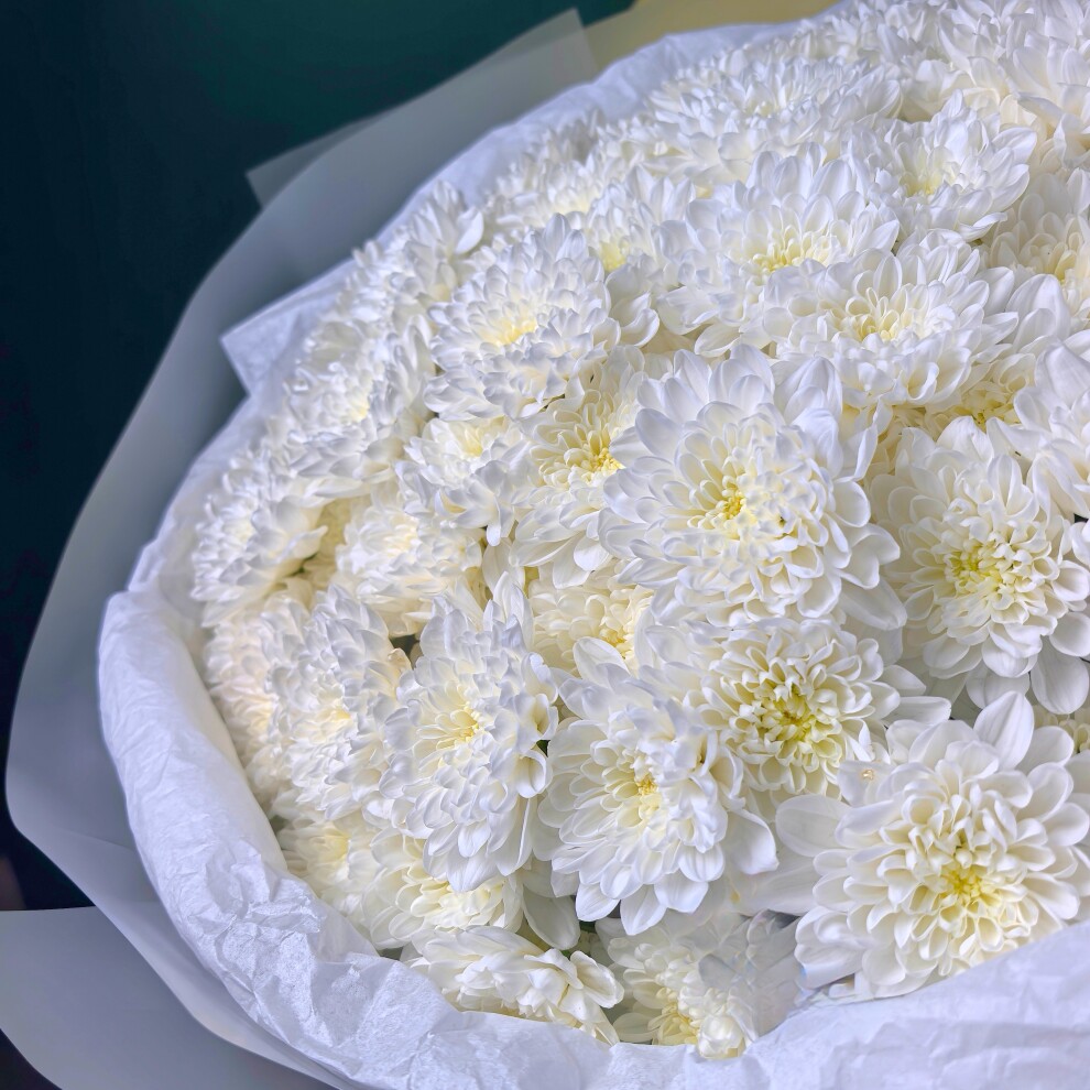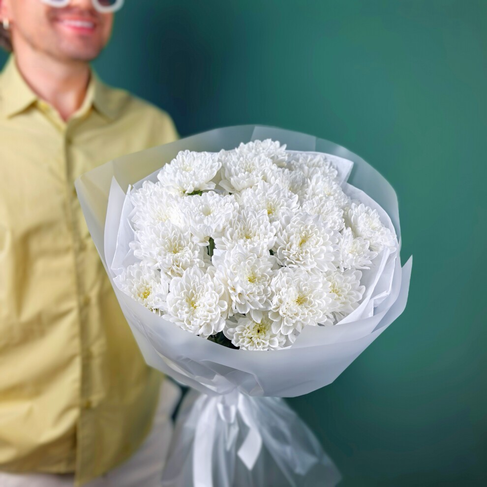 Этот букет состоит из белых хризантем, собранных в округлую форму.