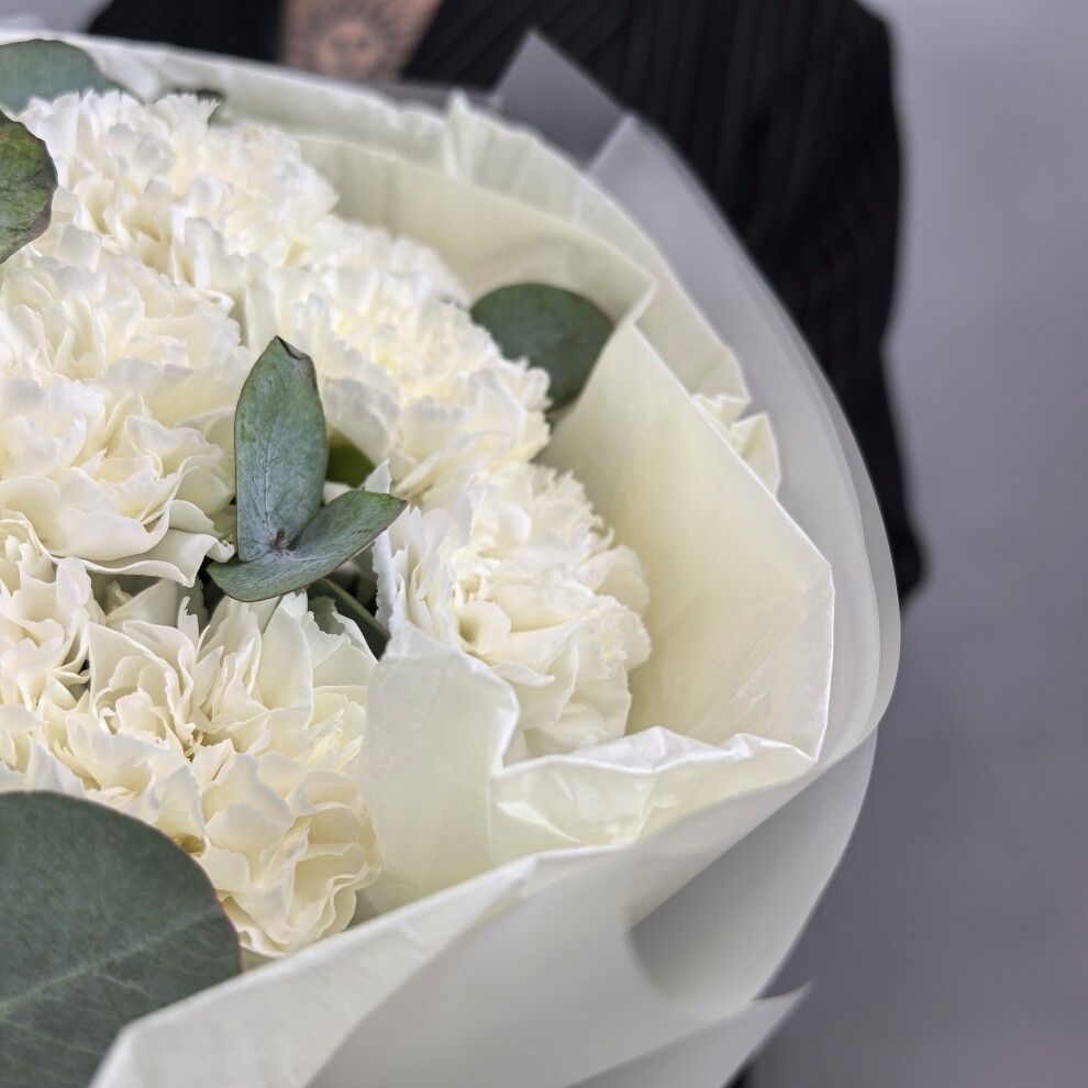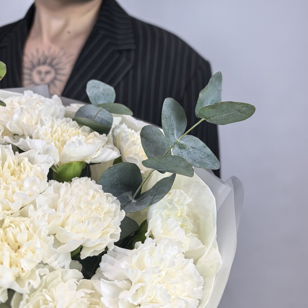 Зелёные листья эвкалипта добавляют свежести и подчёркивают естественную красоту цветов.