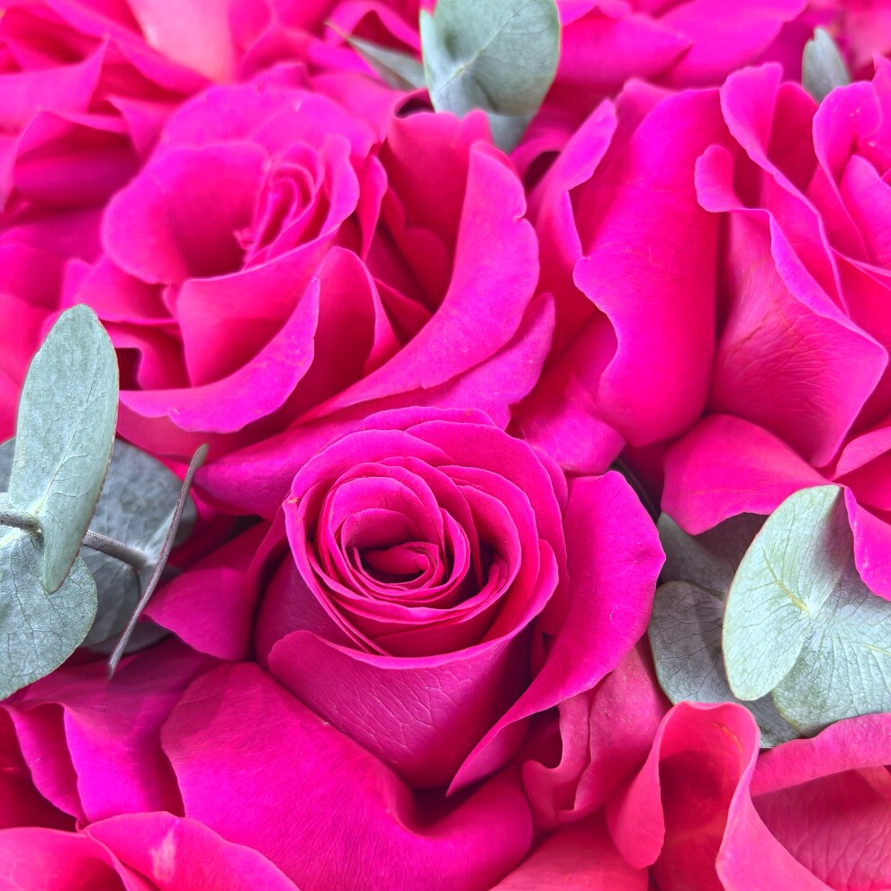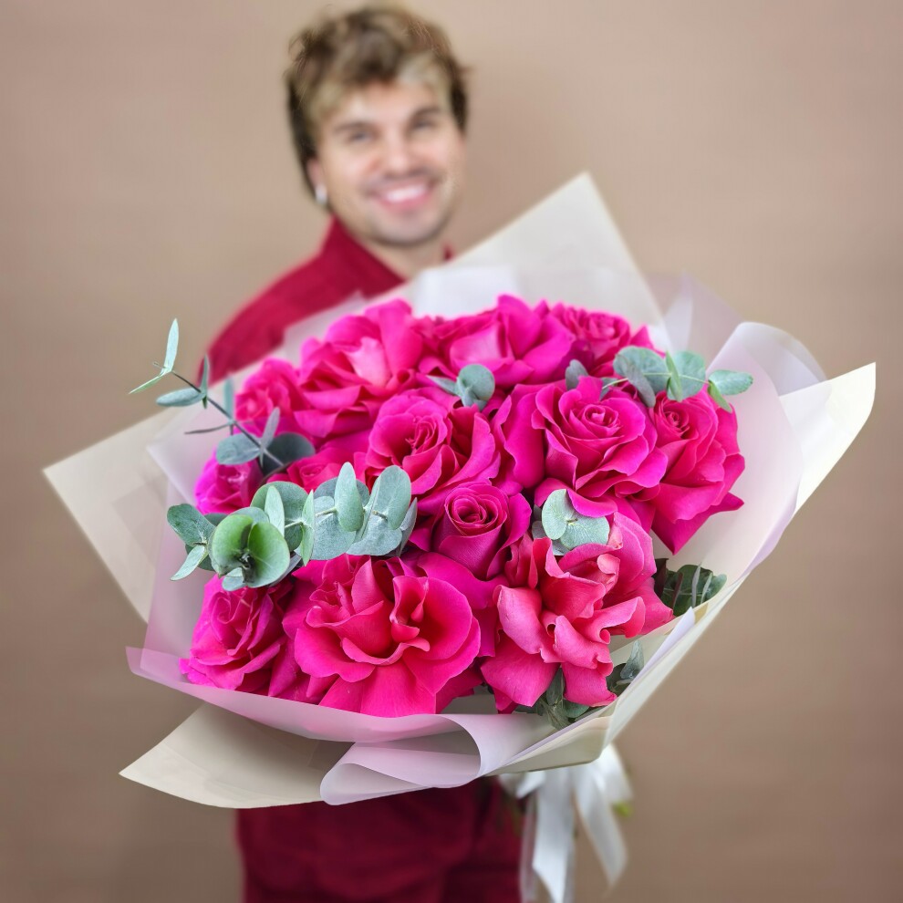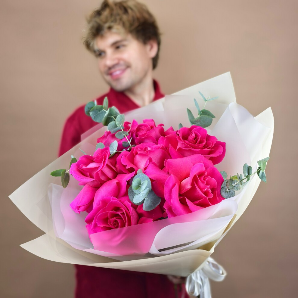 Ярко-розовые розы, словно воплощение страсти и любви, создают атмосферу тепла и романтики.