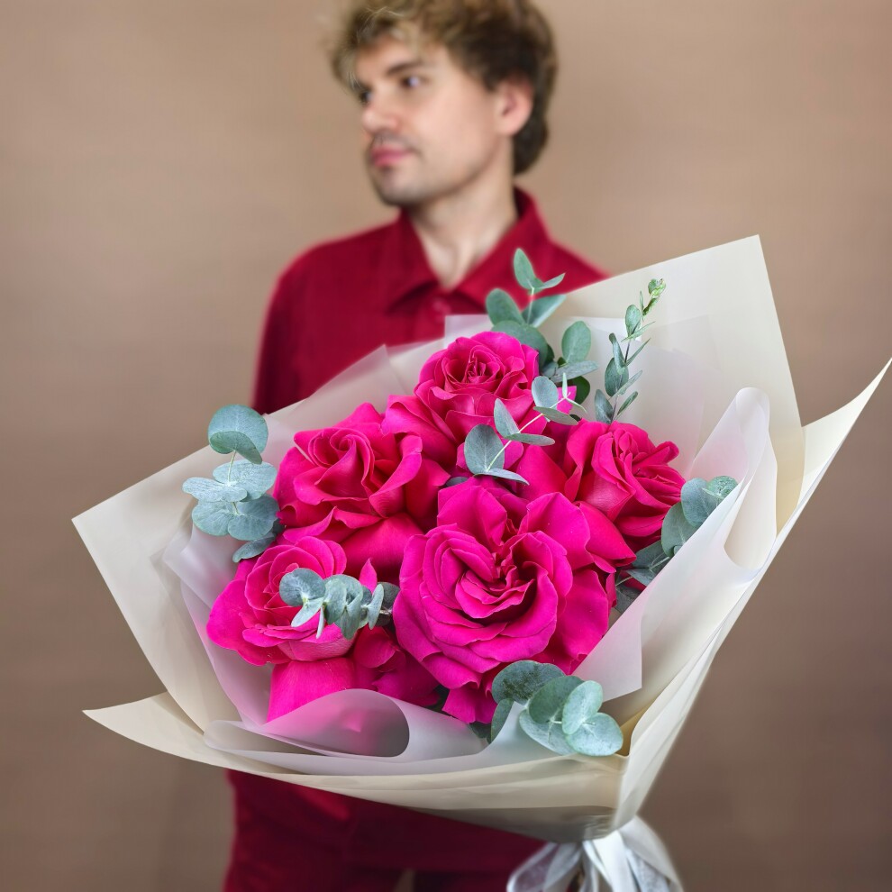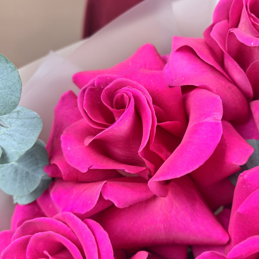 Их бархатистые лепестки гармонично дополнены зелёными листьями эвкалипта, которые придают композиции лёгкость и природную свежесть.