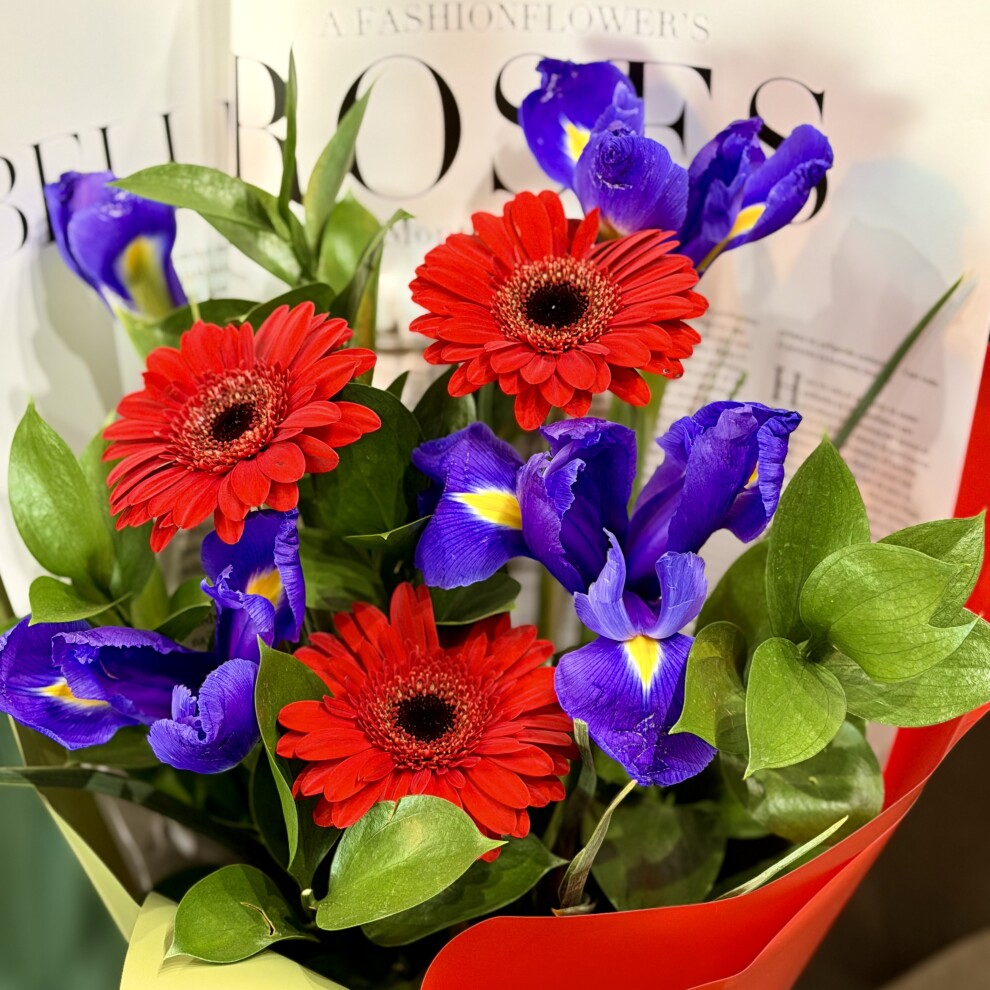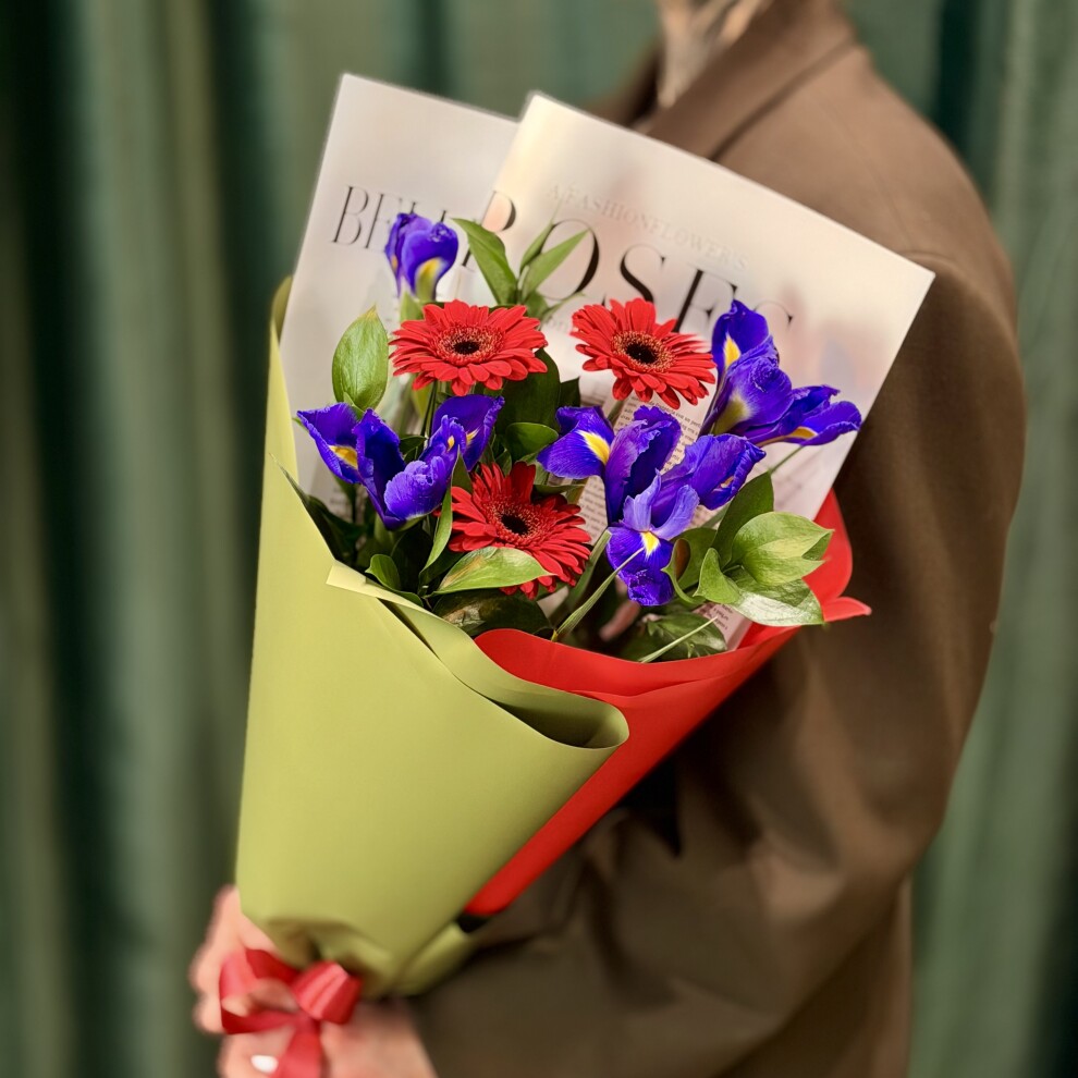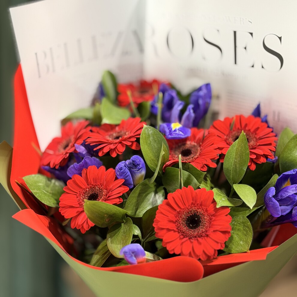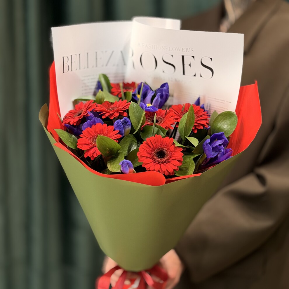 Этот букет — воплощение яркой гармонии и утончённой элегантности. В композиции искусно сочетаются пышные красные герберы и изысканные фиолетовые ирисы, создавая выразительный контраст и притягивая взгляд. Сочная зелёная листва обрамляет цветы, добавляя букету свежести и природного шарма.