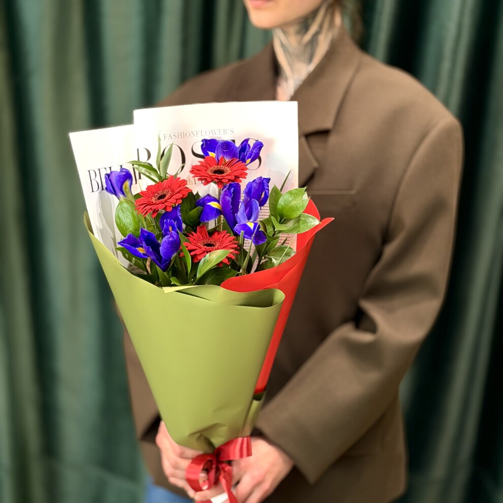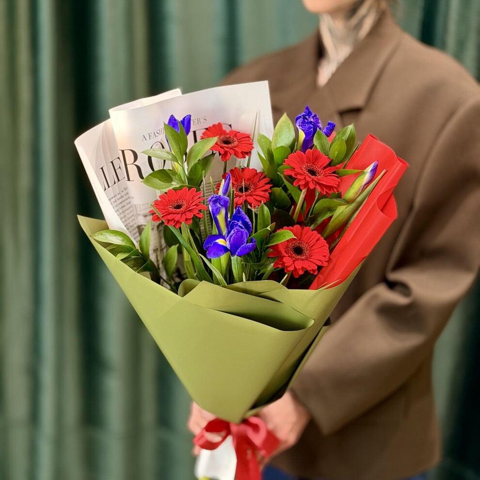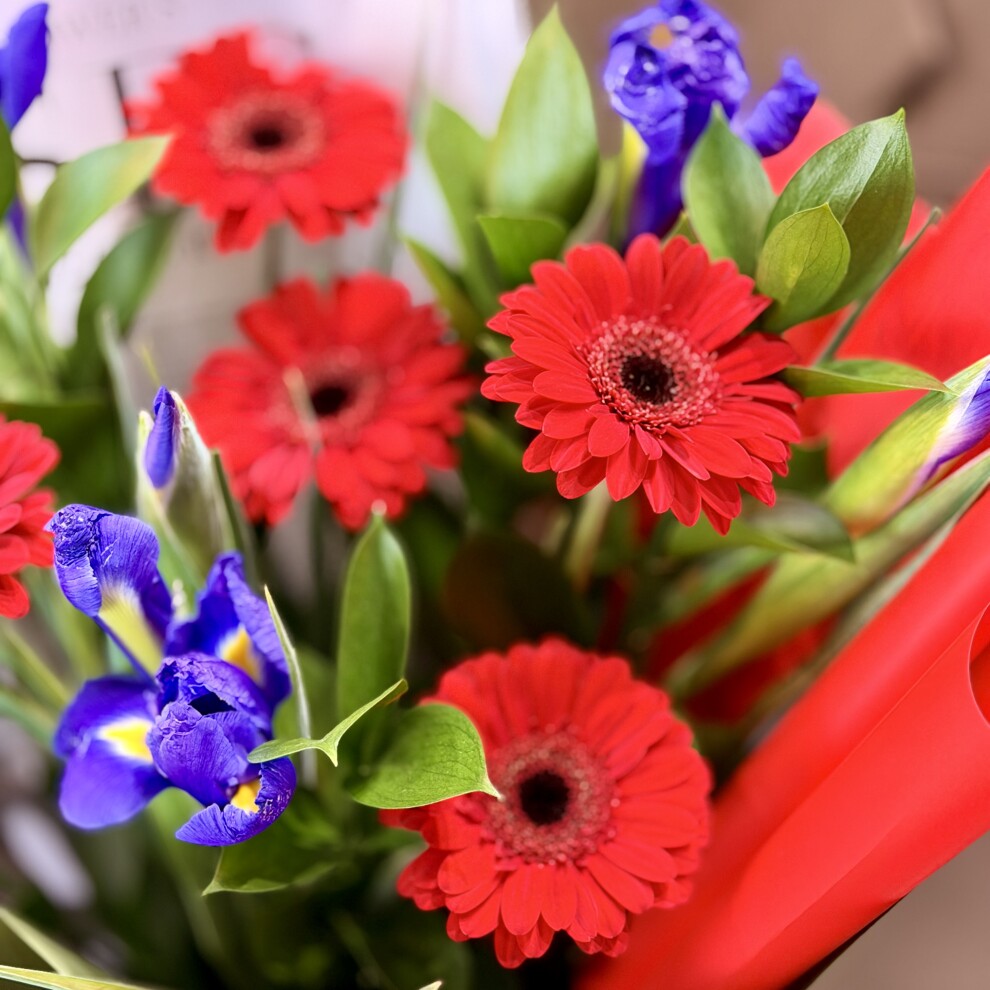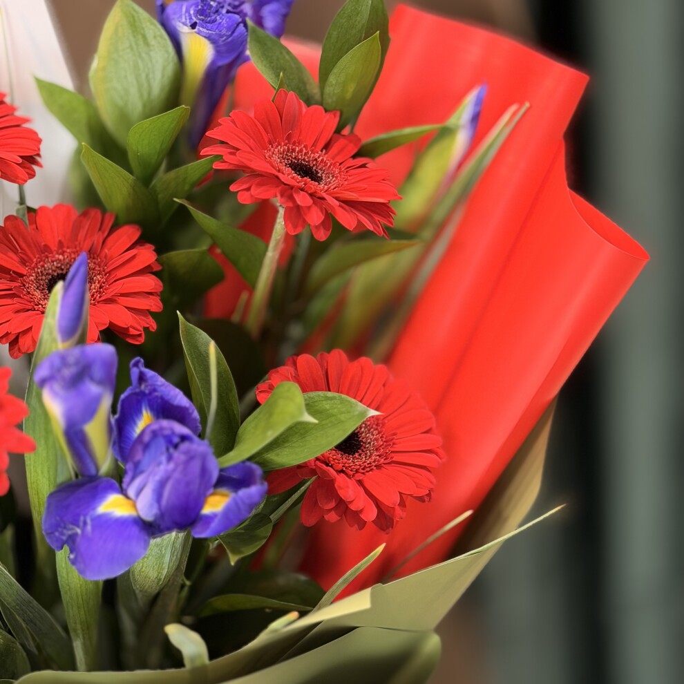 Этот букет — воплощение яркой гармонии и утончённой элегантности. В композиции искусно сочетаются пышные красные герберы и изысканные фиолетовые ирисы, создавая выразительный контраст и притягивая взгляд. Сочная зелёная листва обрамляет цветы, добавляя букету свежести и природного шарма.