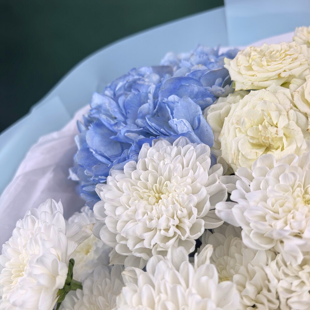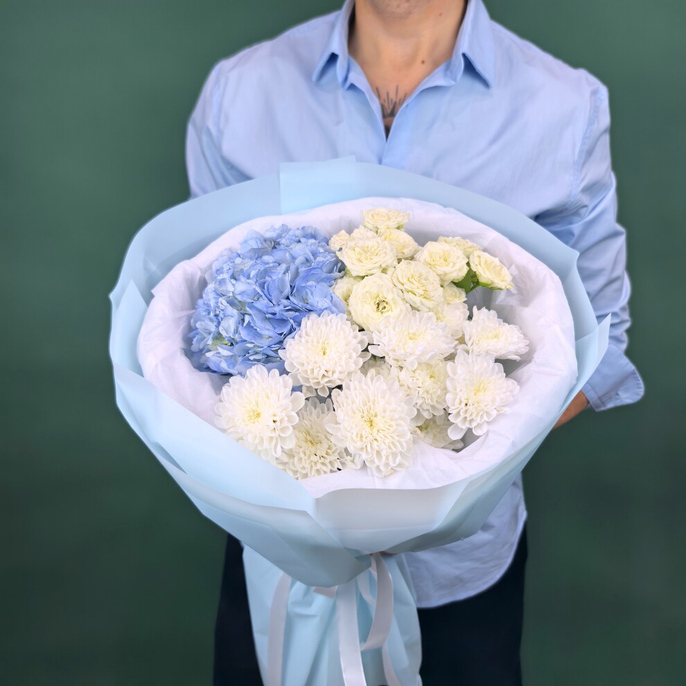 Букет из голубой Гортензии, Хризантемы и кустовых Роз