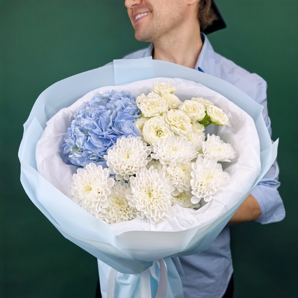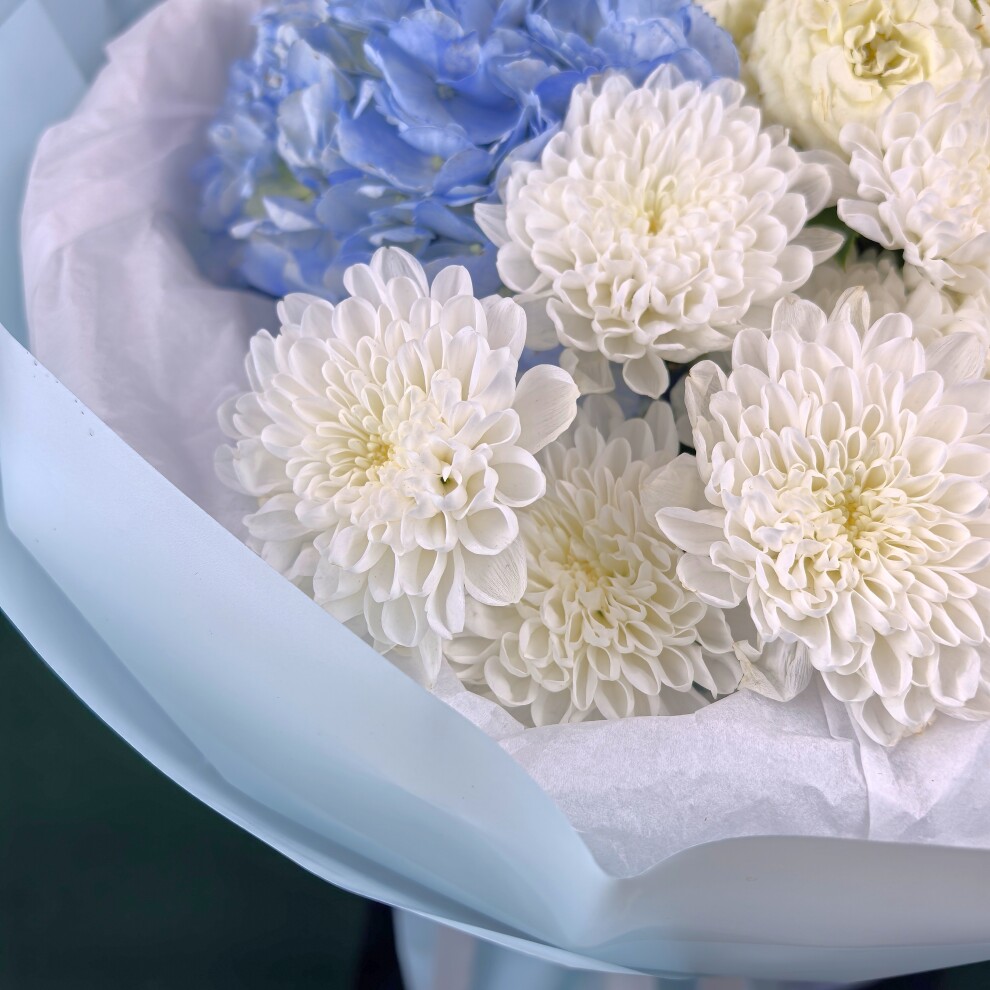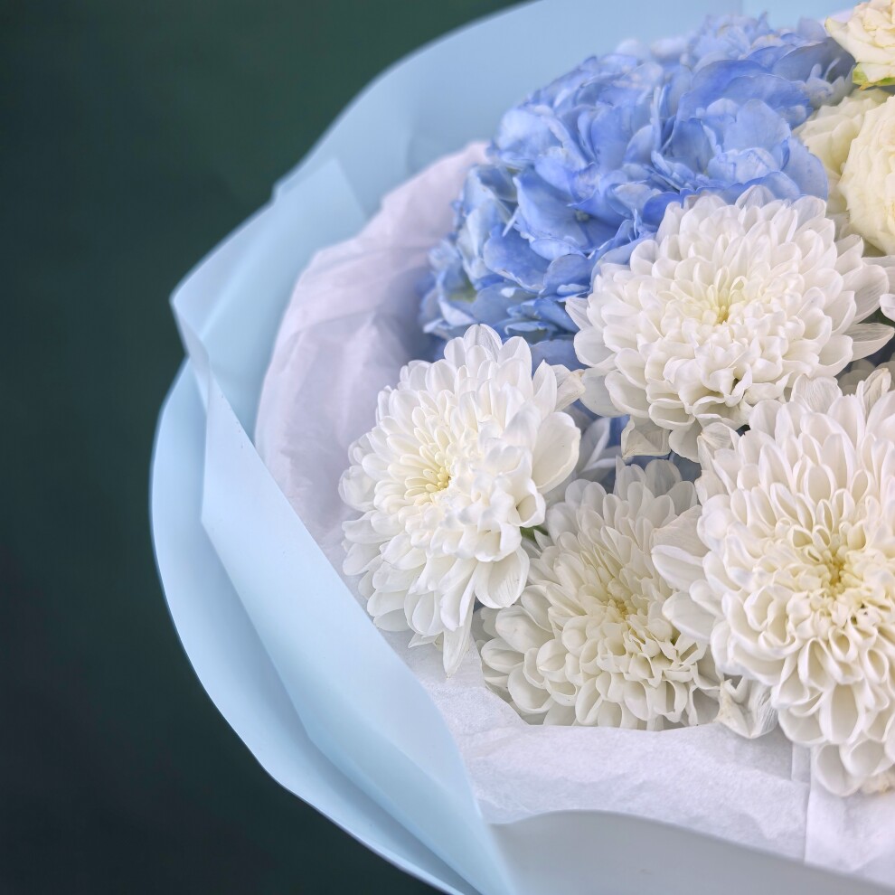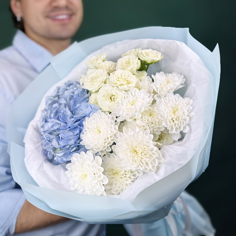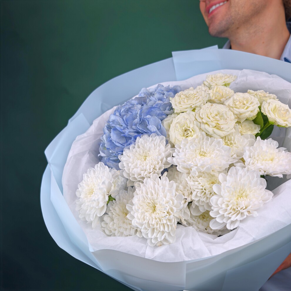 Этот букет — воплощение нежности и утонченности. Белые кустовые хризантемы, словно облачка, создают ощущение чистоты и свежести. Белые розы добавляют романтичности и тепла, а гортензии придают композиции изысканность и легкость.