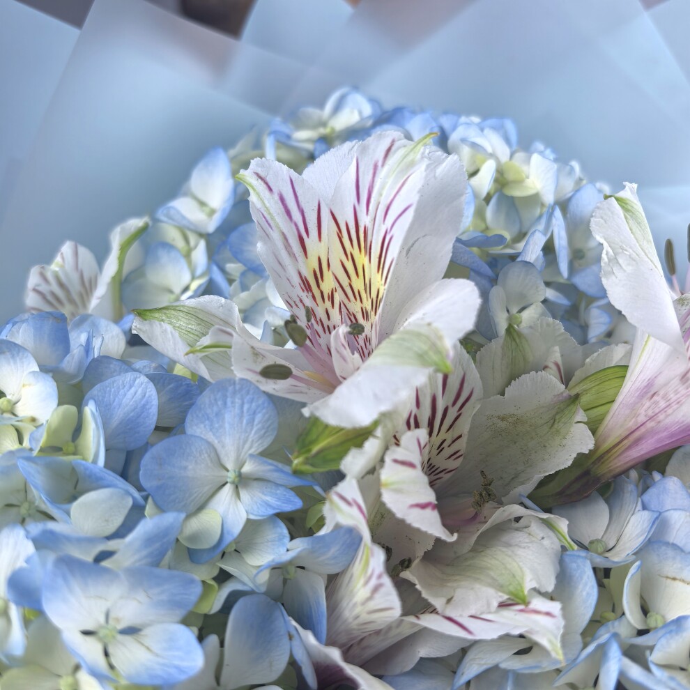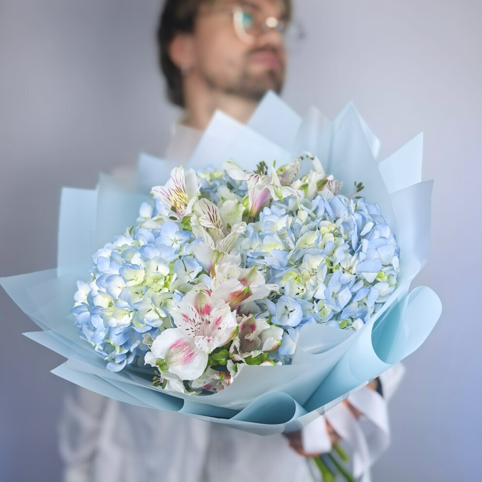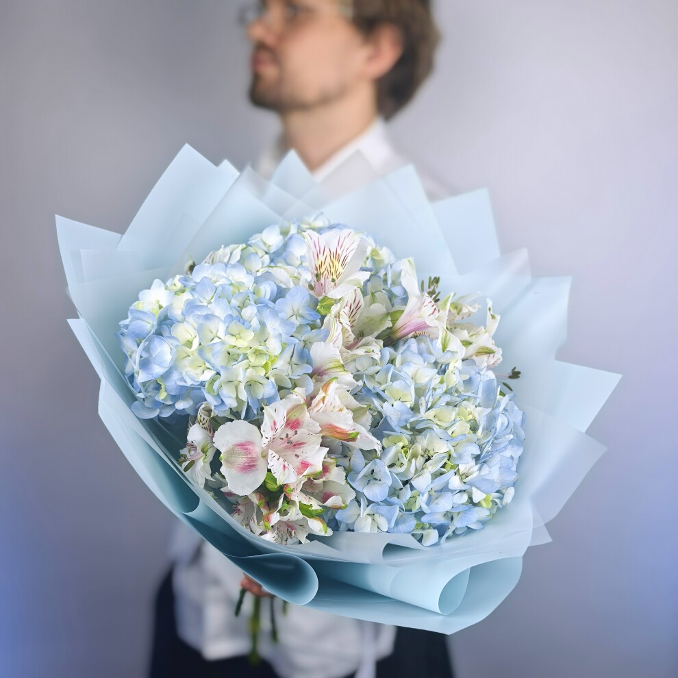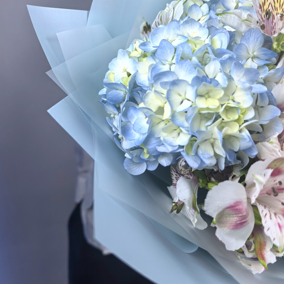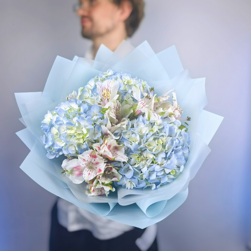 Этот букет — изысканная композиция, в которой гармонично сочетаются голубые гортензии и альстромерии. Гортензии, с их объемными соцветиями, символизируют искренность и сердечность, а альстромерии, с утонченными лепестками, добавляют нежности и преданности.