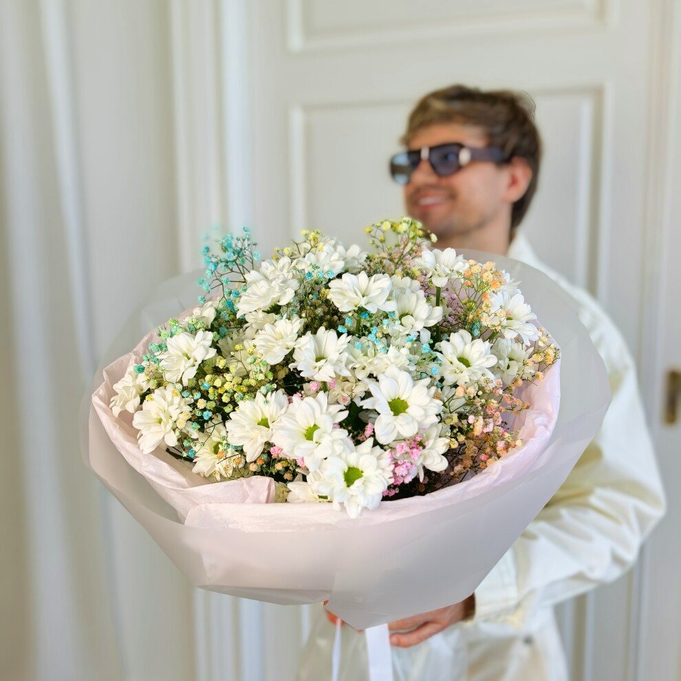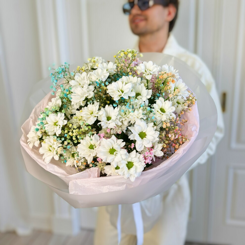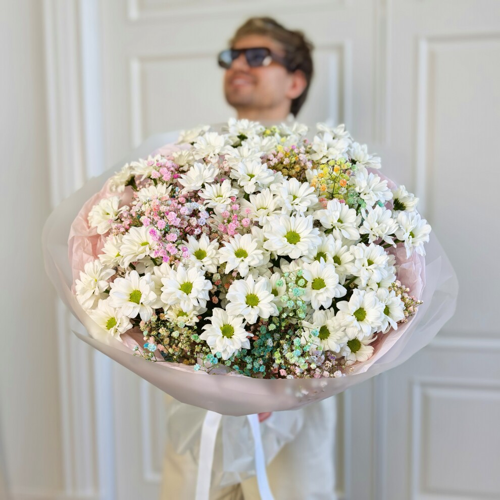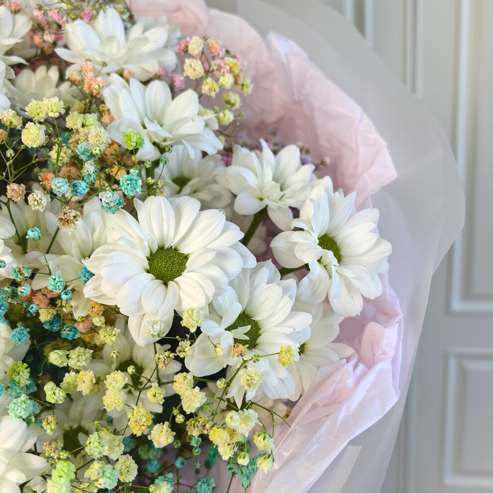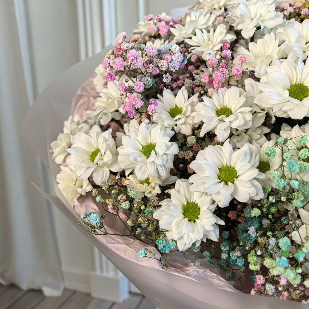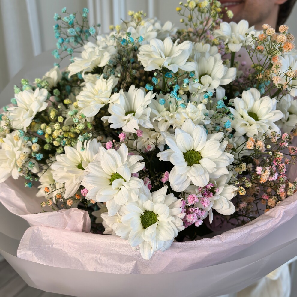В его основе — роскошные белоснежные хризантемы, символизирующие чистоту и благородство. Их пышные соцветия гармонично сочетаются с воздушной гипсофилой, создающей эффект невесомости и утонченности. Изысканные оттенки розового, голубого и зеленого формируют впечатляющую романтическую композицию, а элегантная розовая упаковка придает букету законченный и роскошный вид.