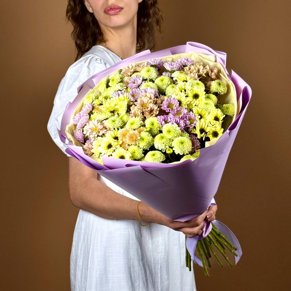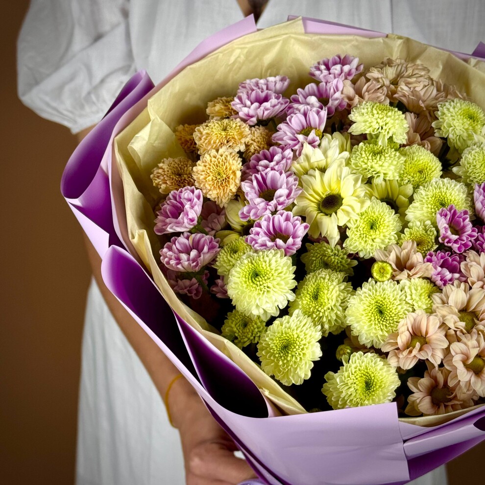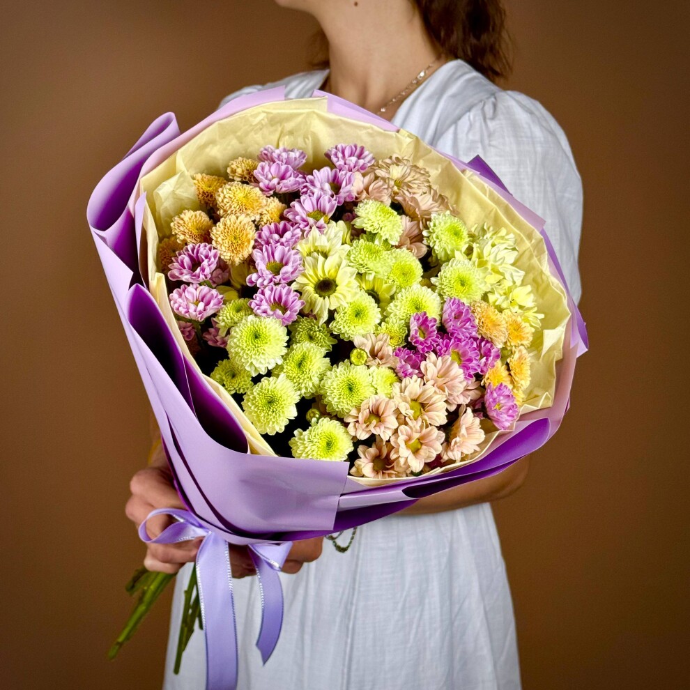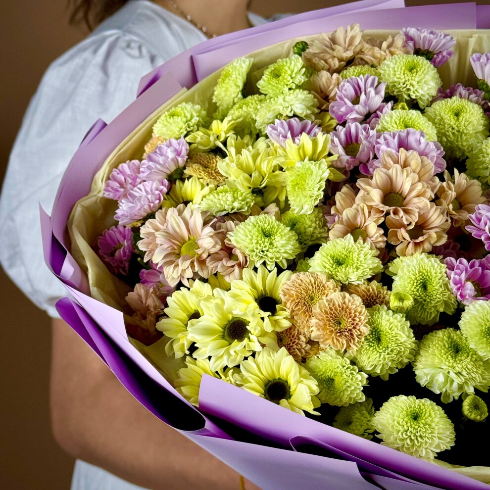 Этот букет — настоящее воплощение нежности и гармонии. Он состоит из кустовых хризантем Сантини, которые радуют глаз своими яркими и нежными оттенками. В композиции преобладают светло-зелёные и жёлтые цветы, создающие ощущение свежести и радости. Среди них встречаются сиреневые и кремовые оттенки, добавляющие букету изысканности и утончённости.