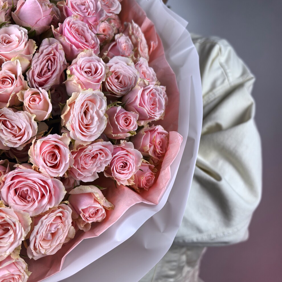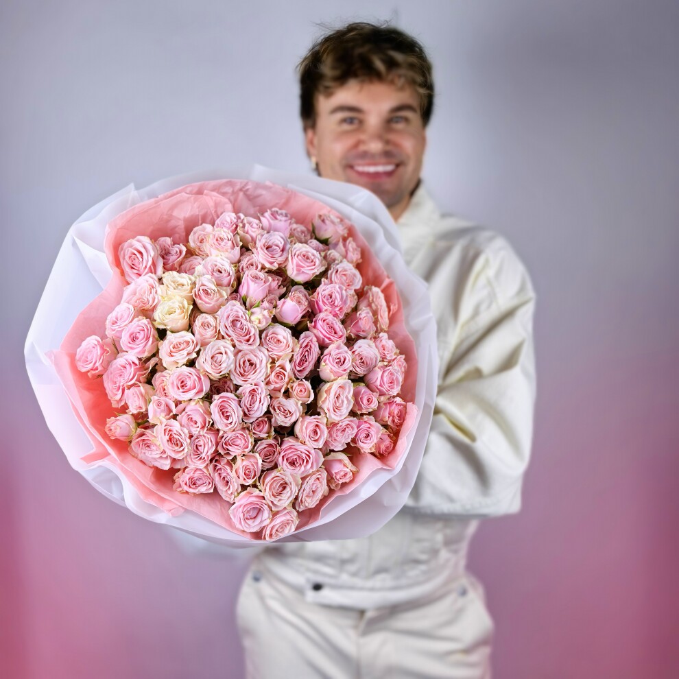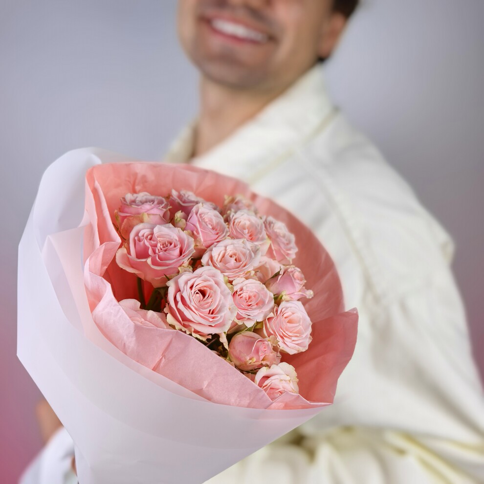 Этот великолепный букет из нежно-розовых кустовых роз — истинное воплощение элегантности и природной красоты.