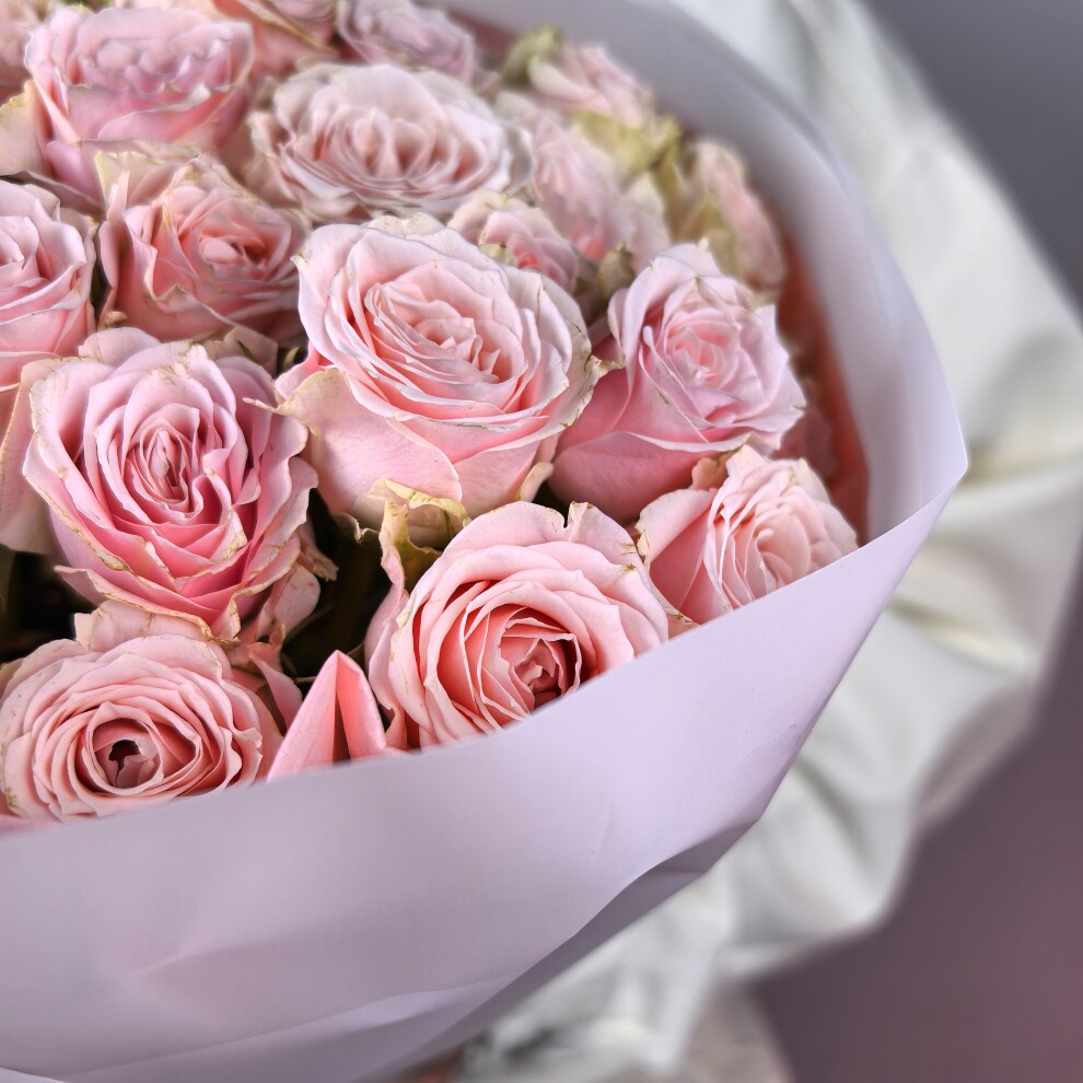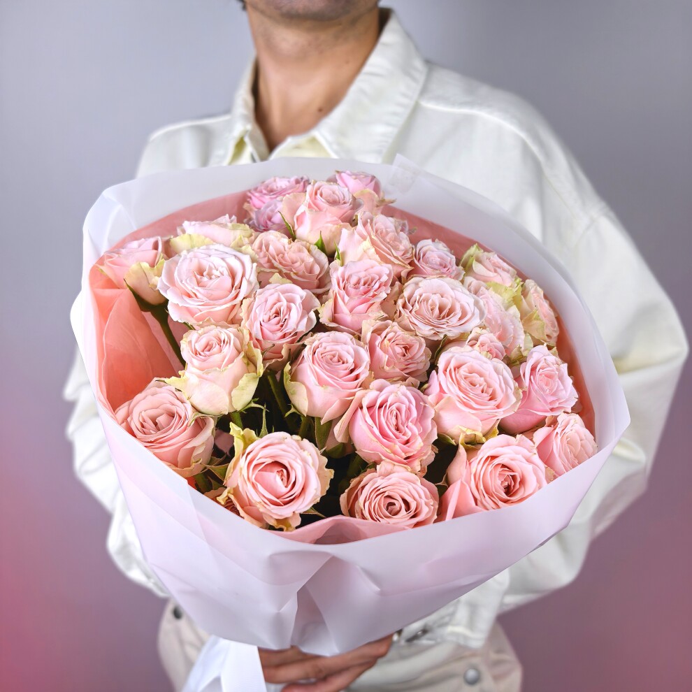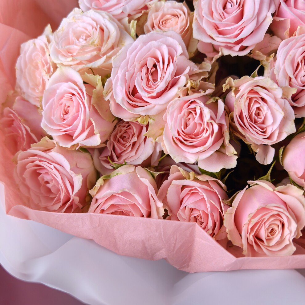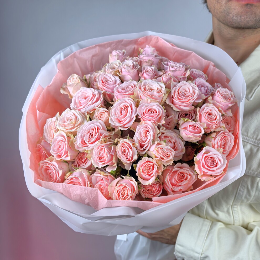 Этот великолепный букет из нежно-розовых кустовых роз — истинное воплощение элегантности и природной красоты.