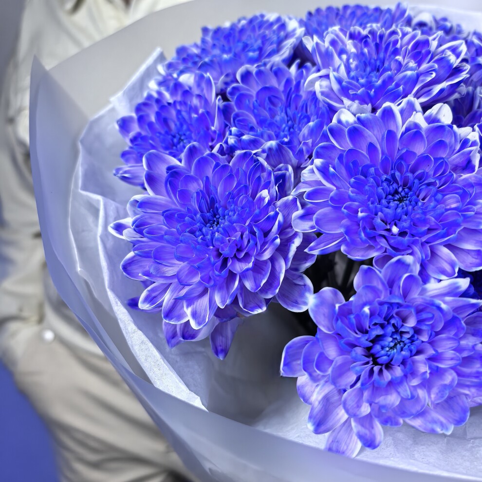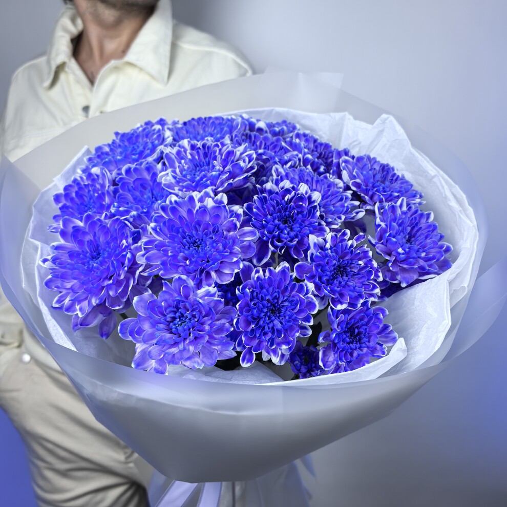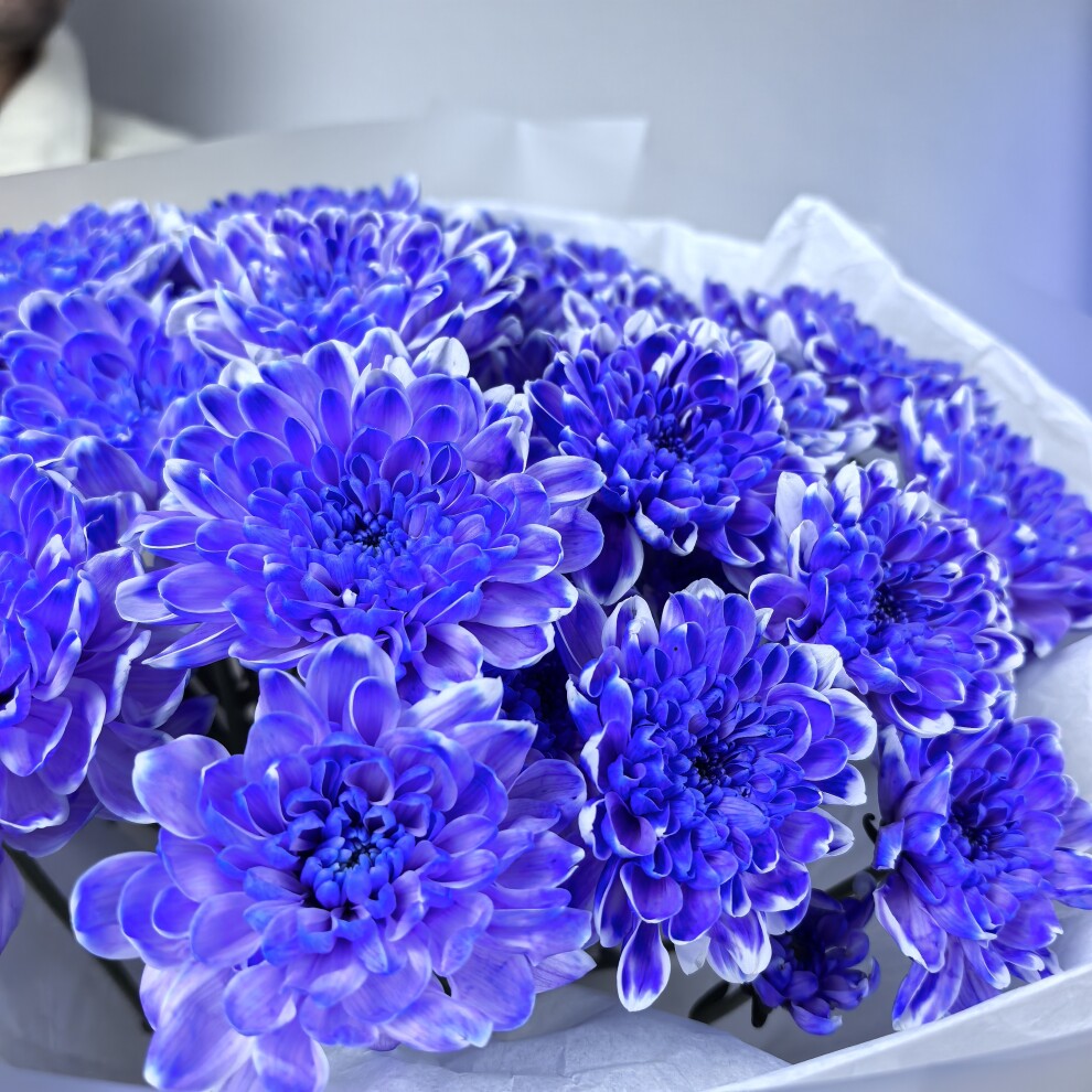 Этот букет состоит из множества синих хризантем, которые создают нежный и элегантный образ.