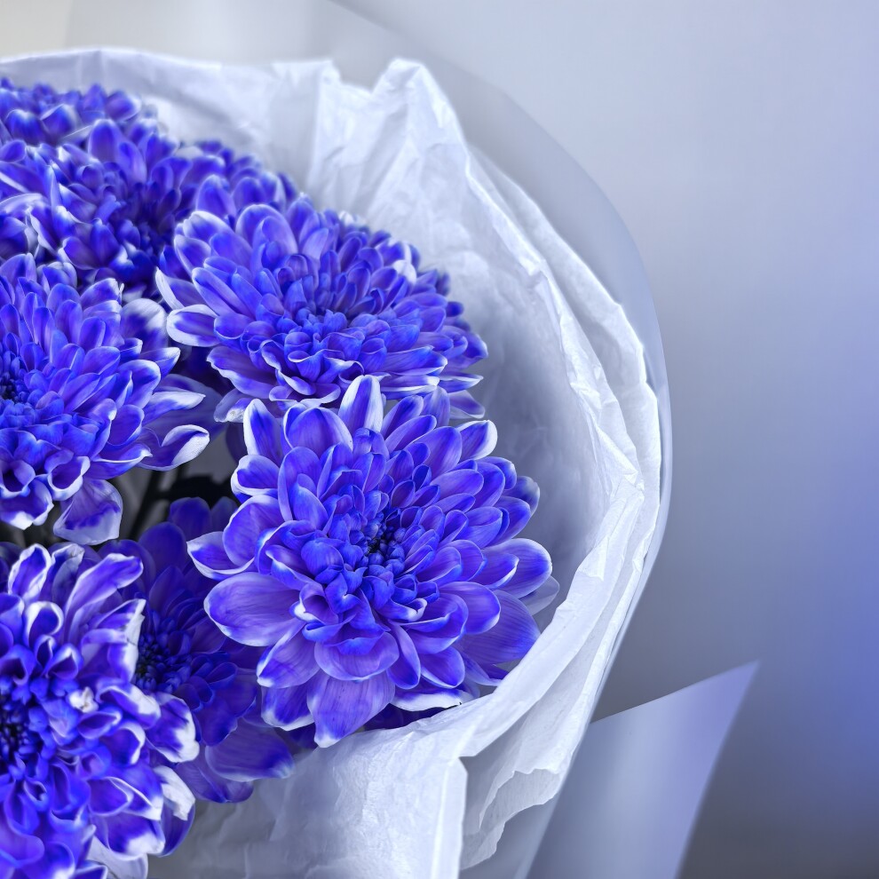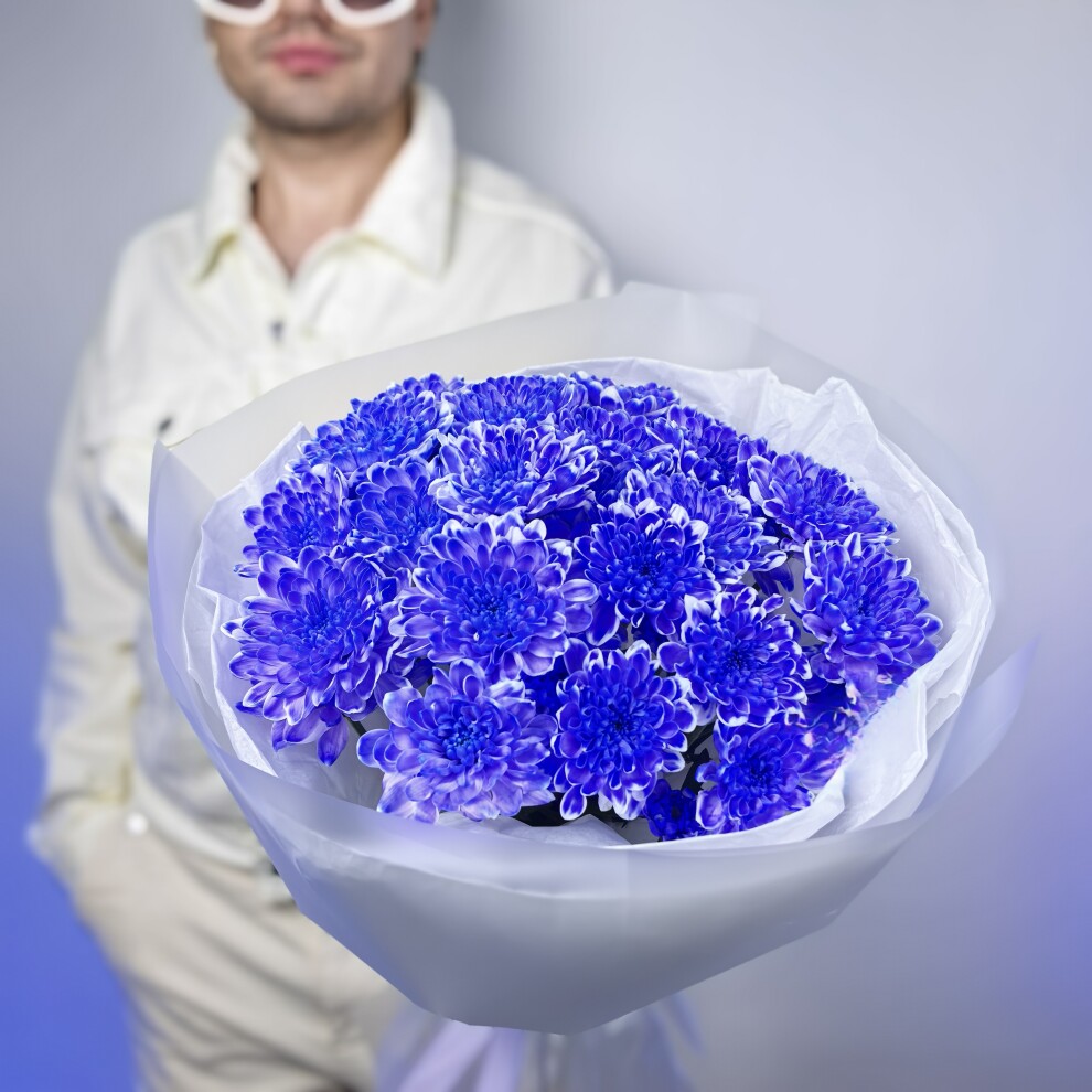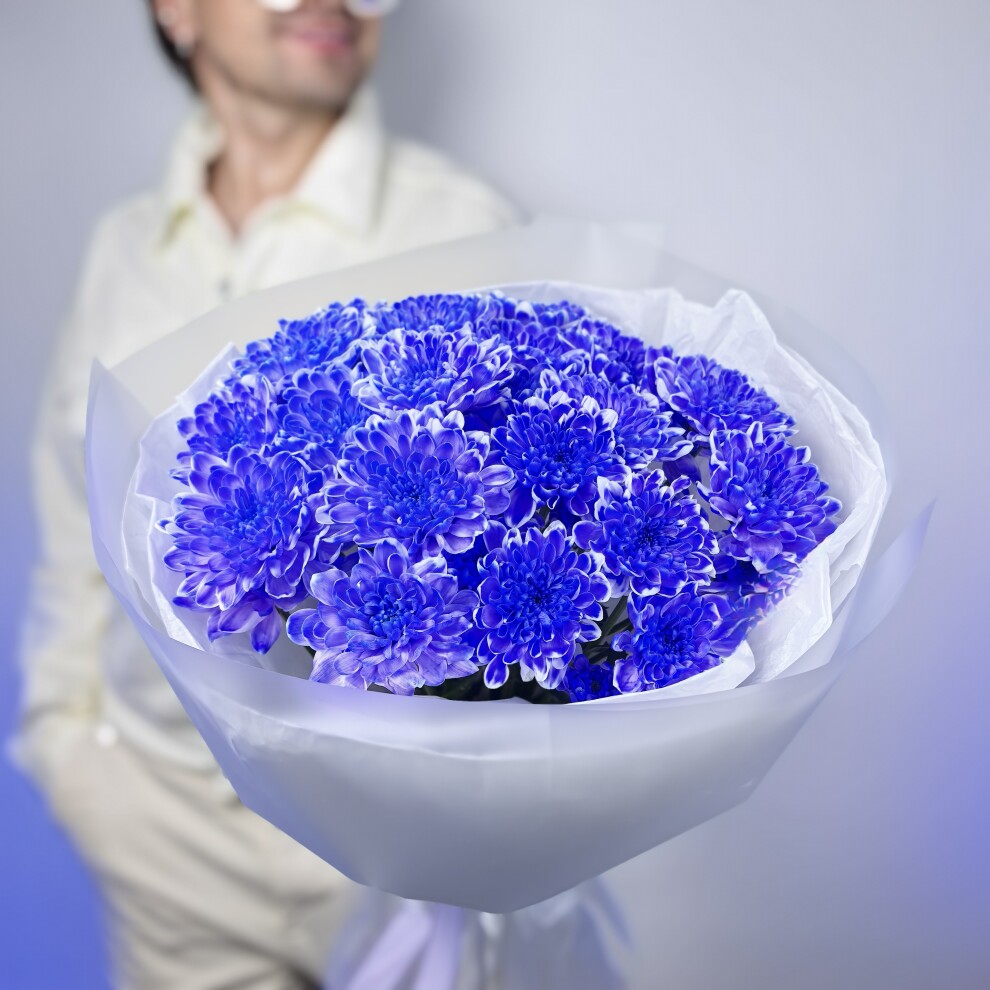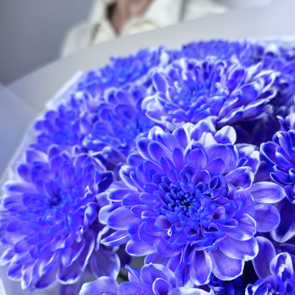 Этот букет состоит из множества синих хризантем, которые создают нежный и элегантный образ.