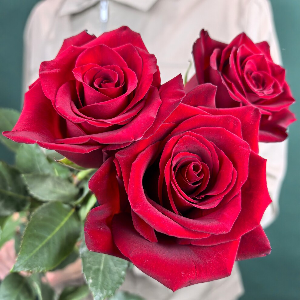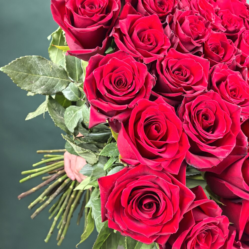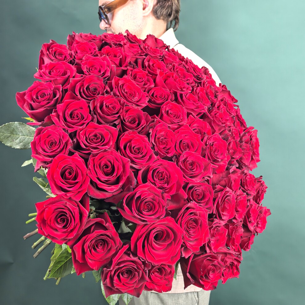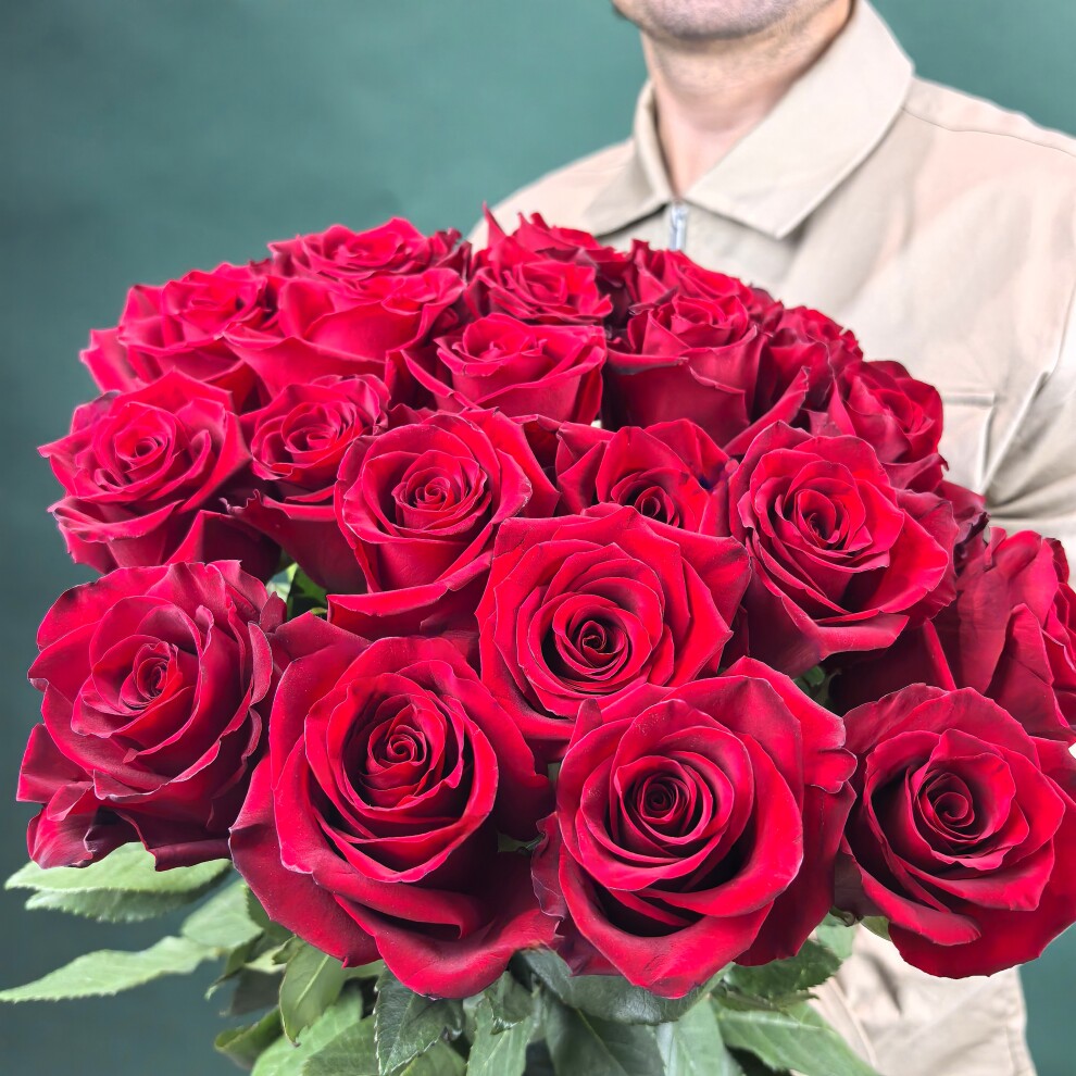 Этот букет — воплощение роскоши и страсти. Насыщенный красный цвет и бархатистые лепестки создают ощущение тепла и любви.