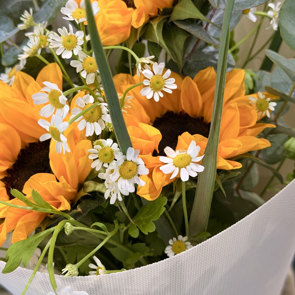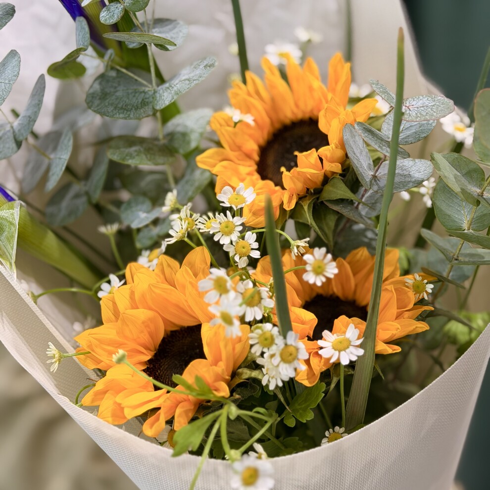 Зелёные веточки эвкалипта гармонично объединяют все элементы букета, придавая ему объём, свежесть и лёгкую прохладу. Их округлые листья создают текстурный контраст с крупными подсолнухами и нежными ромашками.