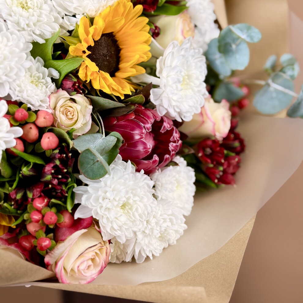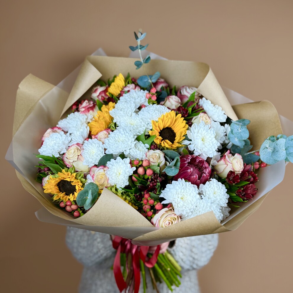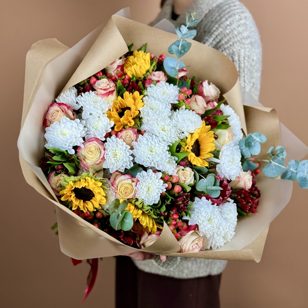 Ярким акцентом выступают подсолнухи с насыщенными жёлтыми лепестками и выразительными тёмными сердцевинами. Они привносят в композицию солнечное настроение и нотку деревенского шарма, делая букет по-настоящему живым и энергичным.