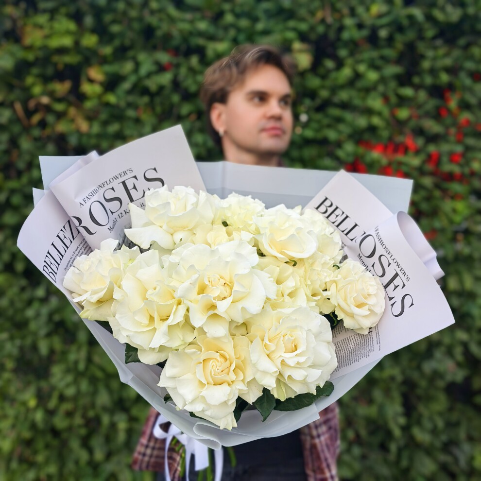 Каждая роза в этом букете — как маленькое чудо, которое приносит радость и вдохновение. Они идеально подойдут для свадьбы, юбилея или просто чтобы выразить свои чувства. Белые розы говорят о чистоте намерений и глубине эмоций, делая этот букет универсальным и трогательным подарком.