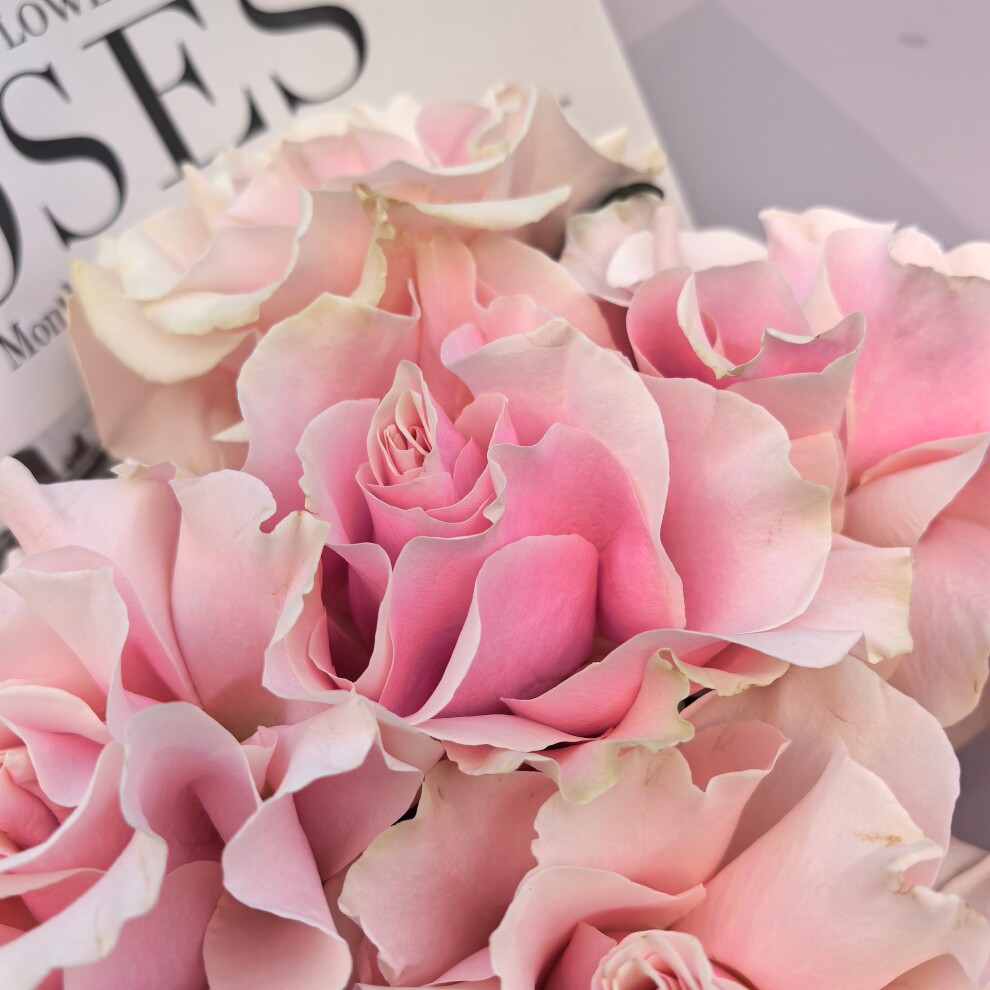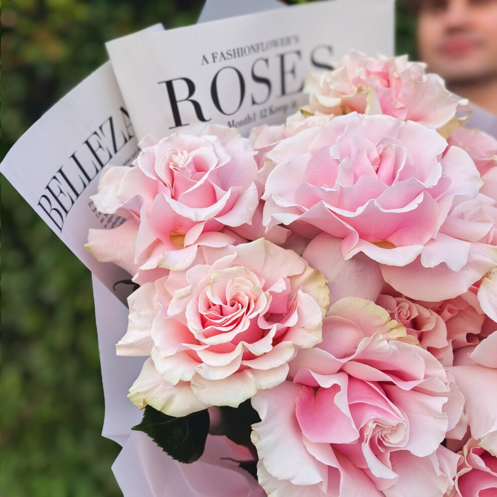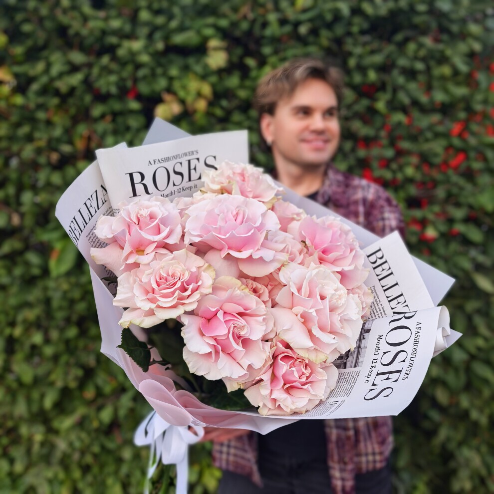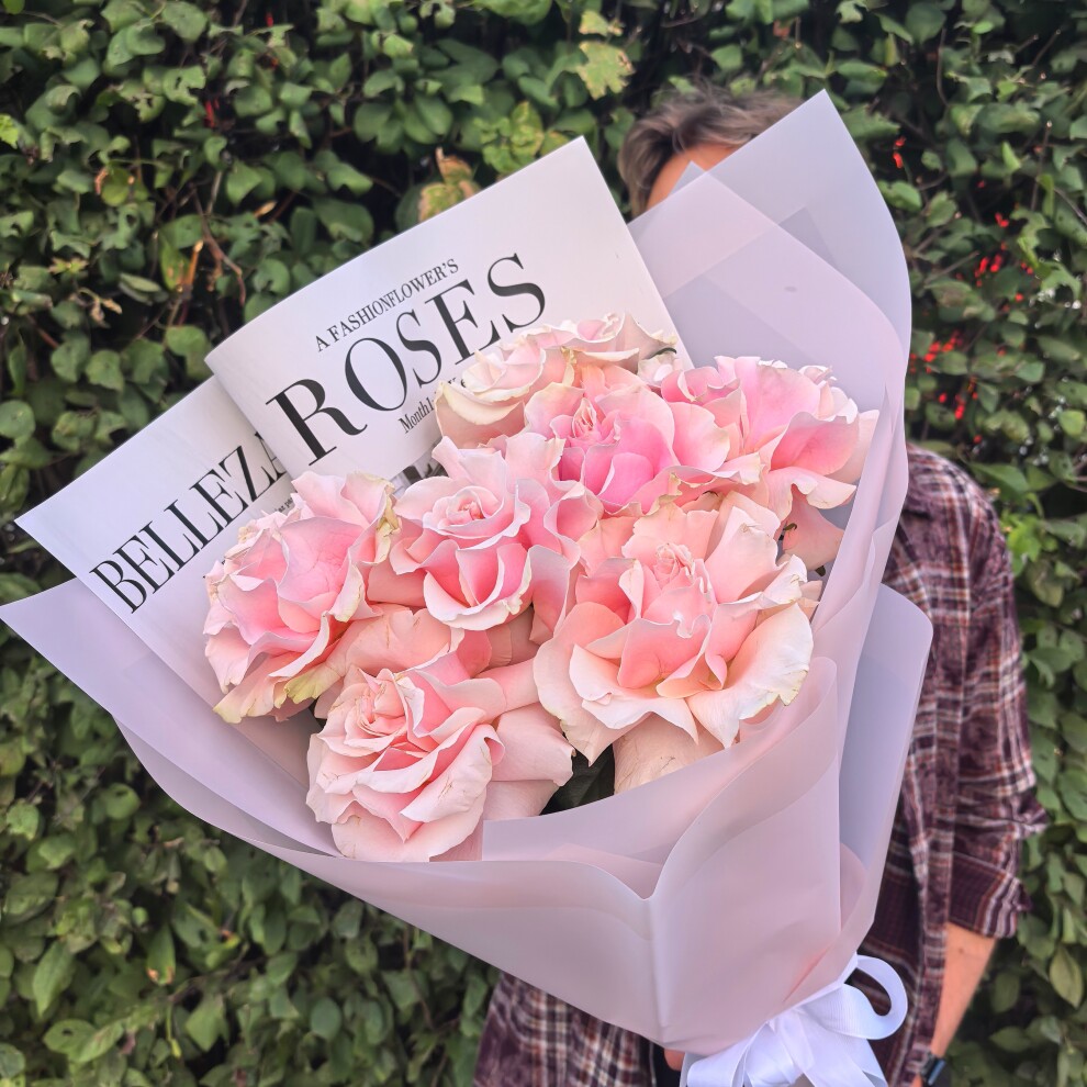 Этот букет из нежно-розовых французских роз — воплощение утончённой красоты и романтики. Каждый цветок словно создан для того, чтобы дарить радость и тепло. Их мягкие лепестки, переливающиеся оттенками от кремового до розового, напоминают о первых лучах весеннего солнца.