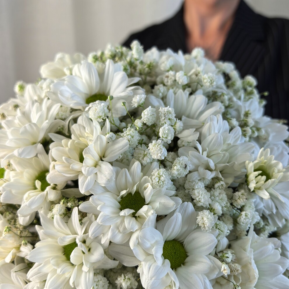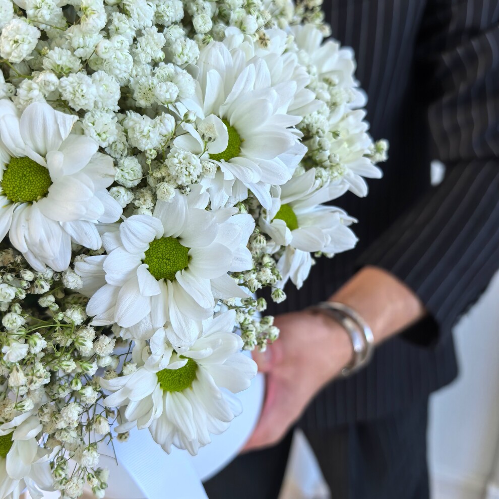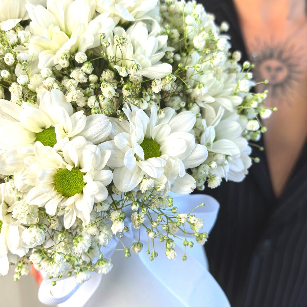 Эта композиция в флористической губке — воплощение нежности и утончённости. В её основе лежат крупные белые ромашки, которые гармонично сочетаются с мелкими цветами гипсофилы, создавая эффект воздушности.