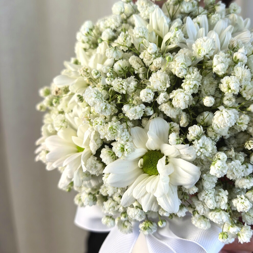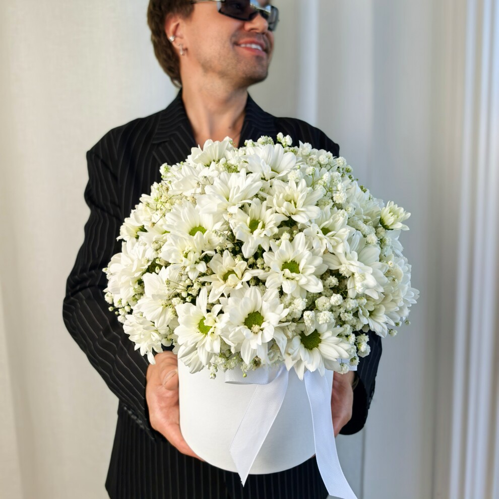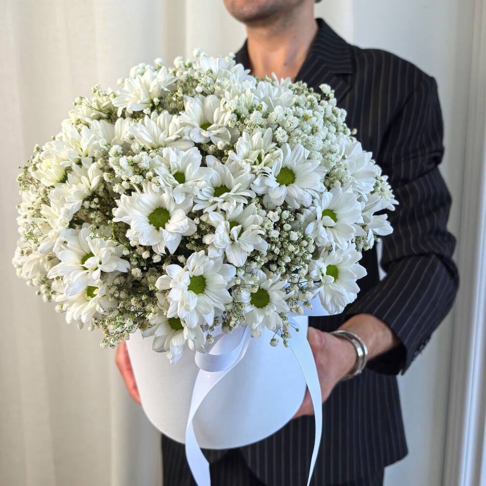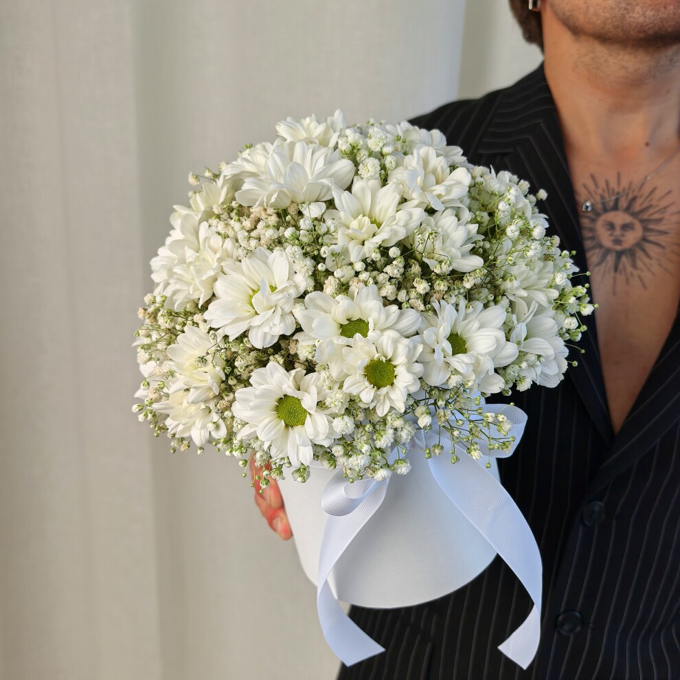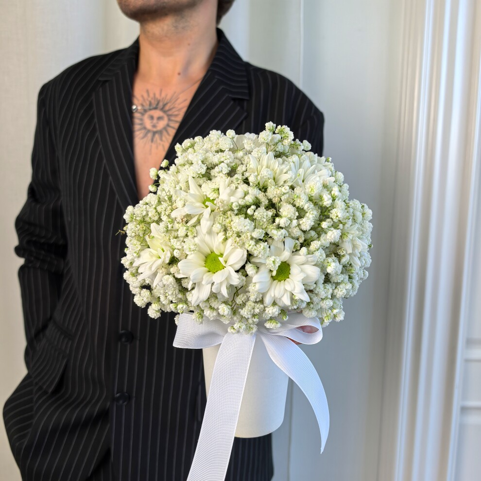 Шляпная коробка из белой Хризантемы и белой Гипсофилы