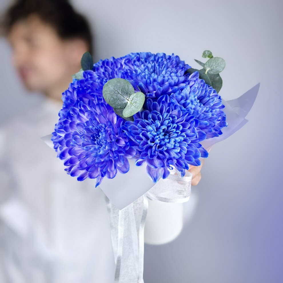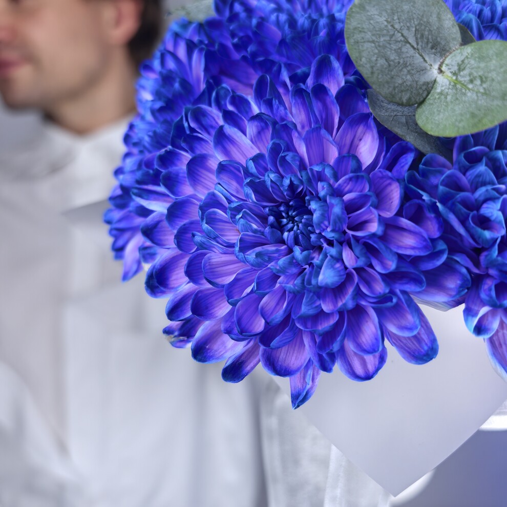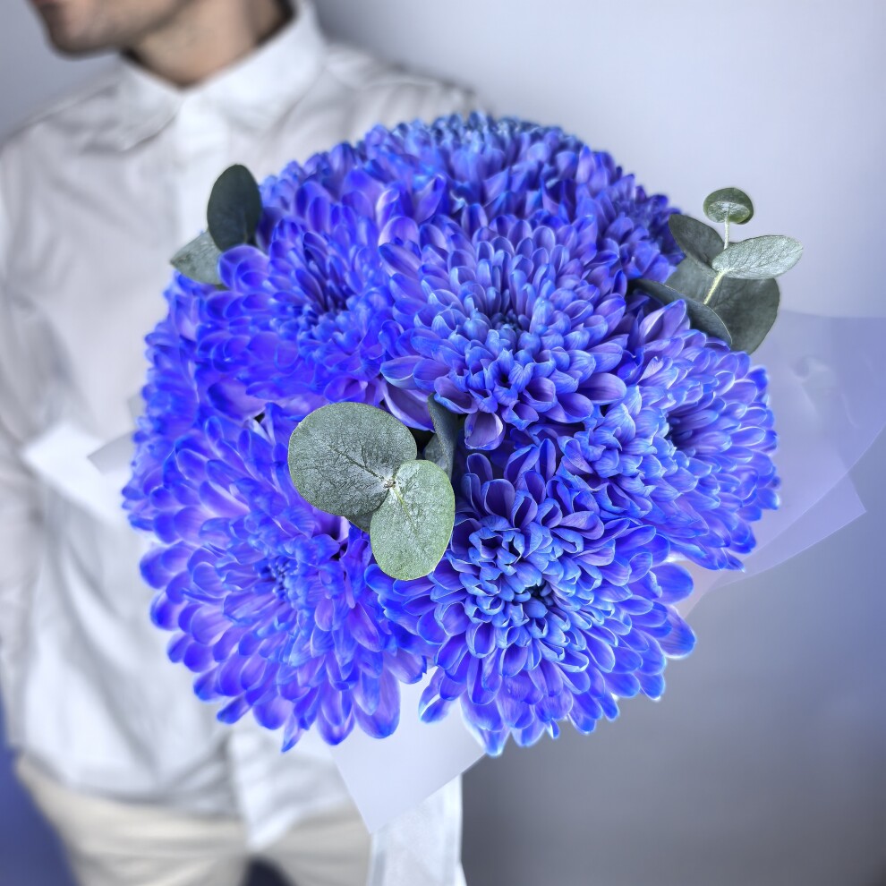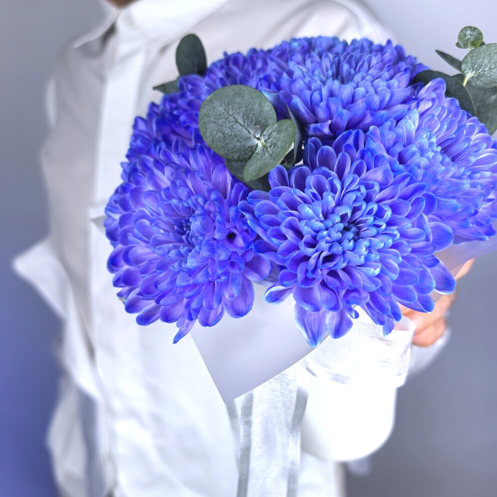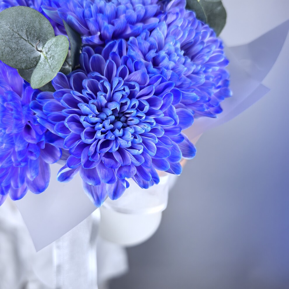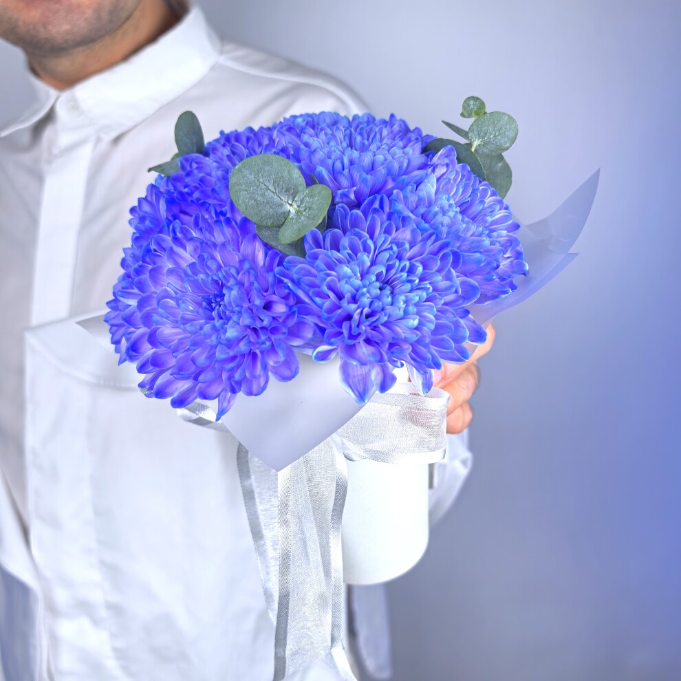 Эта композиция из синих хризантем — воплощение элегантности и утончённости.