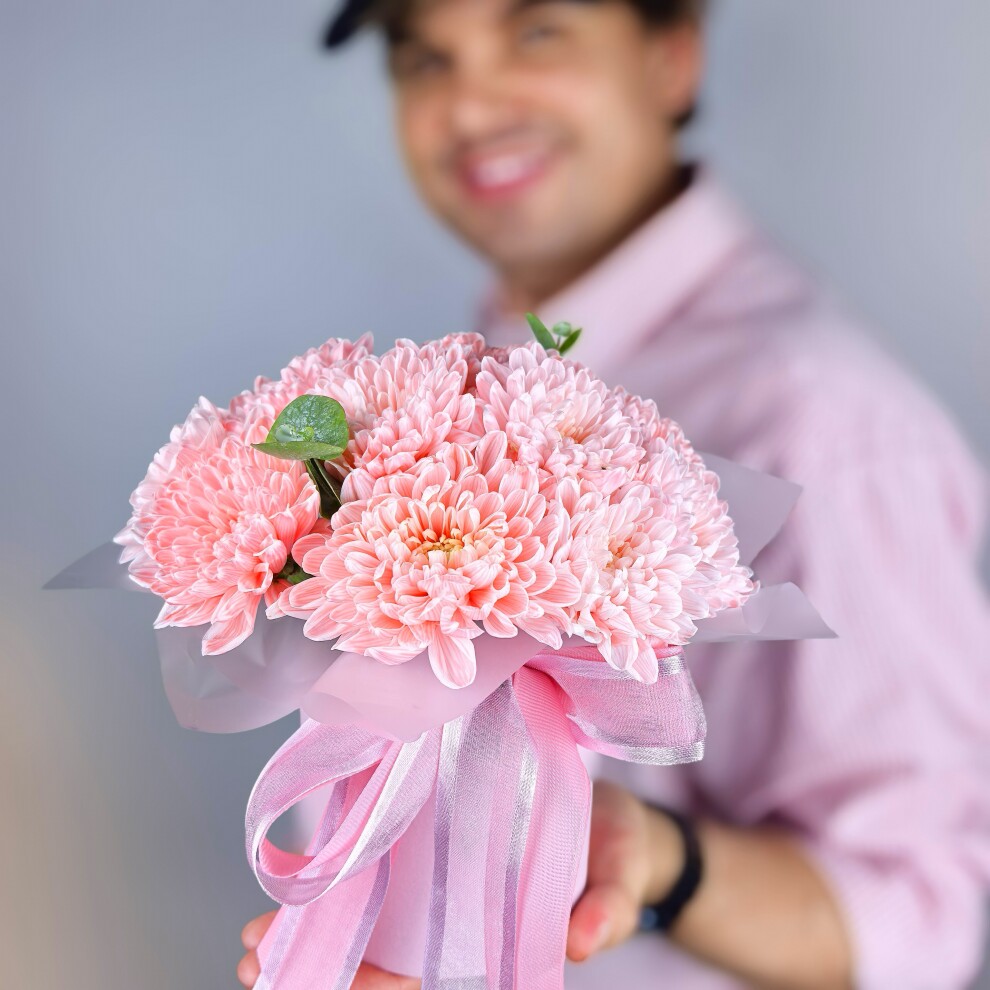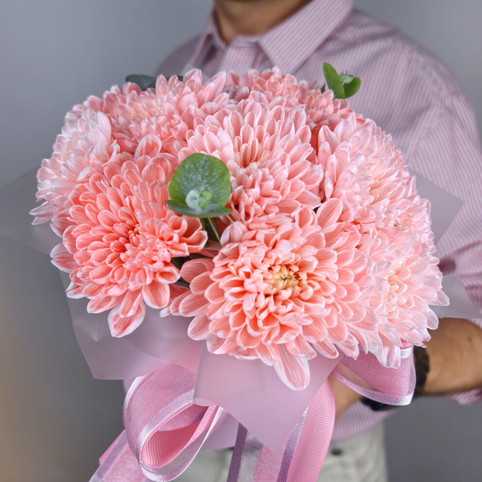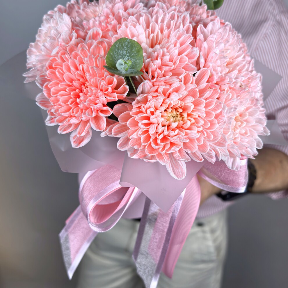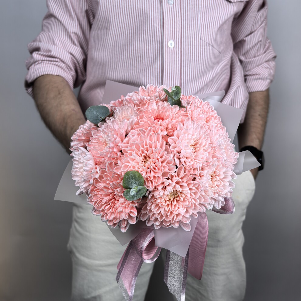 Этот букет — воплощение нежности и утончённости. Пышные розовые хризантемы, словно облака, наполняют композицию теплом и мягкостью.