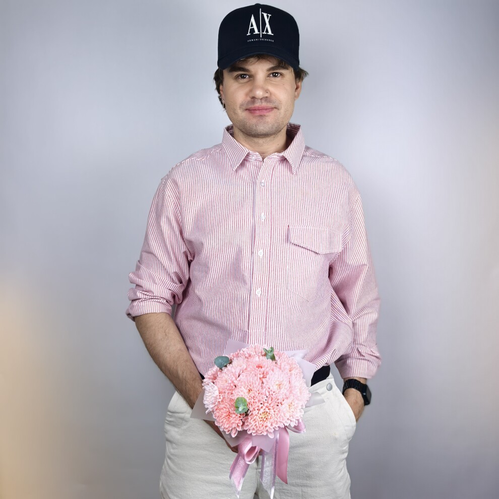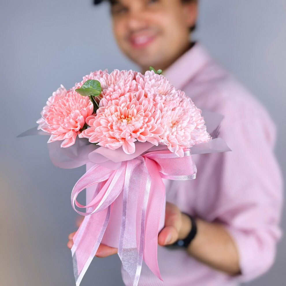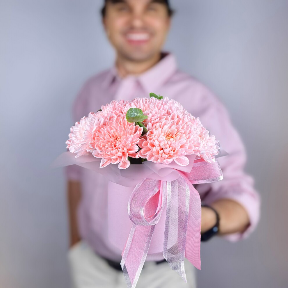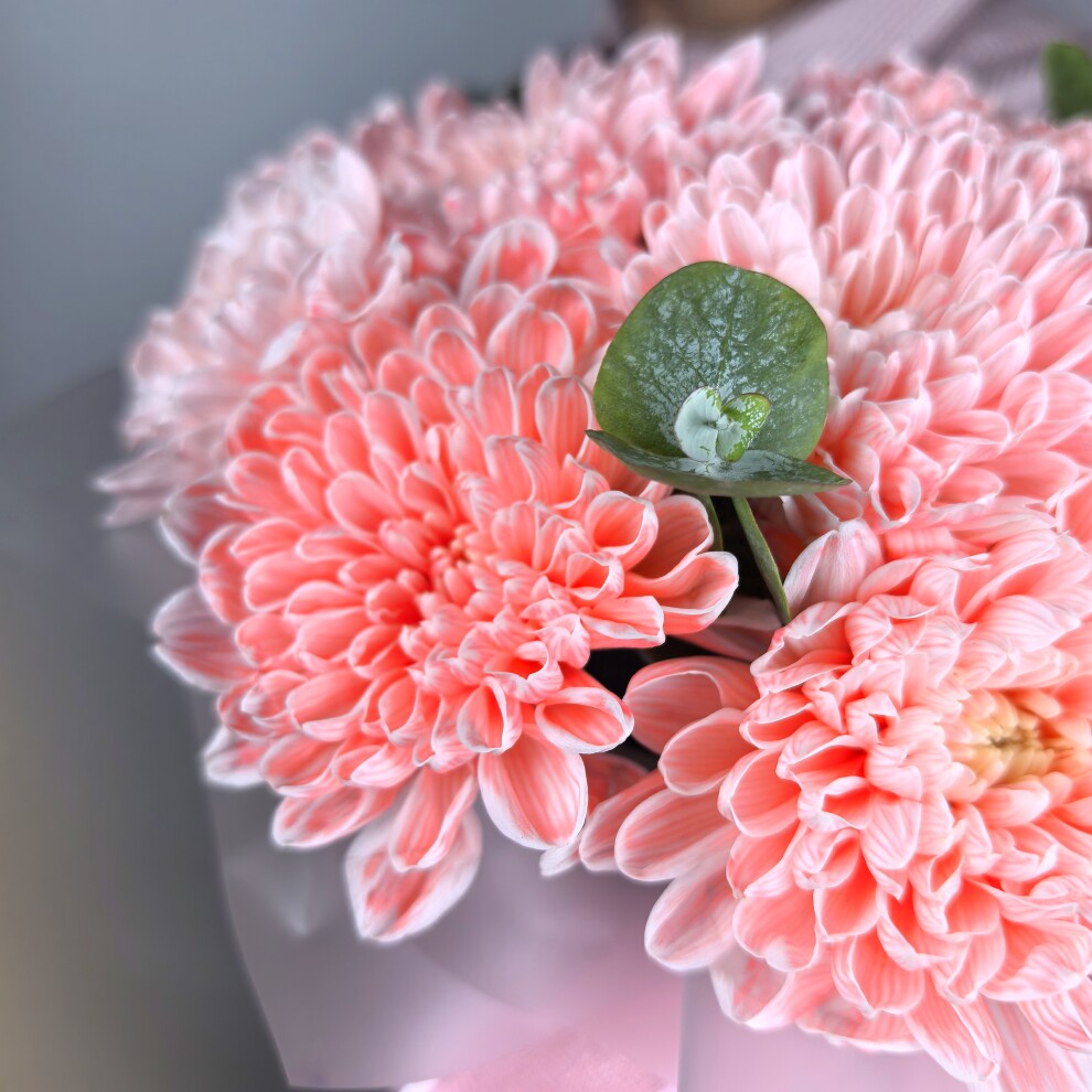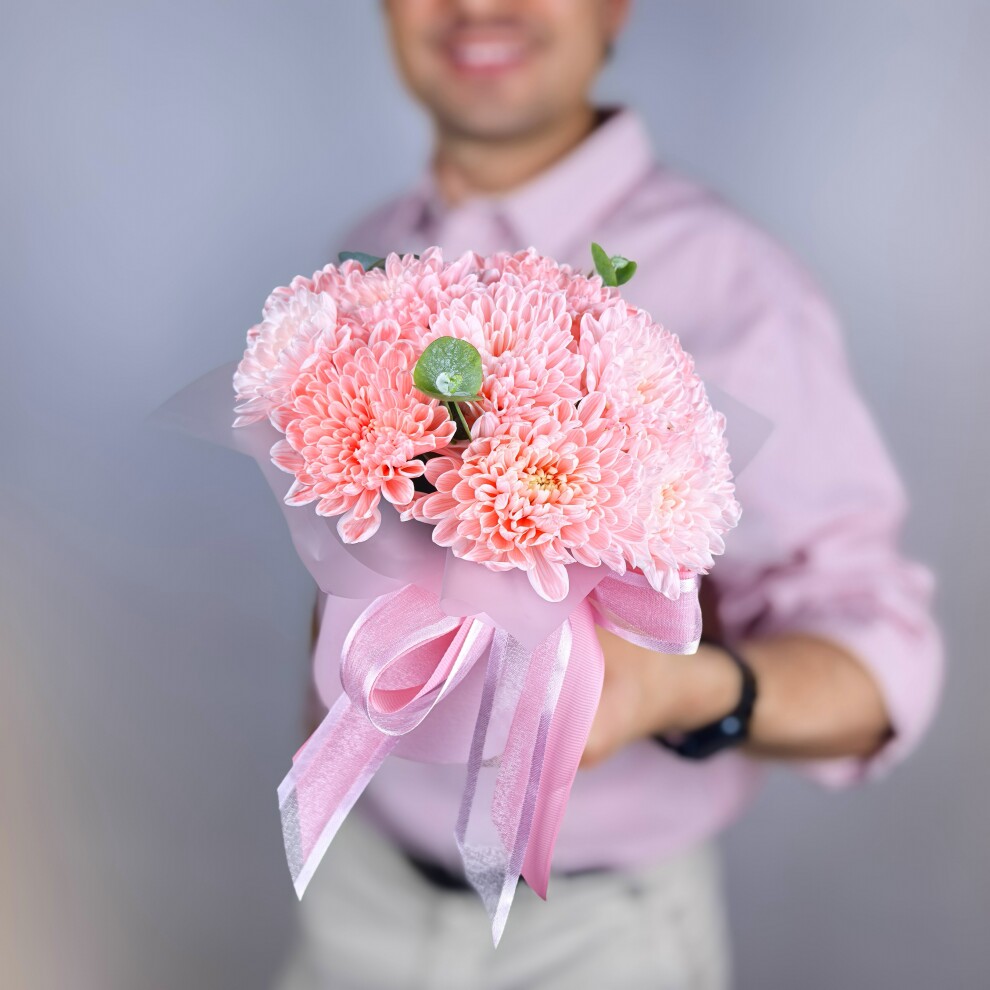 Этот букет — воплощение нежности и утончённости. Пышные розовые хризантемы, словно облака, наполняют композицию теплом и мягкостью.