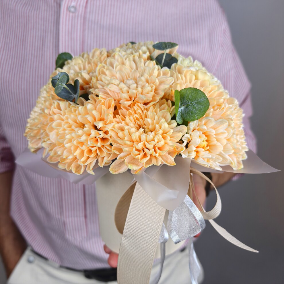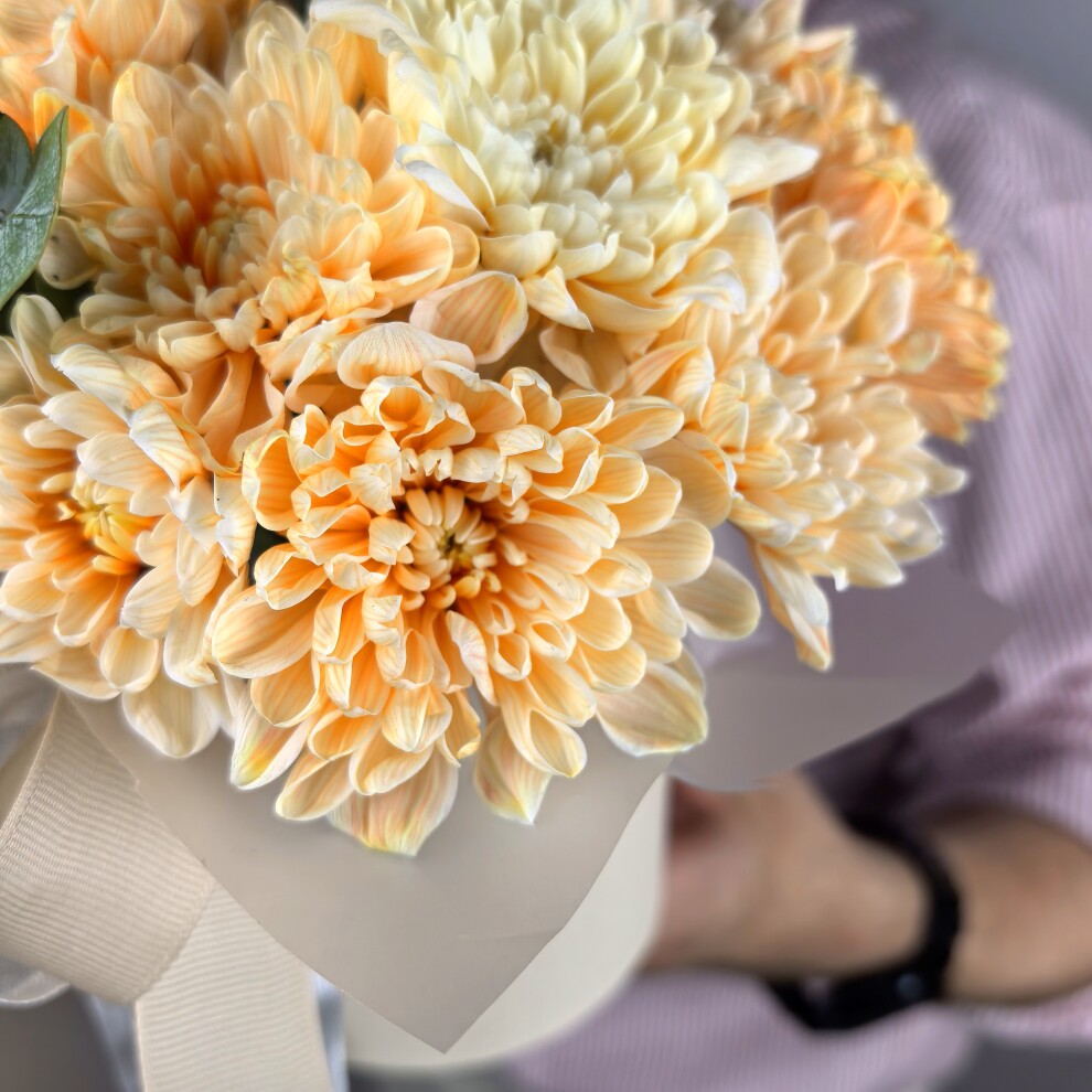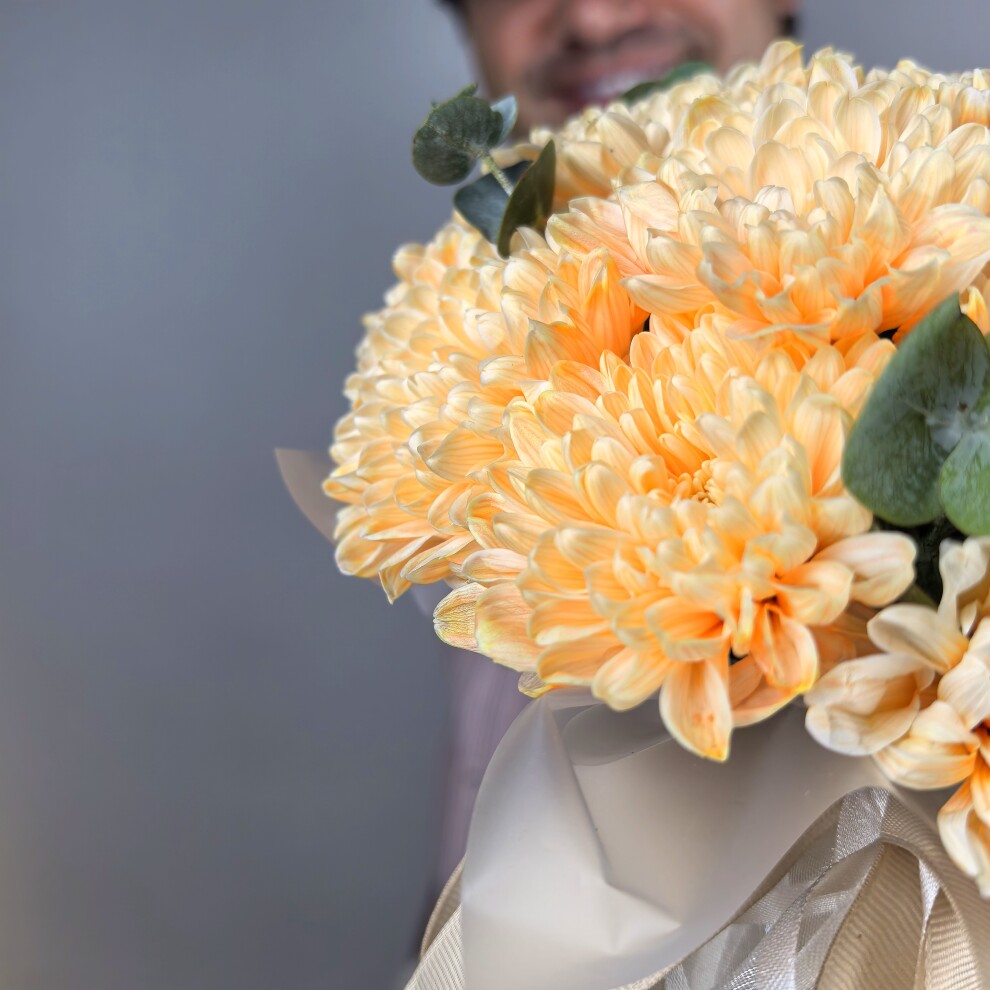 Этот букет — воплощение нежности и утончённости. Пышные персиковые хризантемы, словно облака, наполняют композицию теплом и мягкостью.