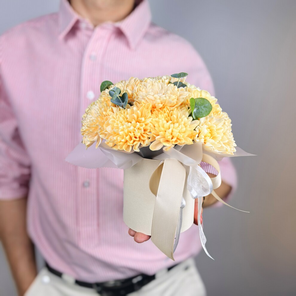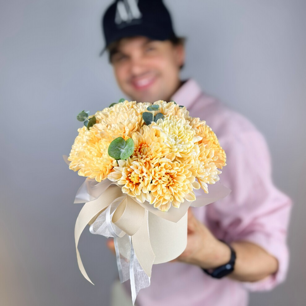Композиция в шляпной коробке S с персиковой Хризантемой