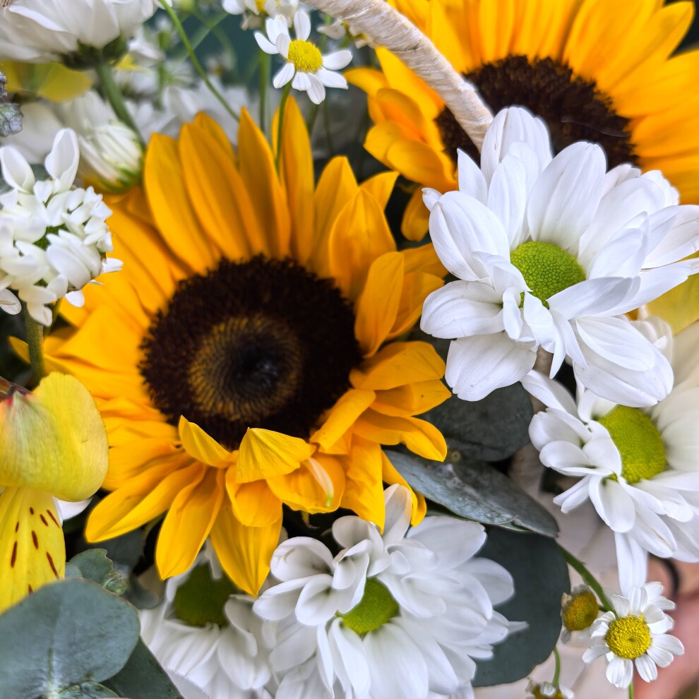 - Хризантема кустовая, Альстромерия, Подсолнух, Эвкалипт, Танацетум