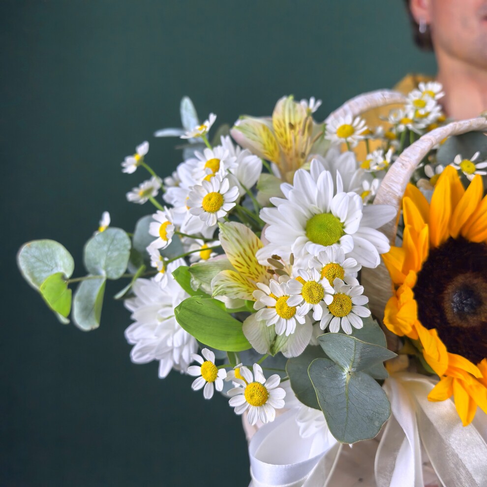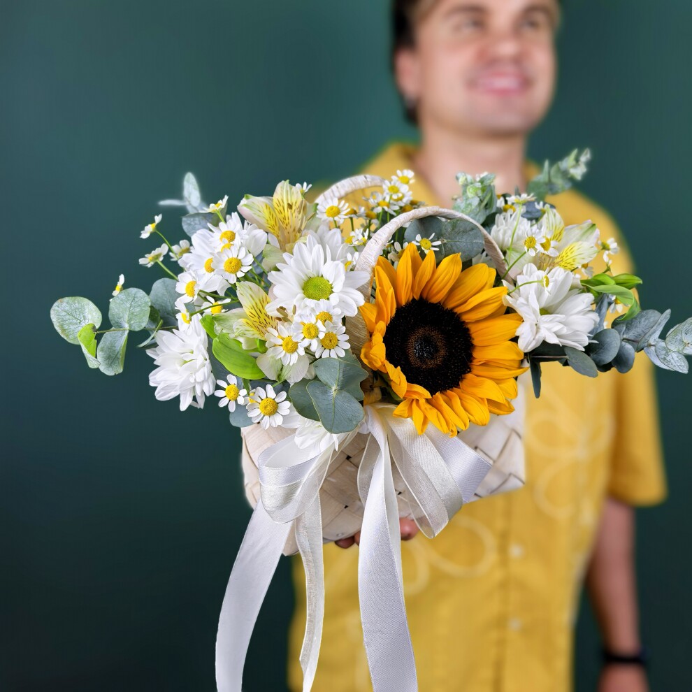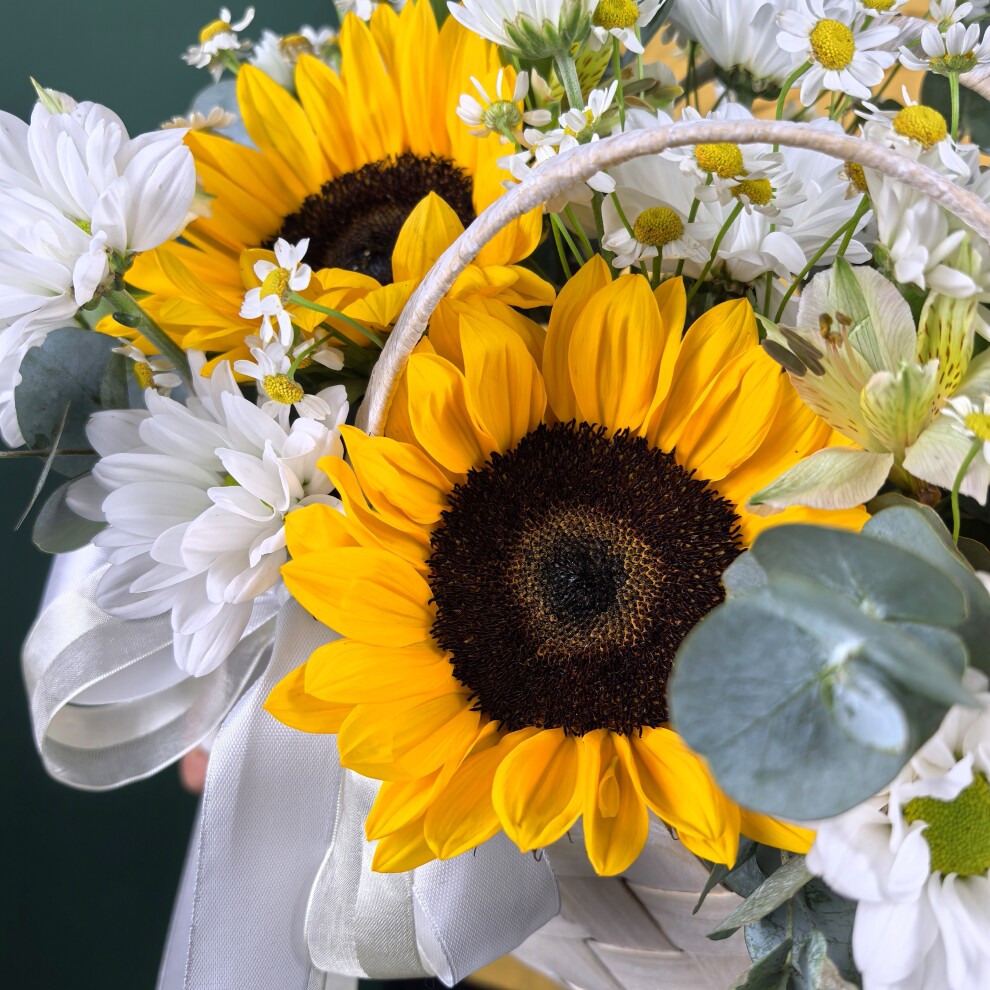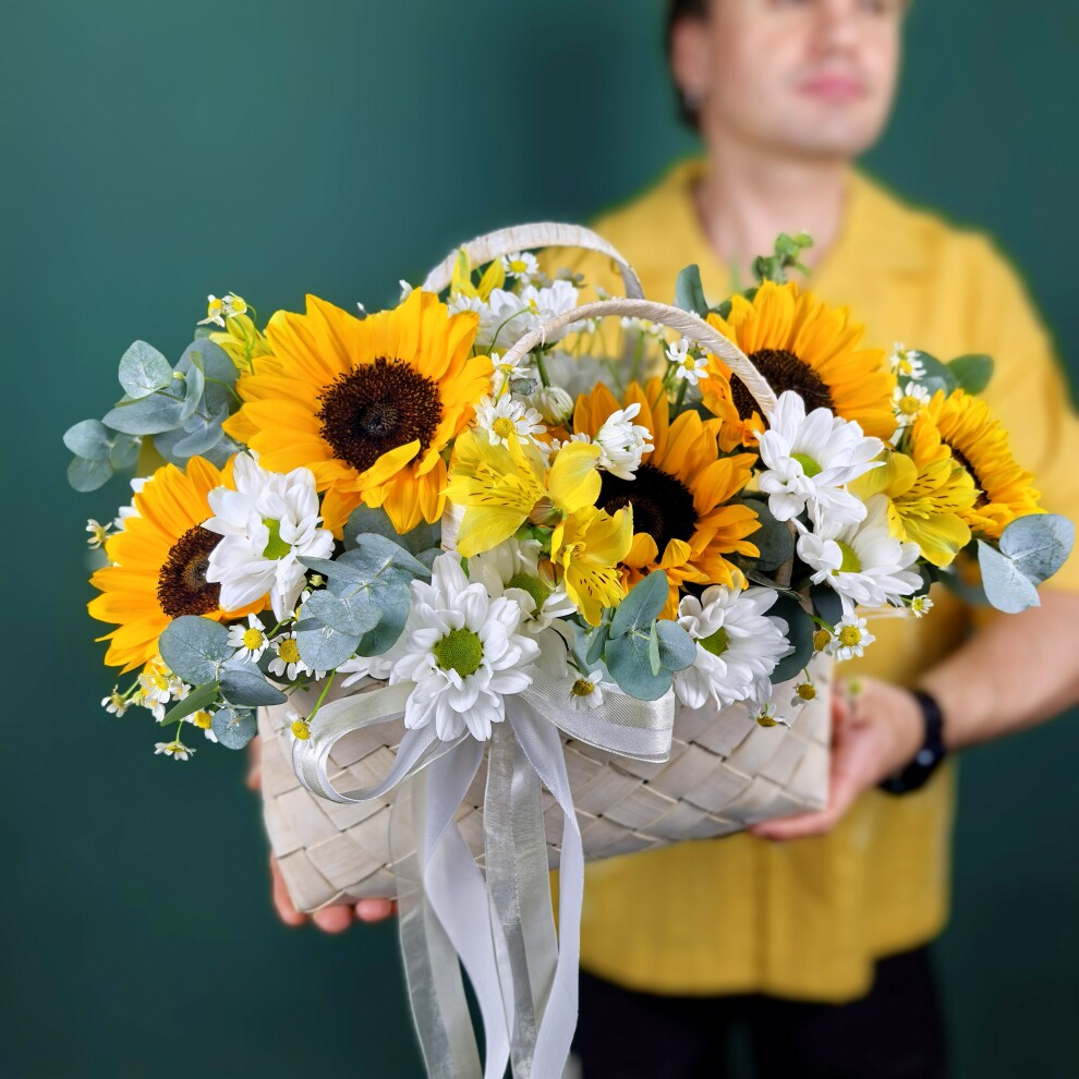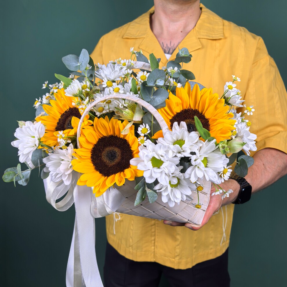 Эта композиция в корзине — воплощение солнечного настроения и природной гармонии.
