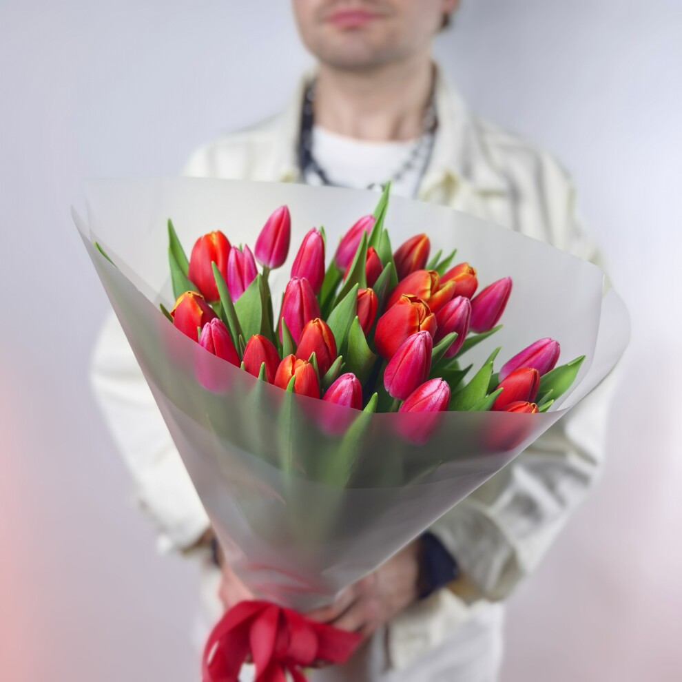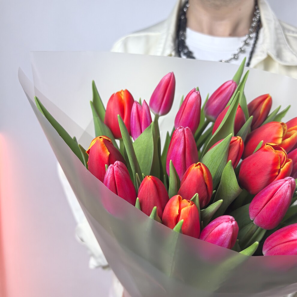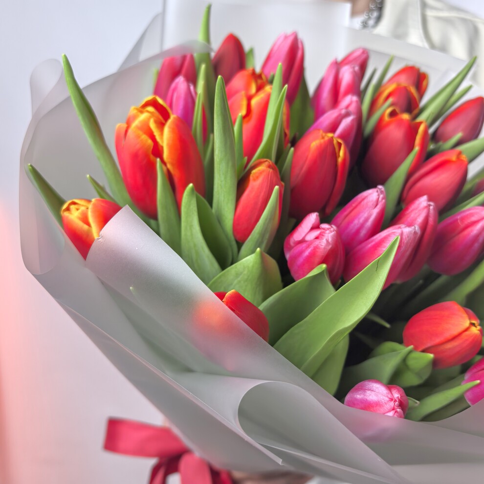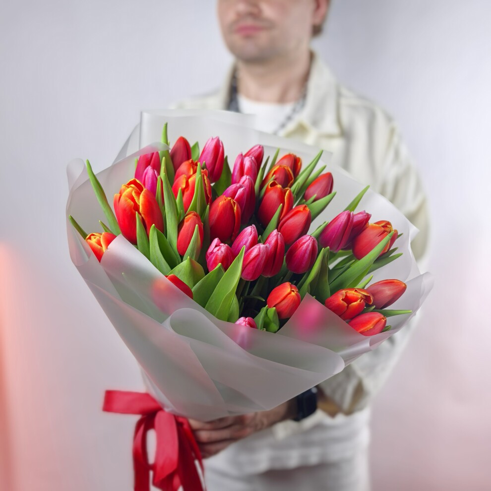 Этот величественный букет из 35 тюльпанов — истинное воплощение весенней роскоши и яркости! Композиция поражает насыщенностью оттенков: здесь гармонично сочетаются глубокие красные и нежно-розовые бутоны, а некоторые цветы украшены выразительными жёлто-оранжевыми переливами у основания лепестков. Такое сочетание создаёт эффектный, но при этом гармоничный контраст.