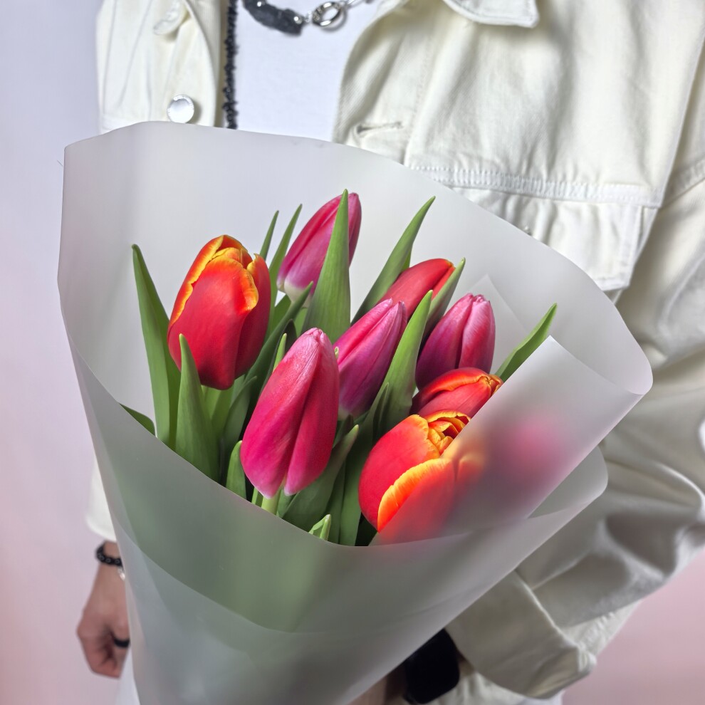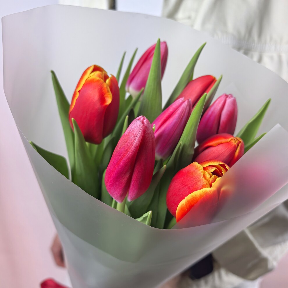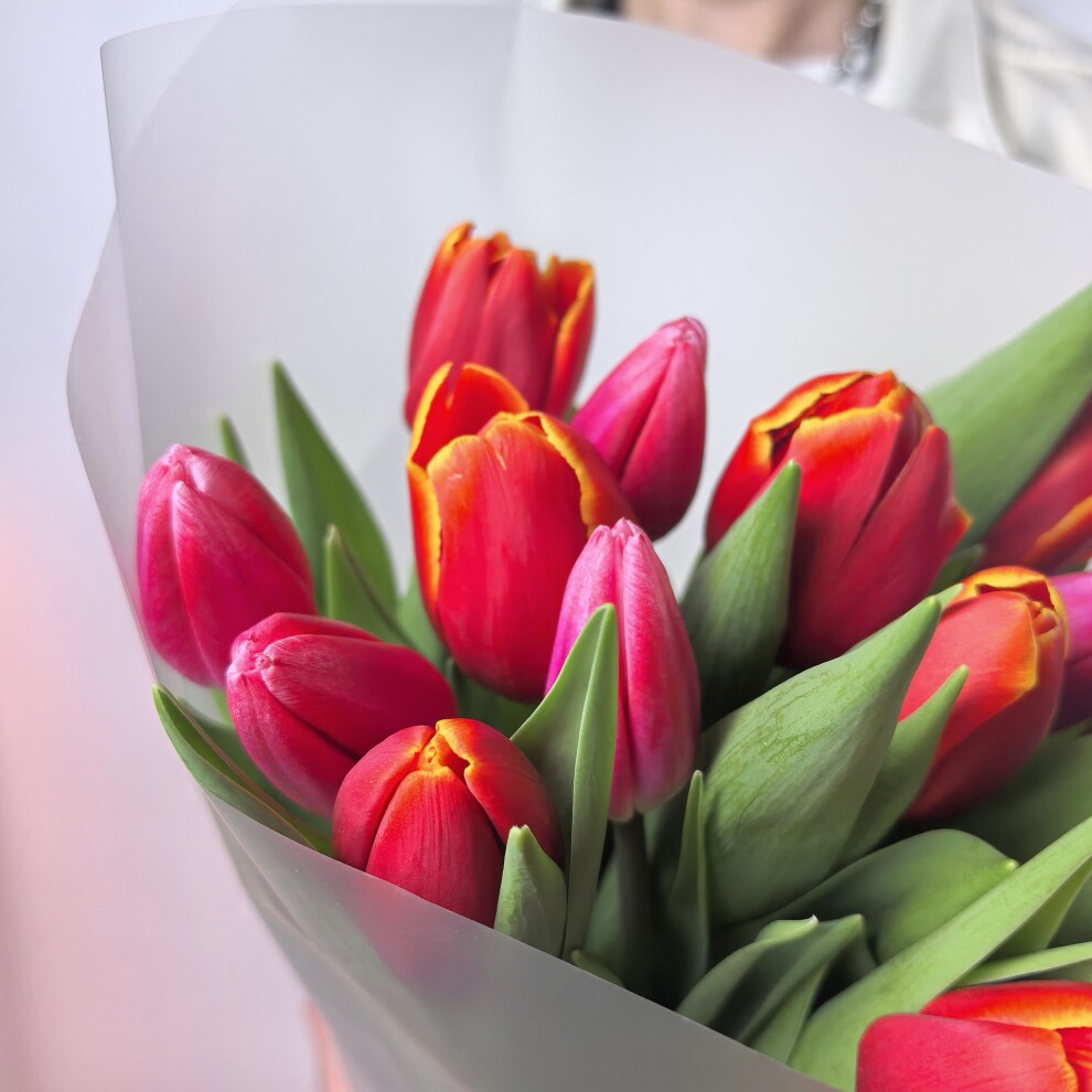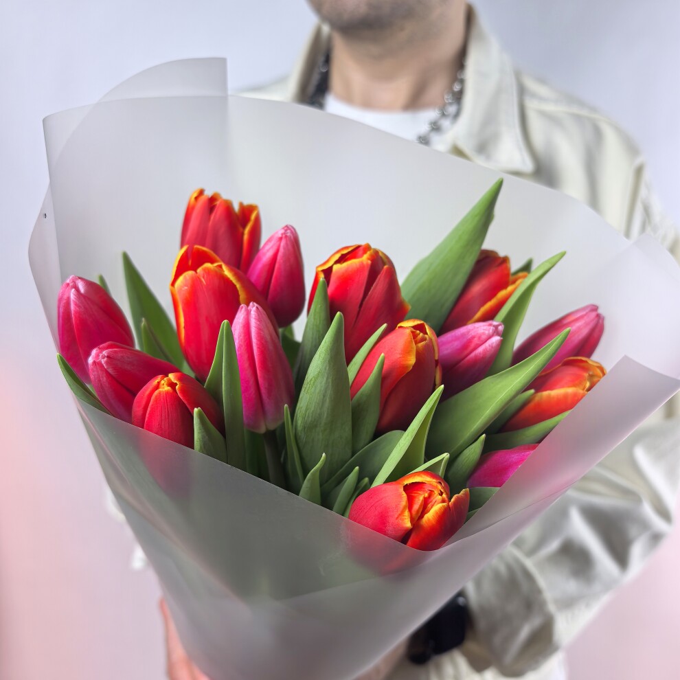 Этот величественный букет из 35 тюльпанов — истинное воплощение весенней роскоши и яркости! Композиция поражает насыщенностью оттенков: здесь гармонично сочетаются глубокие красные и нежно-розовые бутоны, а некоторые цветы украшены выразительными жёлто-оранжевыми переливами у основания лепестков. Такое сочетание создаёт эффектный, но при этом гармоничный контраст.