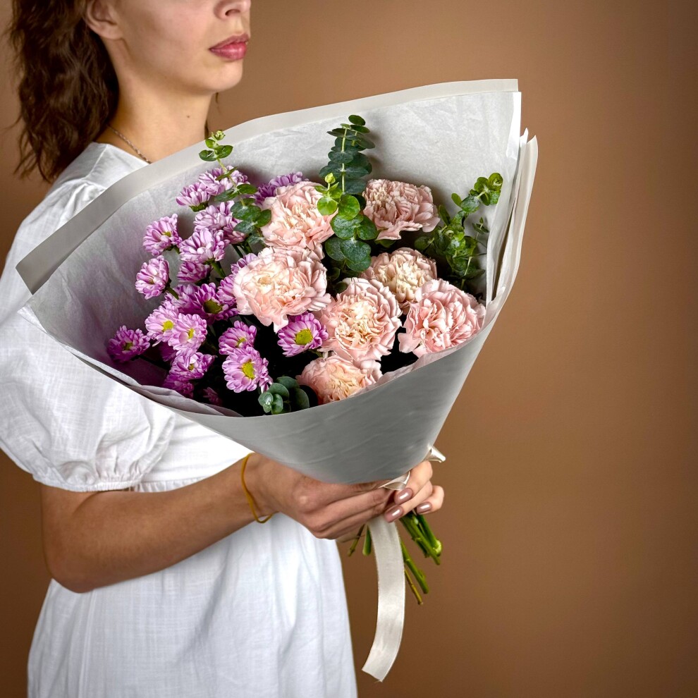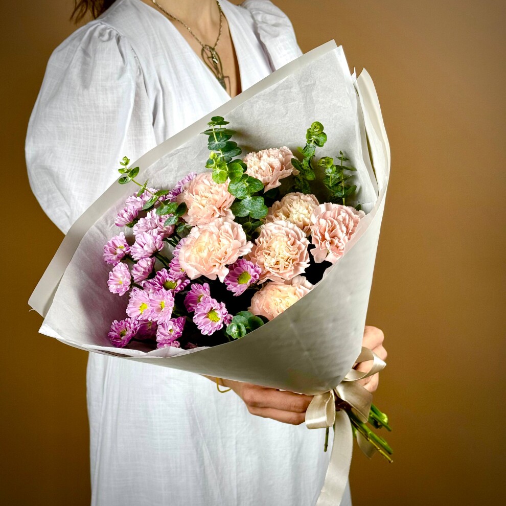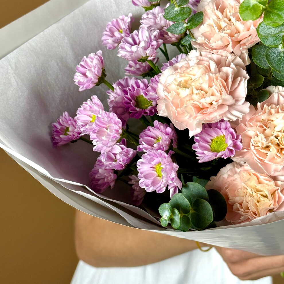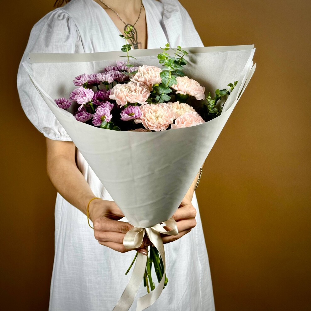 Этот букет — настоящее воплощение нежности и утончённости. В его составе гармонично сочетаются кустовые хризантемы и гвоздики, создавая изысканную композицию.
