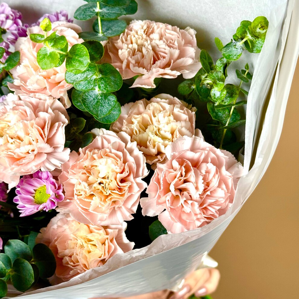 Гвоздики добавляют букету изысканности и глубины. Их мягкие пастельные тона подчёркивают нежность композиции.